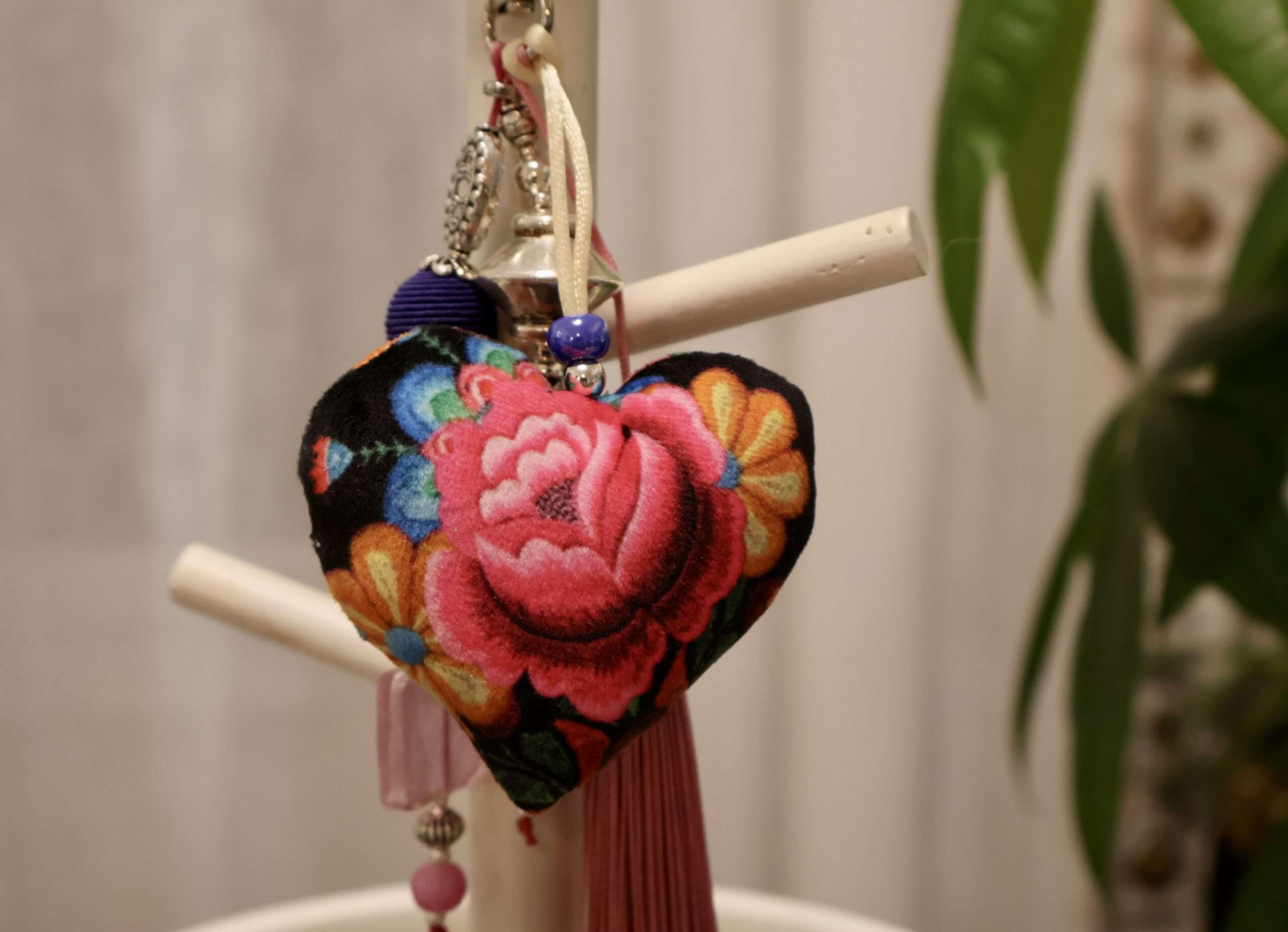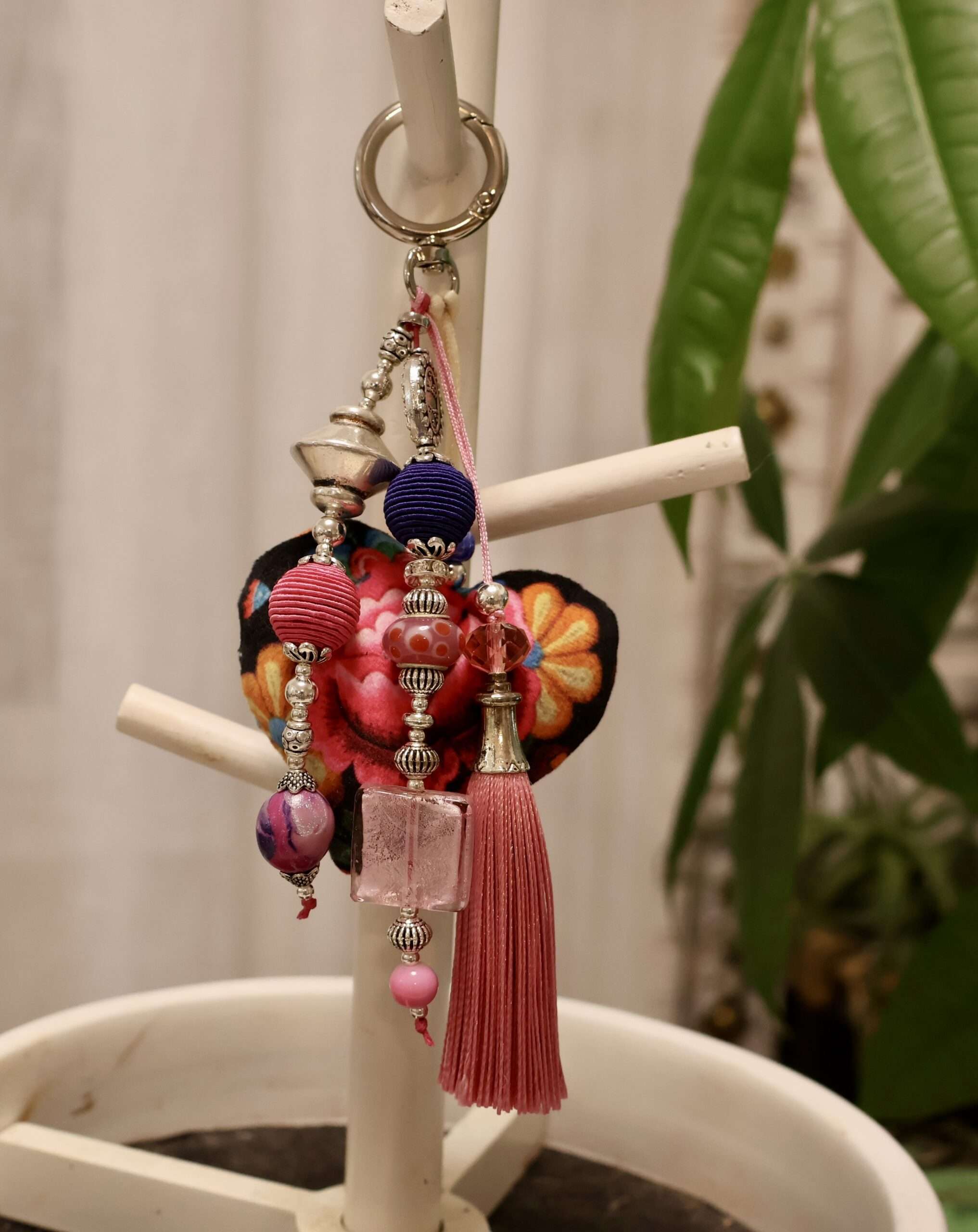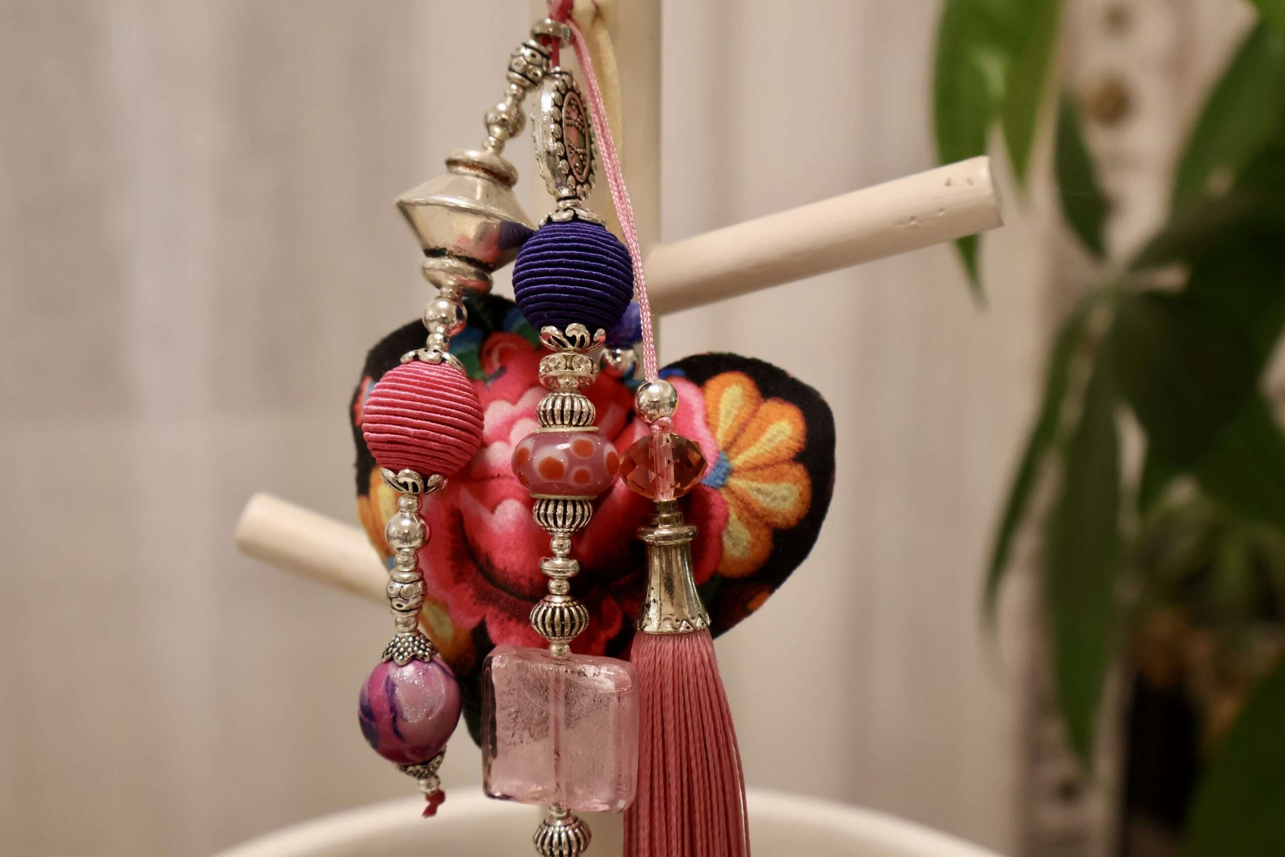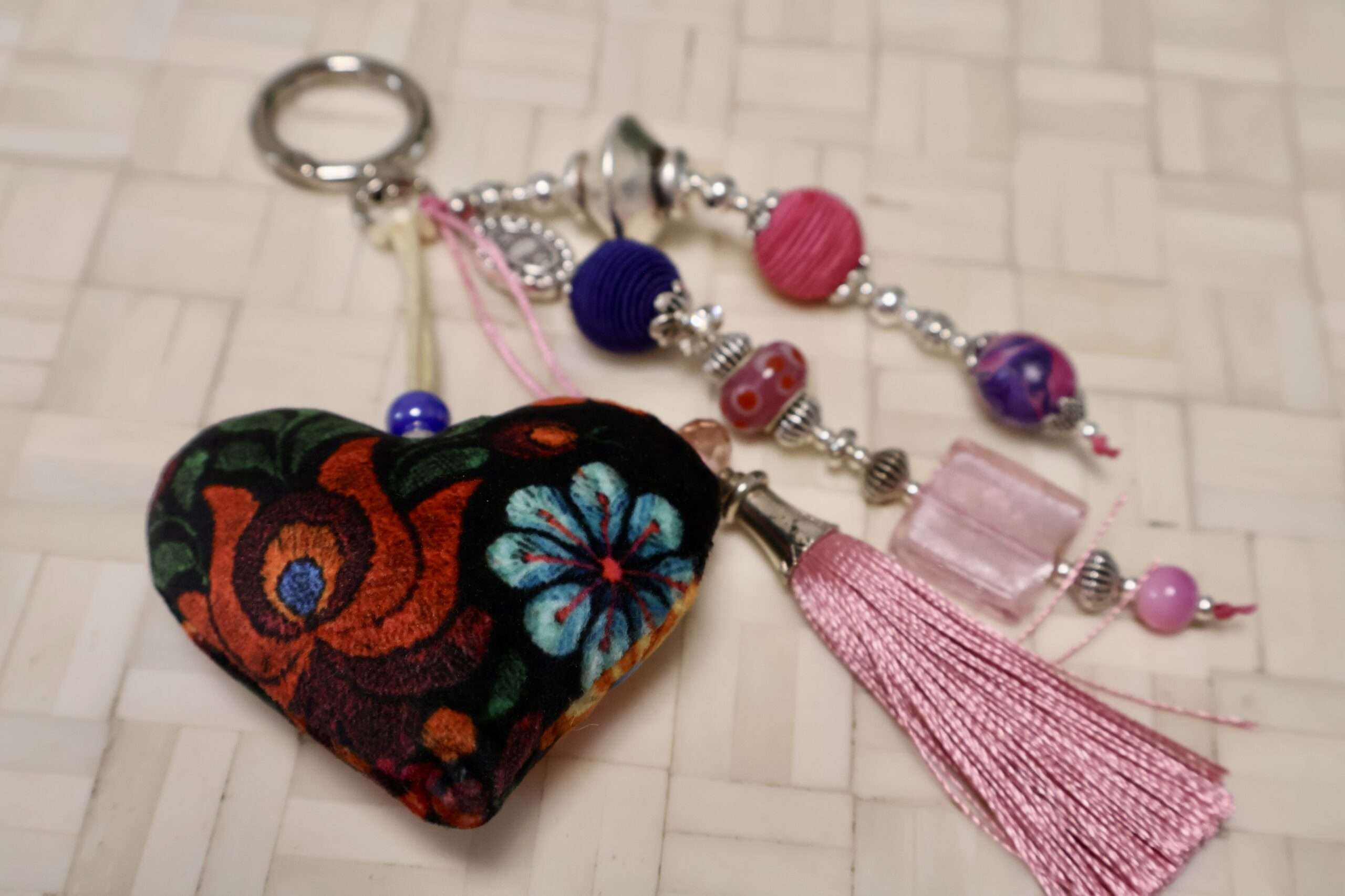 Bijou de sac, un joli coeur en velours avec une grande perle en verre rose et une perlé créée à l’Atelier, un superbe accessoire original pour sublimer un sac.