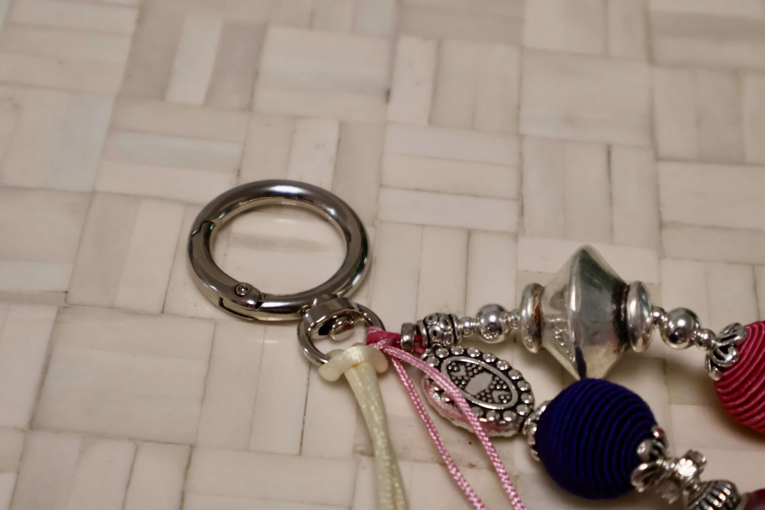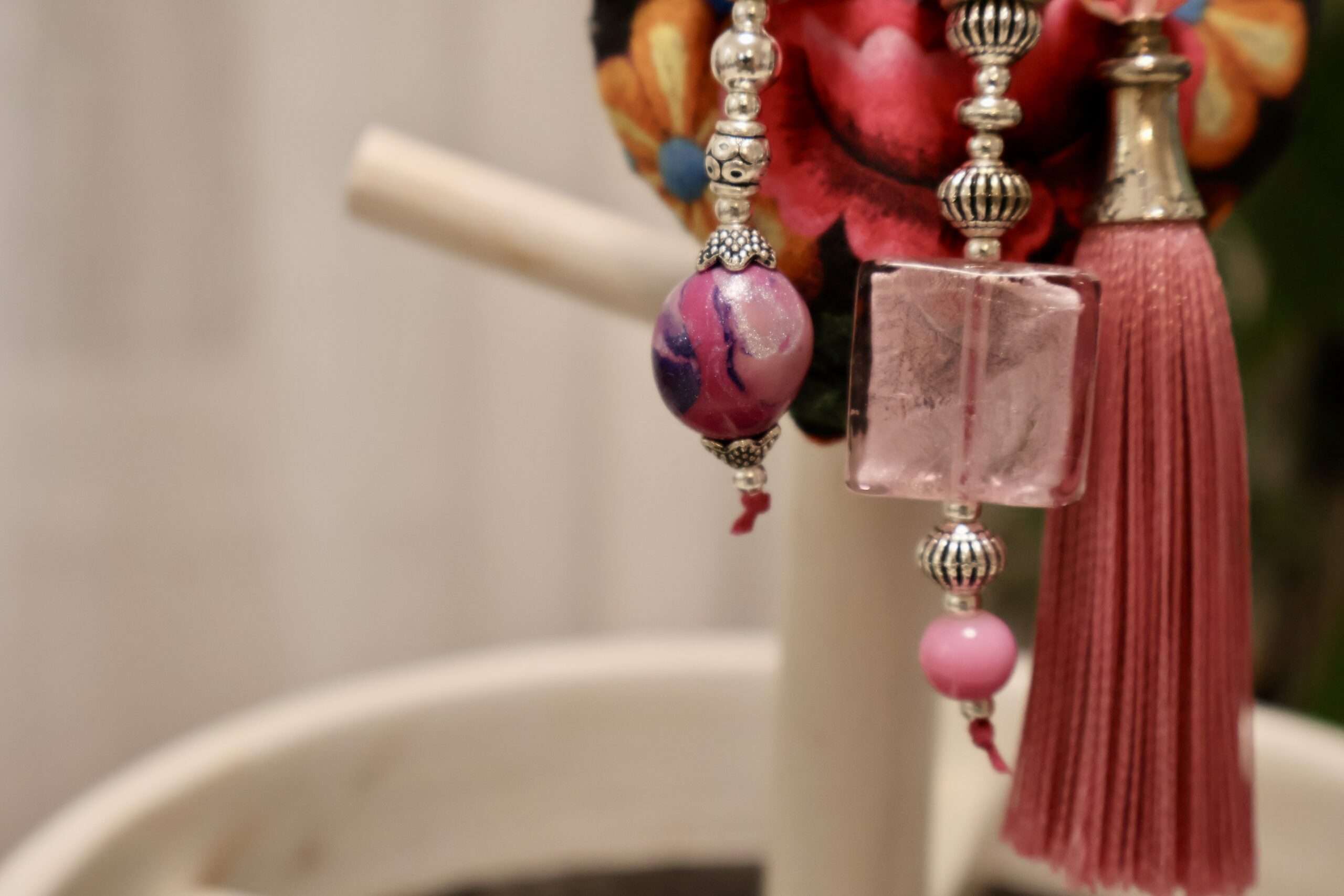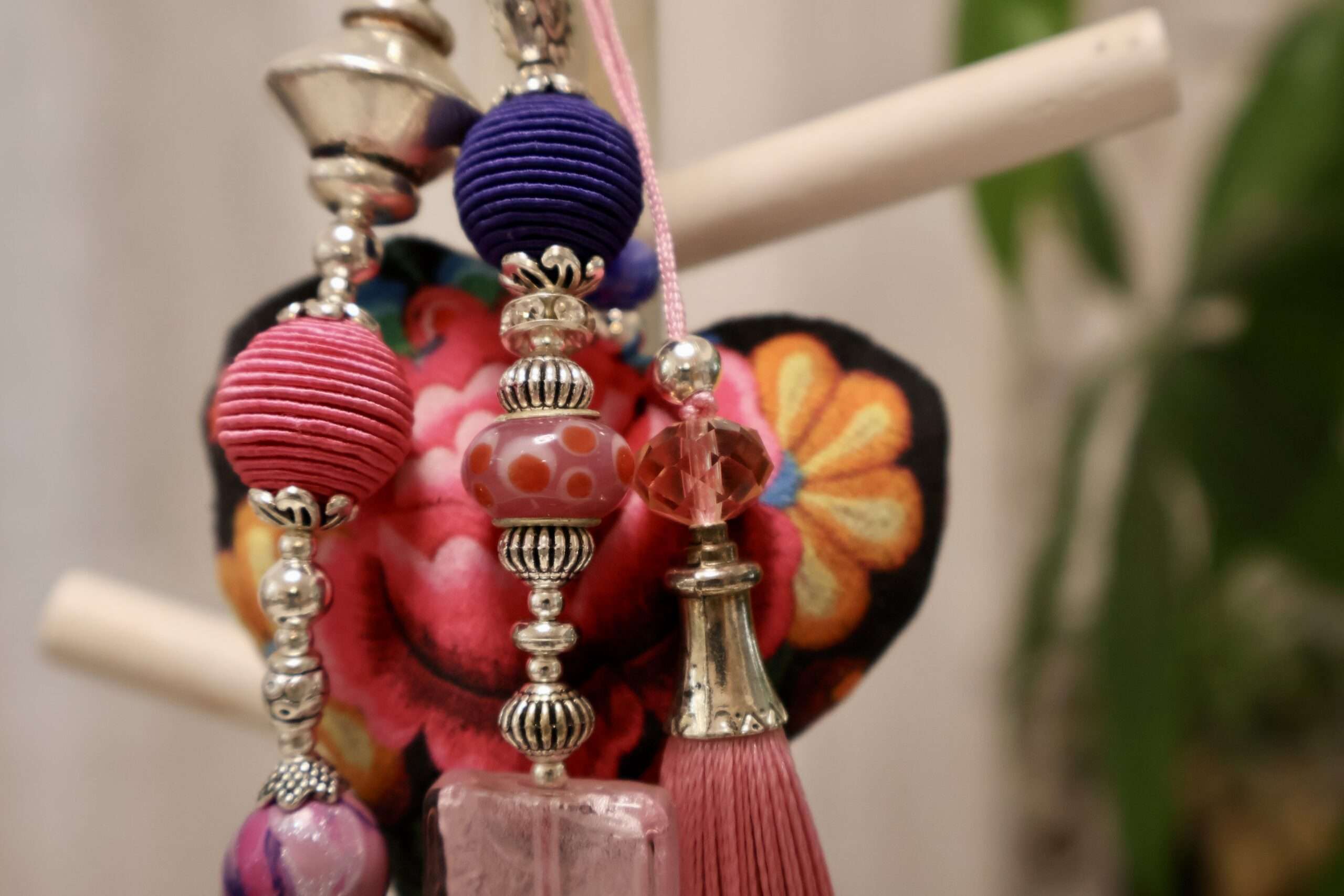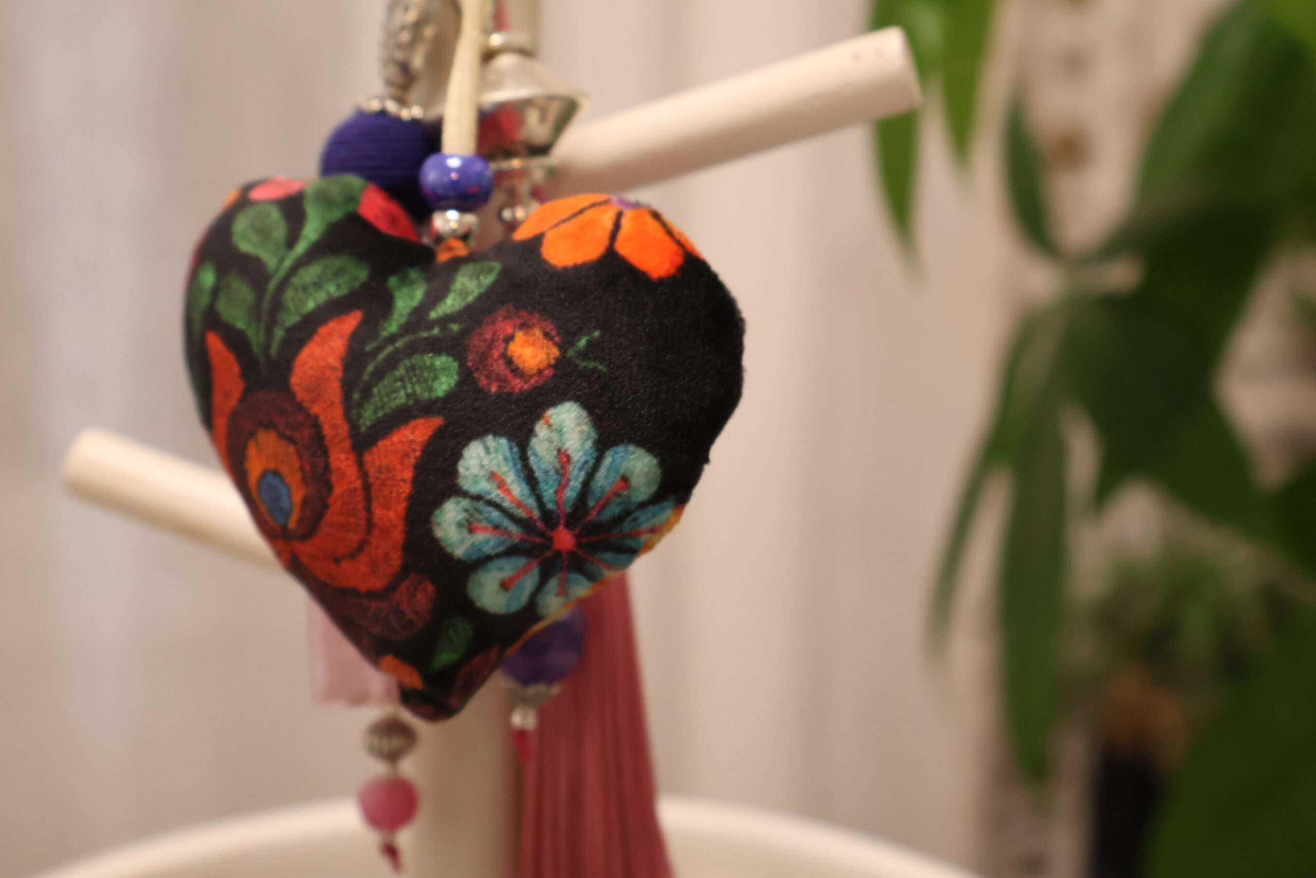 Bijou de sac, un joli coeur en velours avec une grande perle en verre rose et une perlé créée à l’Atelier, un superbe accessoire original pour sublimer un sac.