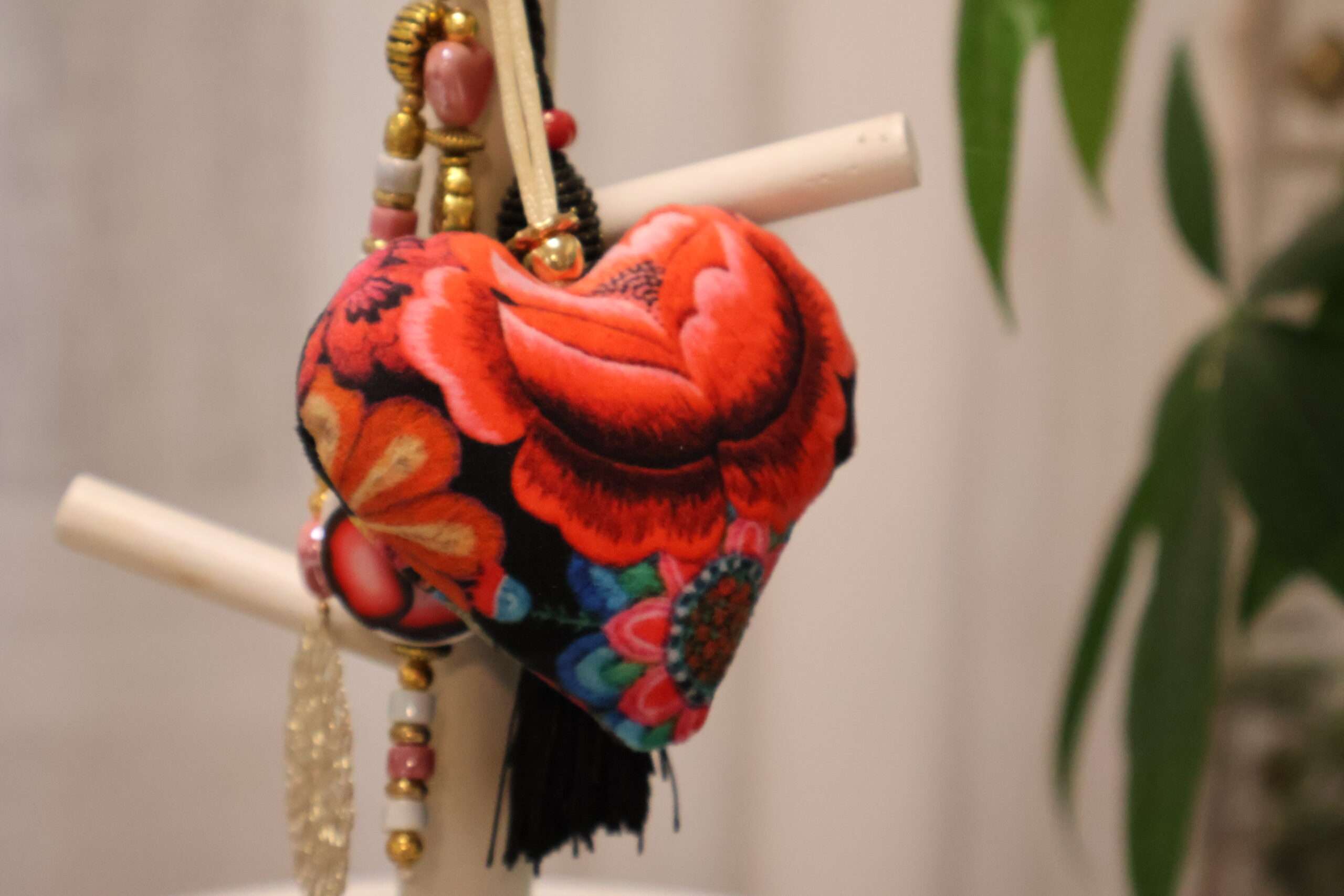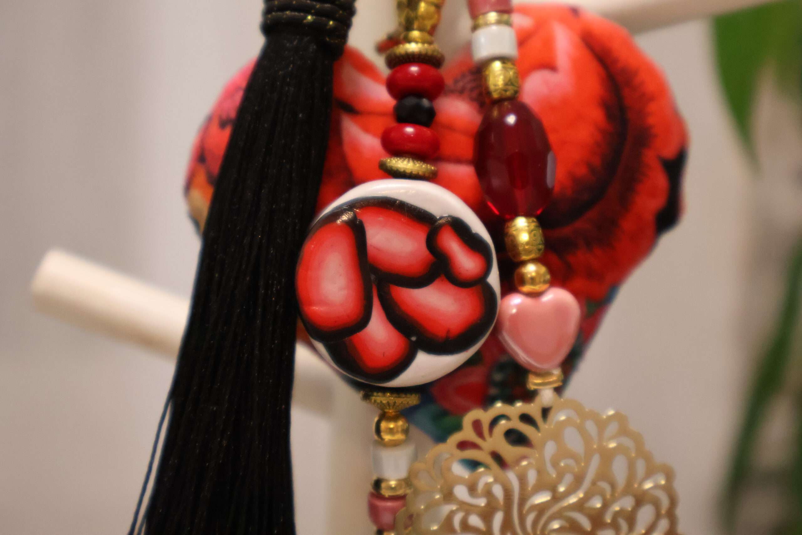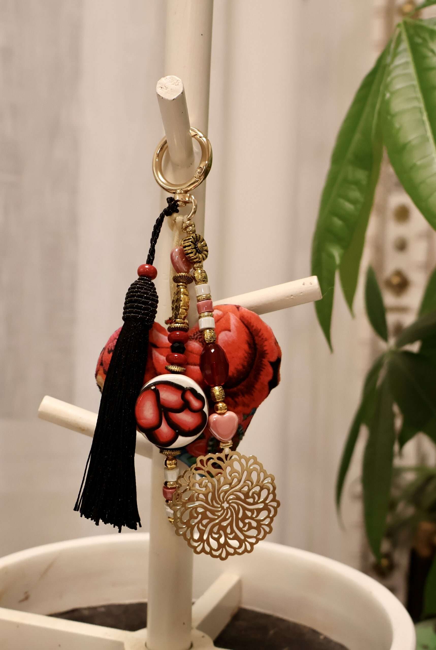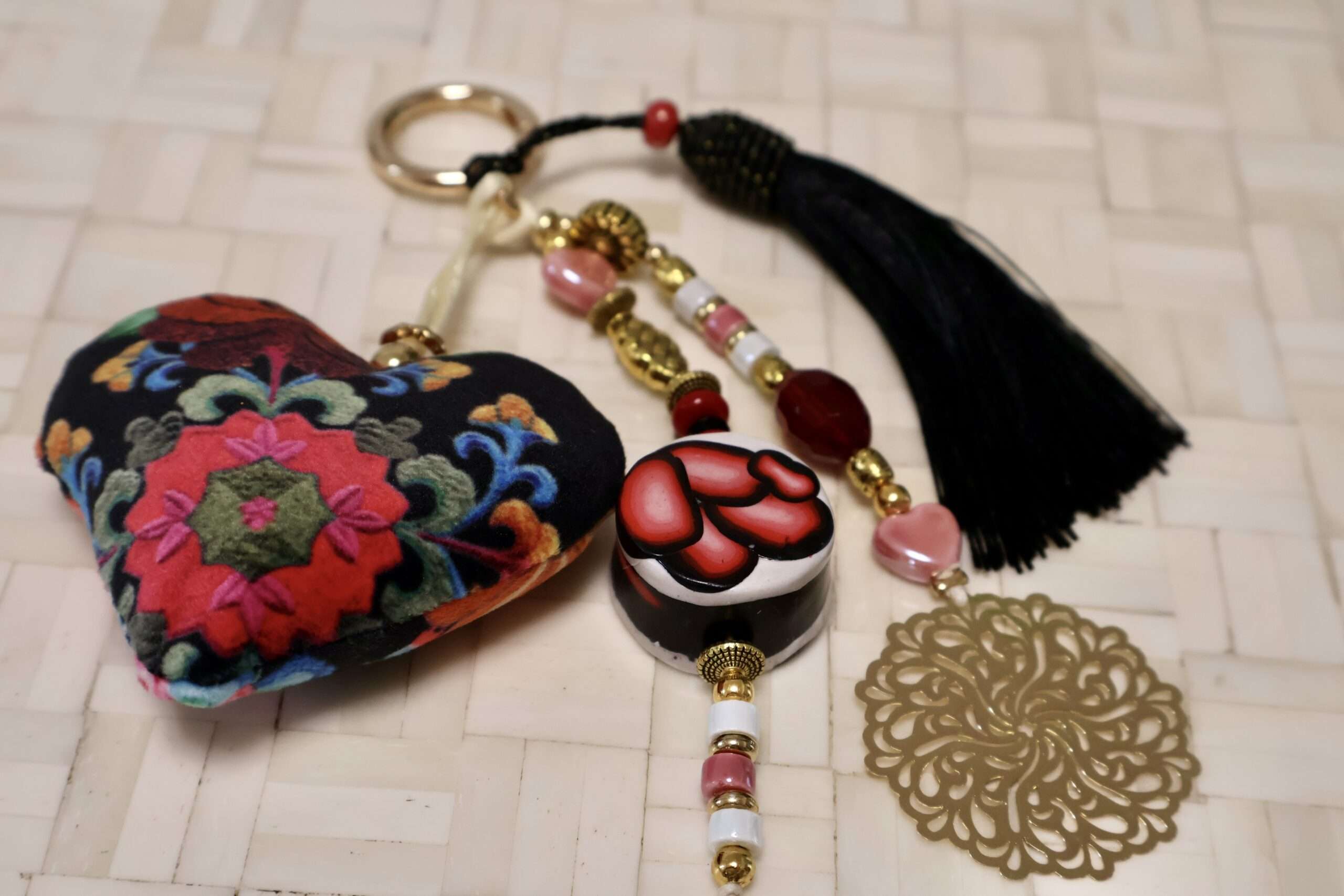 Bijou de sac, un joli coeur en velours avec une grande perle créée à l’Atelier, et un grand pendentif ciselé doré, un superbe accessoire original pour sublimer un sac.