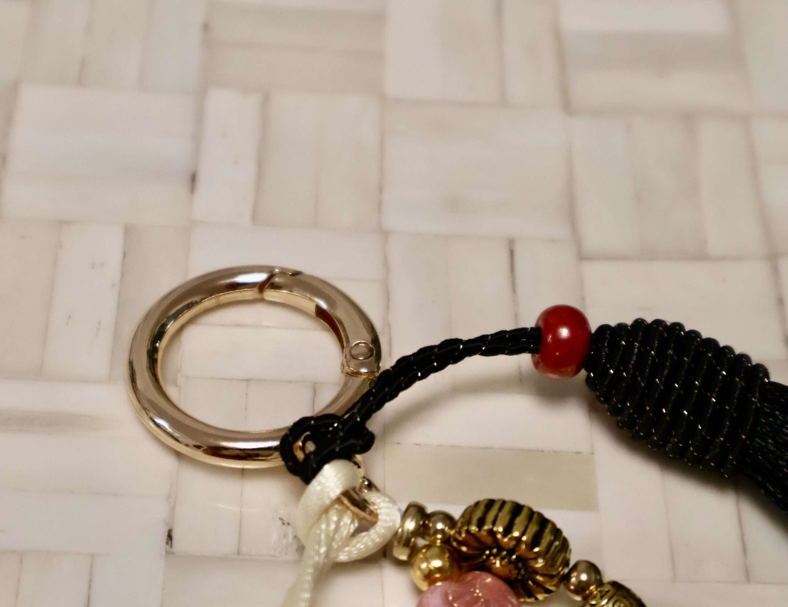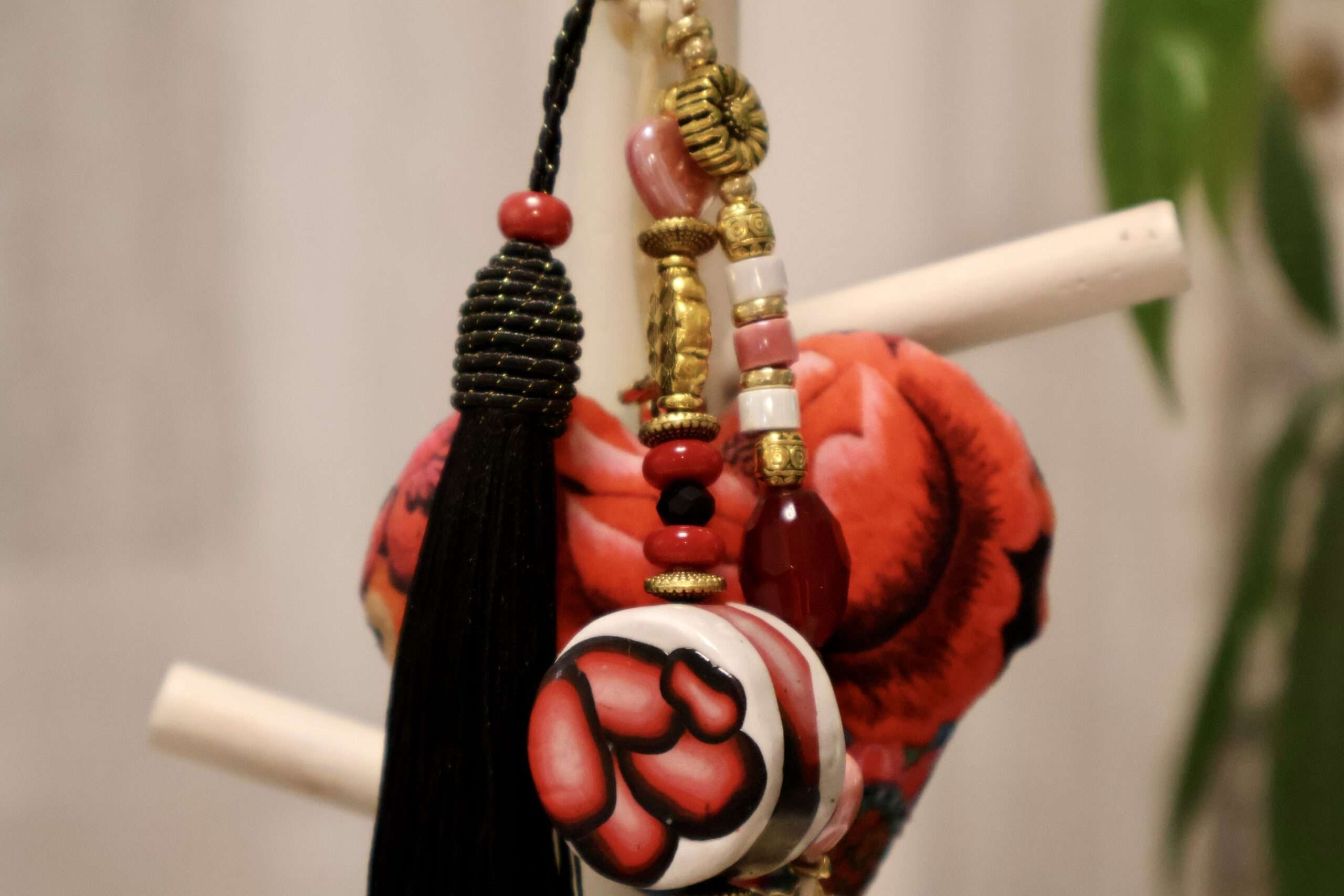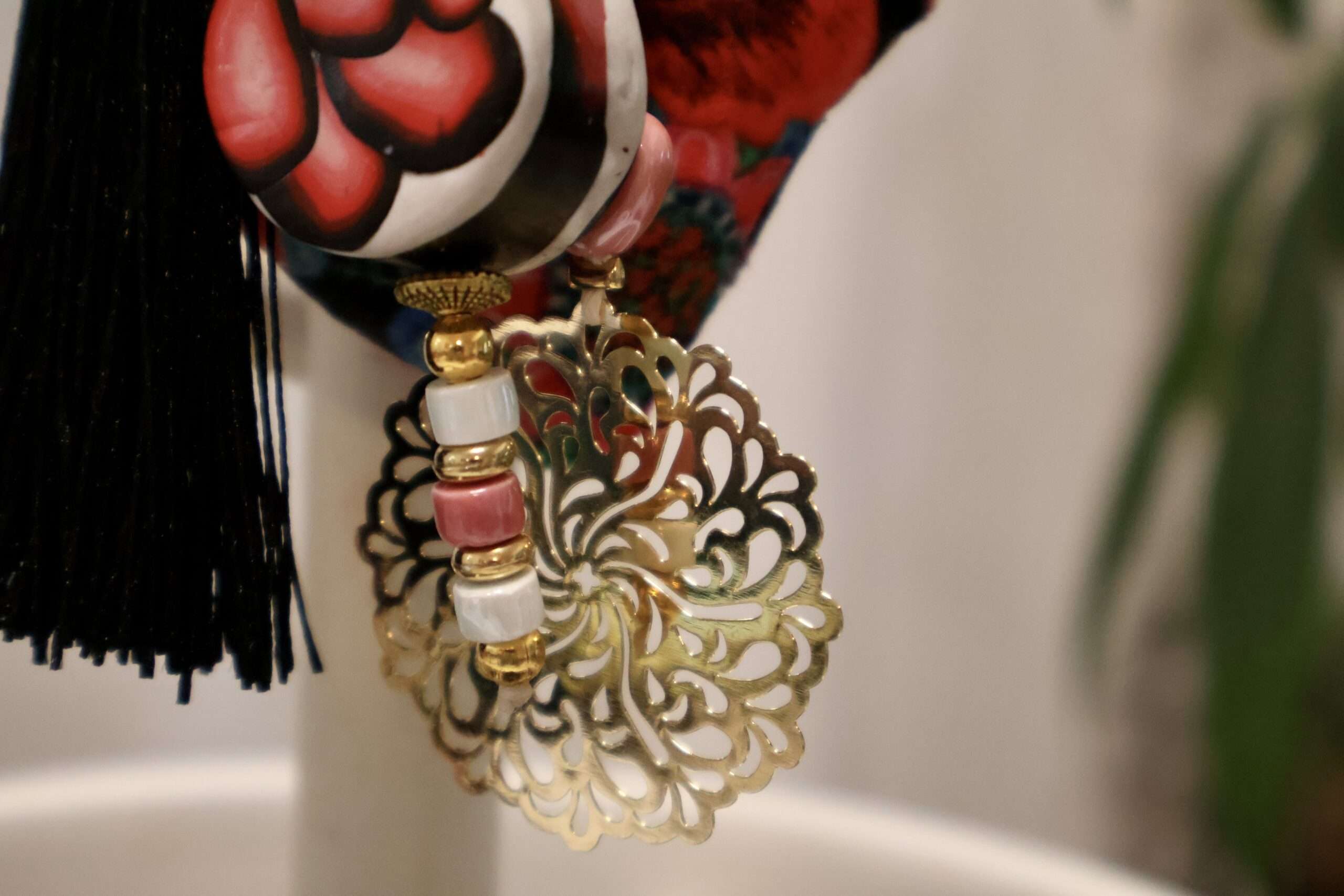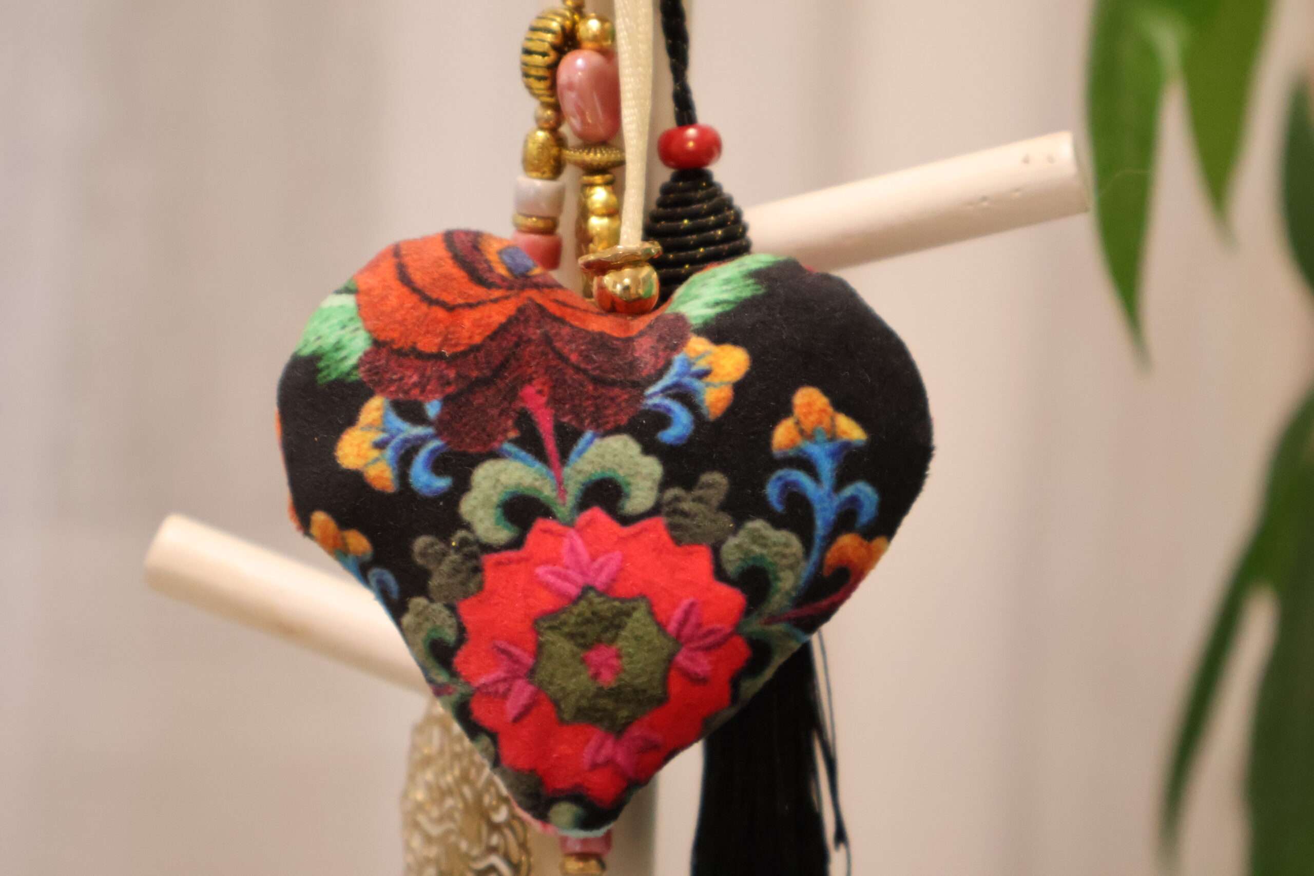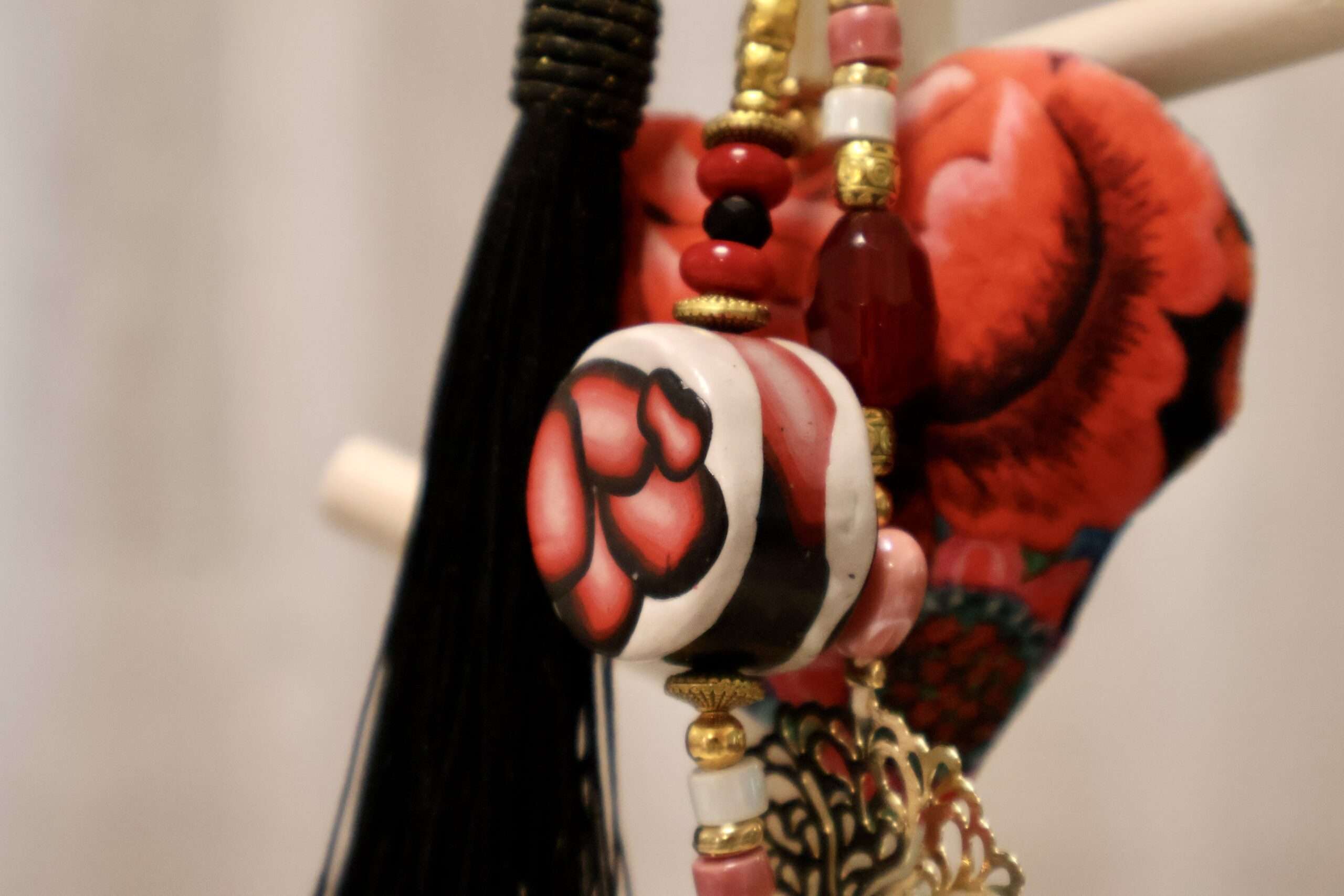 Bijou de sac, un joli coeur en velours avec une grande perle créée à l’Atelier, et un grand pendentif ciselé doré, un superbe accessoire original pour sublimer un sac.