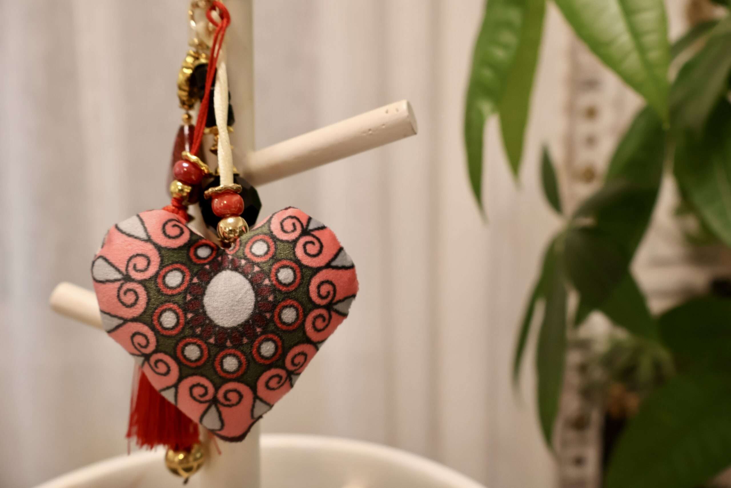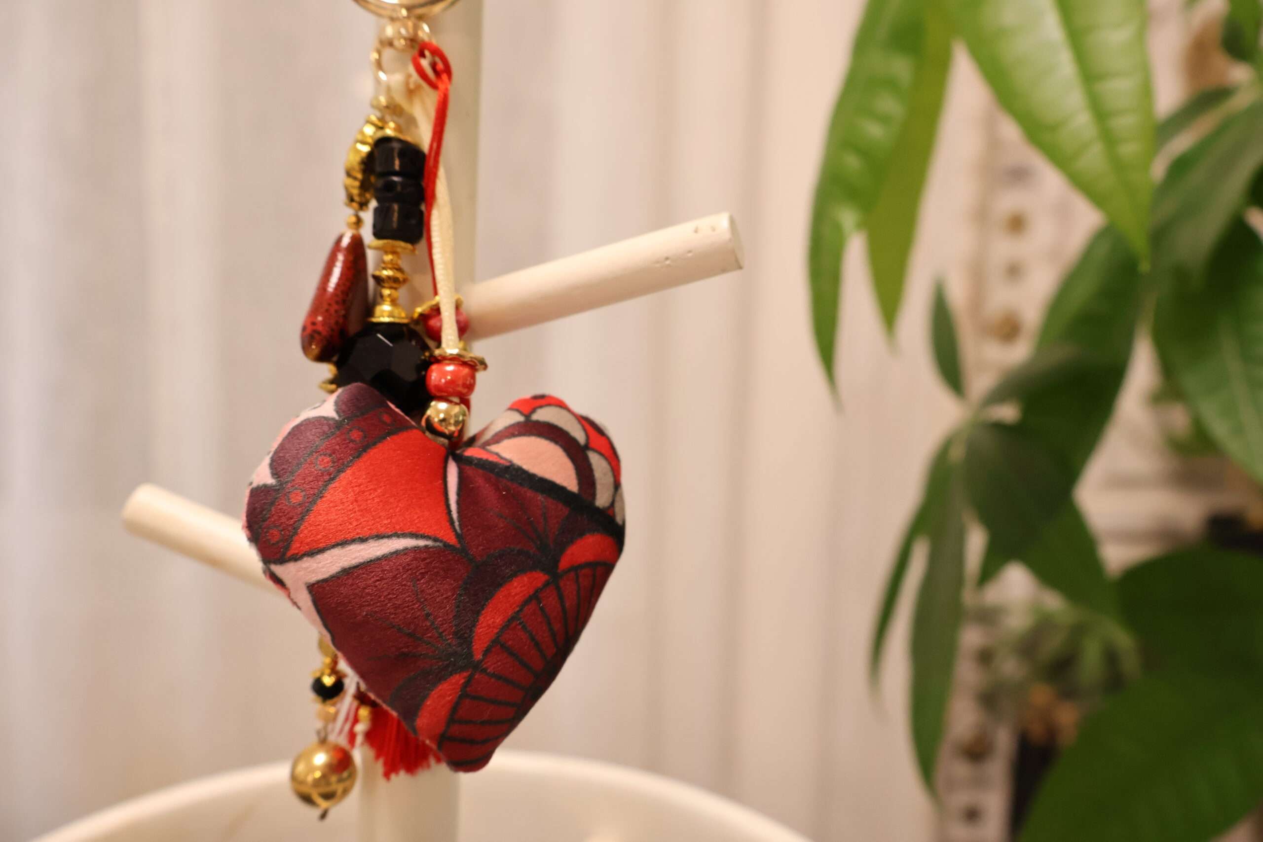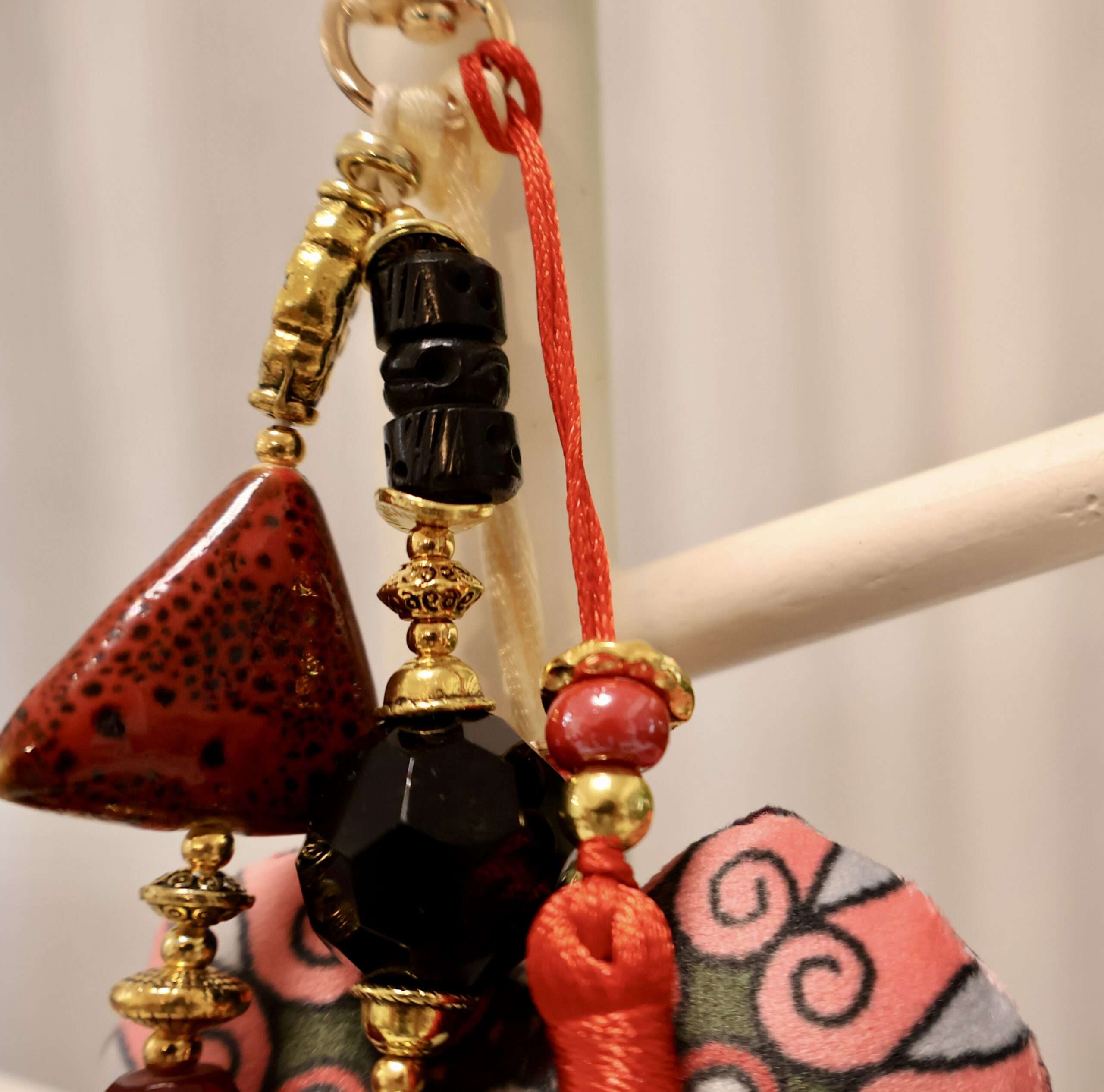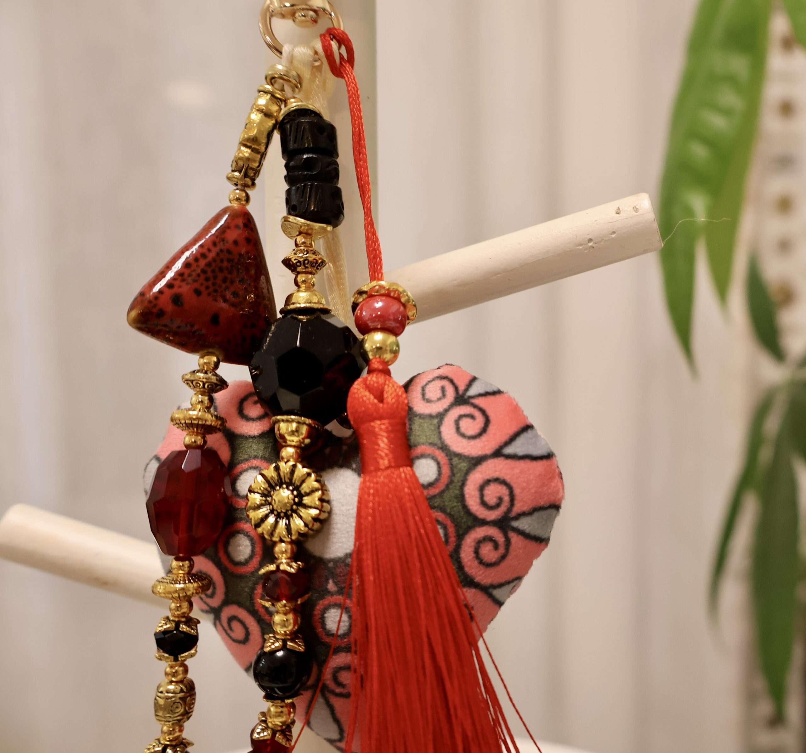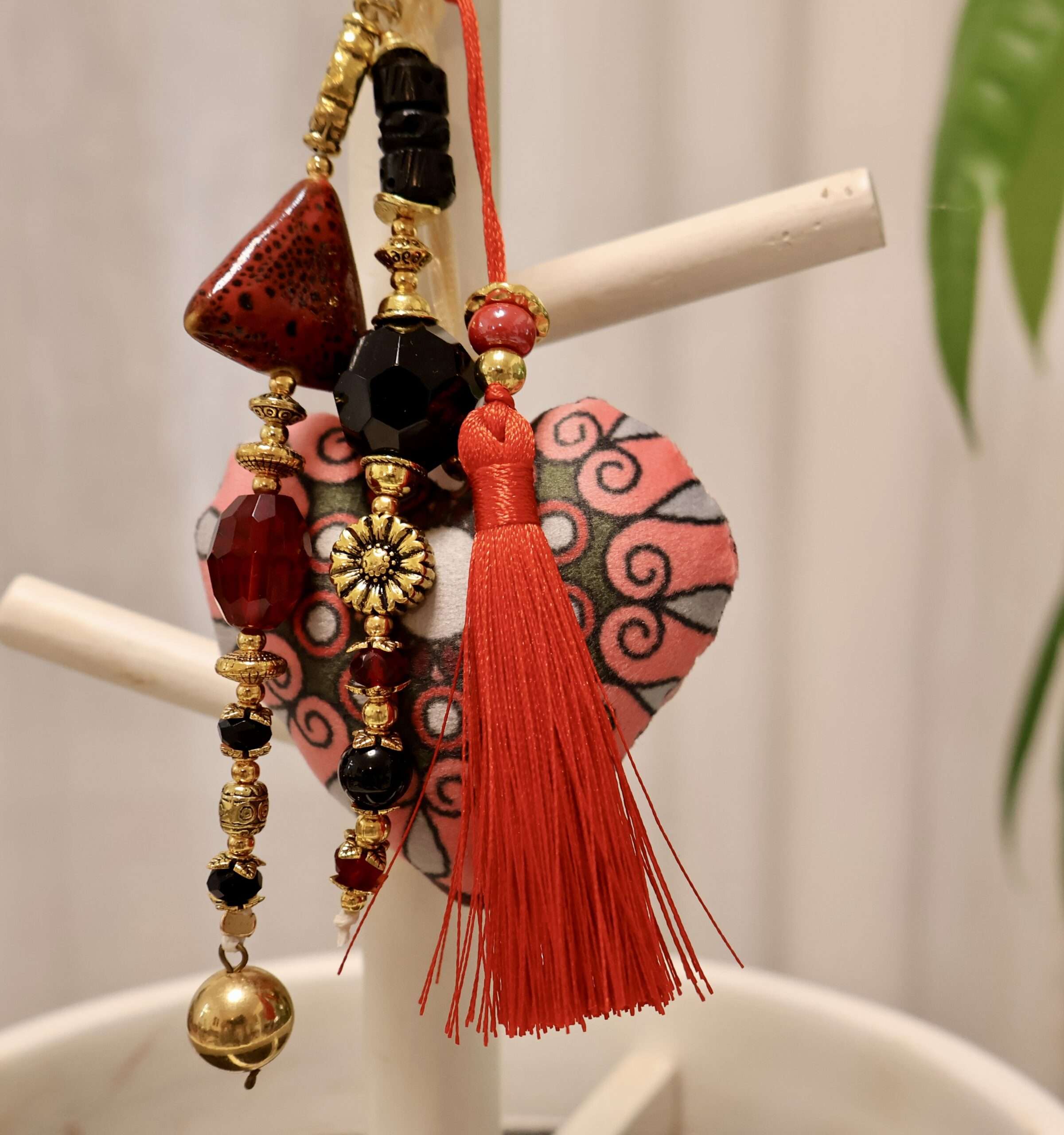 Un bijou pour donner du pep’s à votre sac ou vos grandes trousses. A accrocher à une fermeture éclair ou un anneau. Il peut également servir de porte-clés. Composition unique d’un coeur en velours aux motifs de Mandalas en rouge et noir fait à l’Atelier, de pompon et selon le modèle, de diverses perles coordonnées, de verre, pierres naturelles, porcelaine, bois, céramique, métal … Une grande perle de triangulaire céramique, des perles facettées en verre et une jolie perle ciselée en bois noir font l’originalité de ce modèle. Un superbe petit « plus » haut en couleur pour sublimer vos sacs ou vos accessoires. Ce modèle est en métal doré. Hauteur environ 15 cms. Pièce Unique, Fabrication artisanale du bijou.