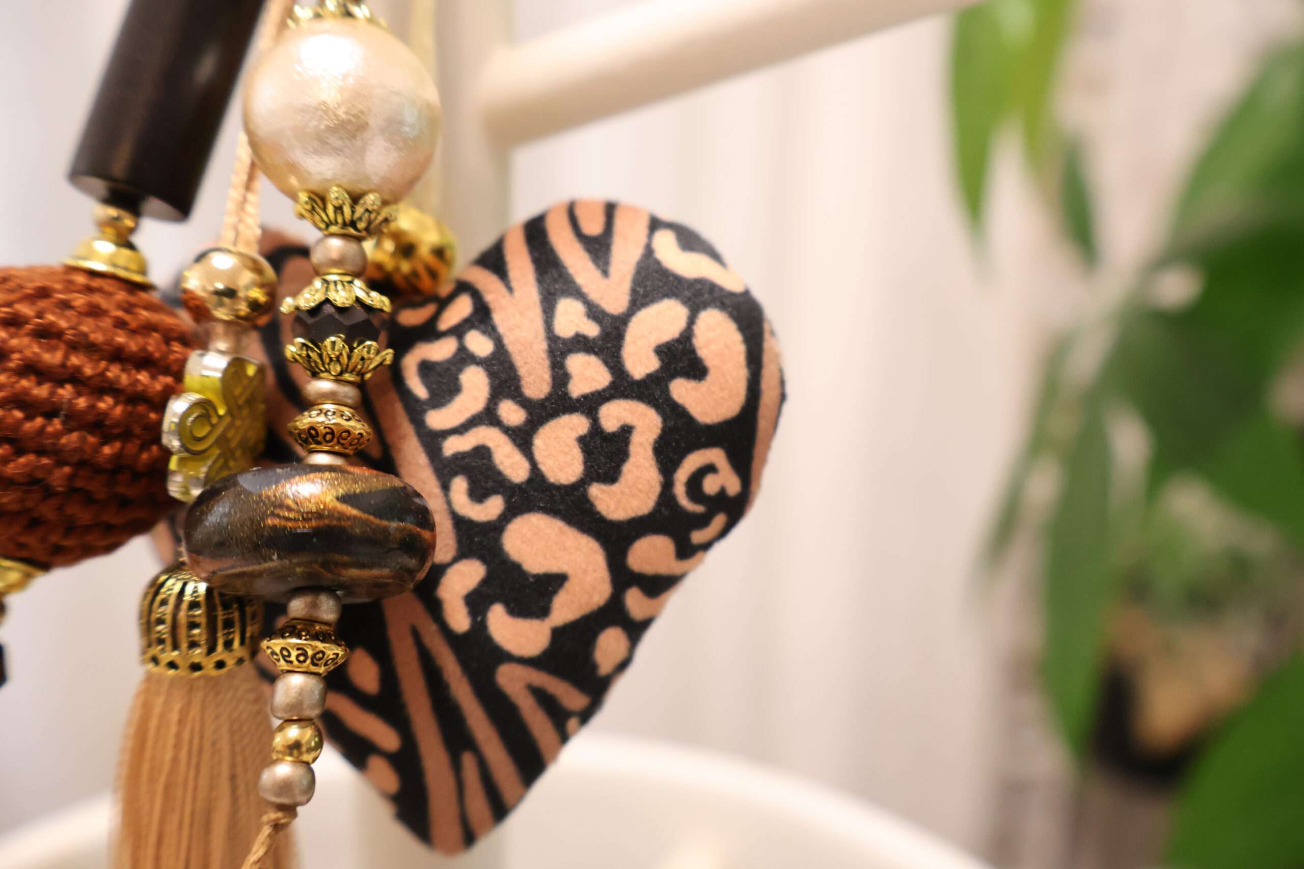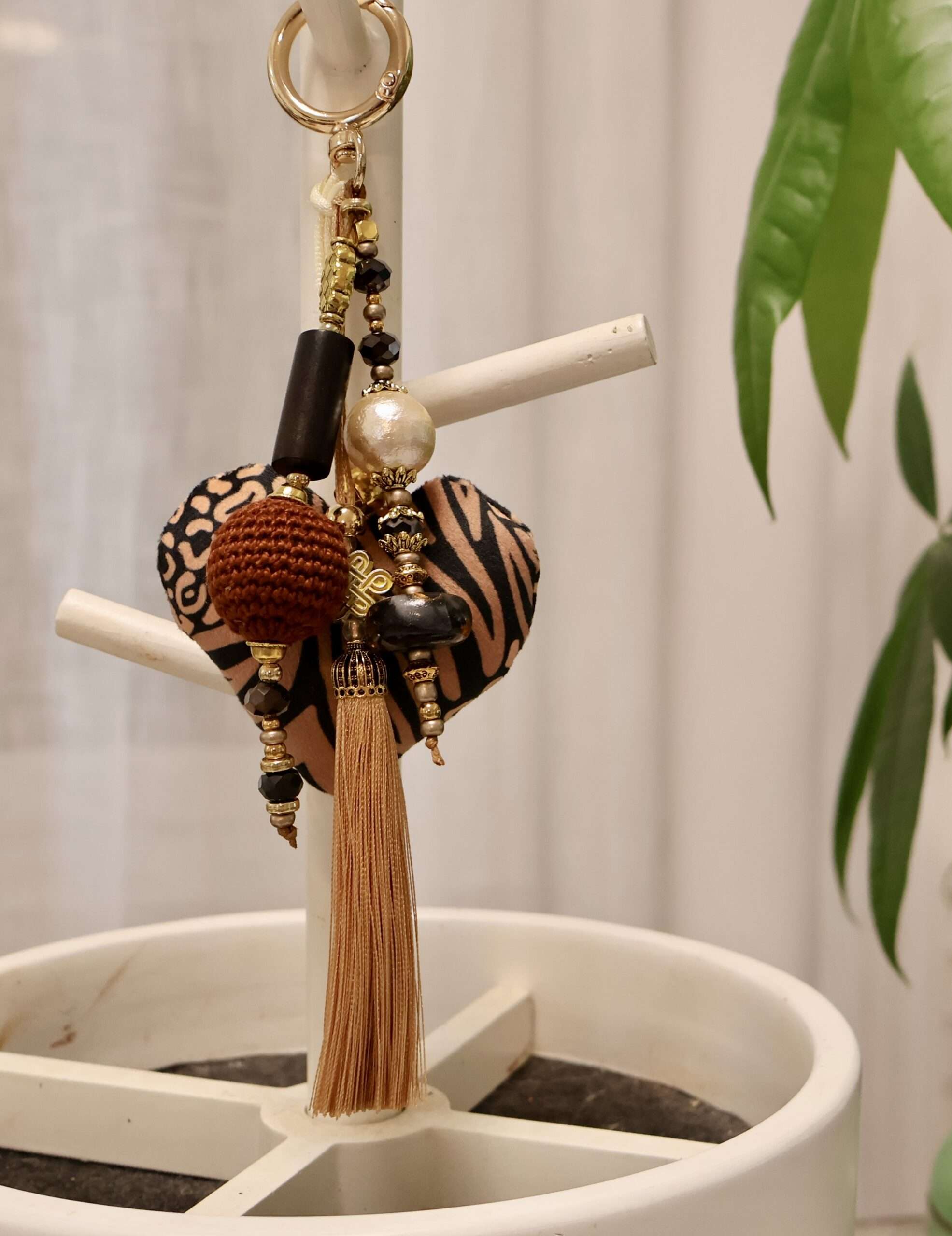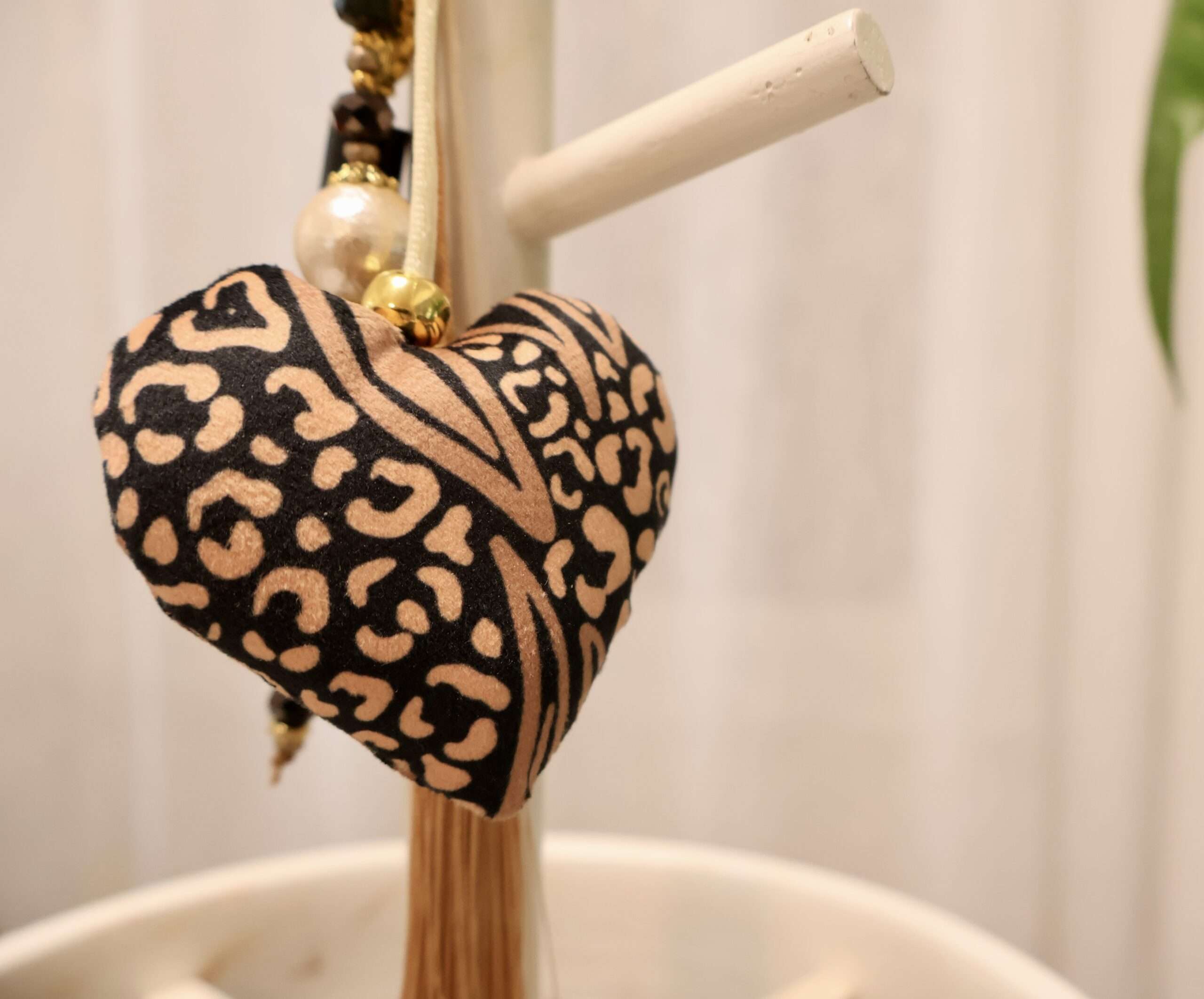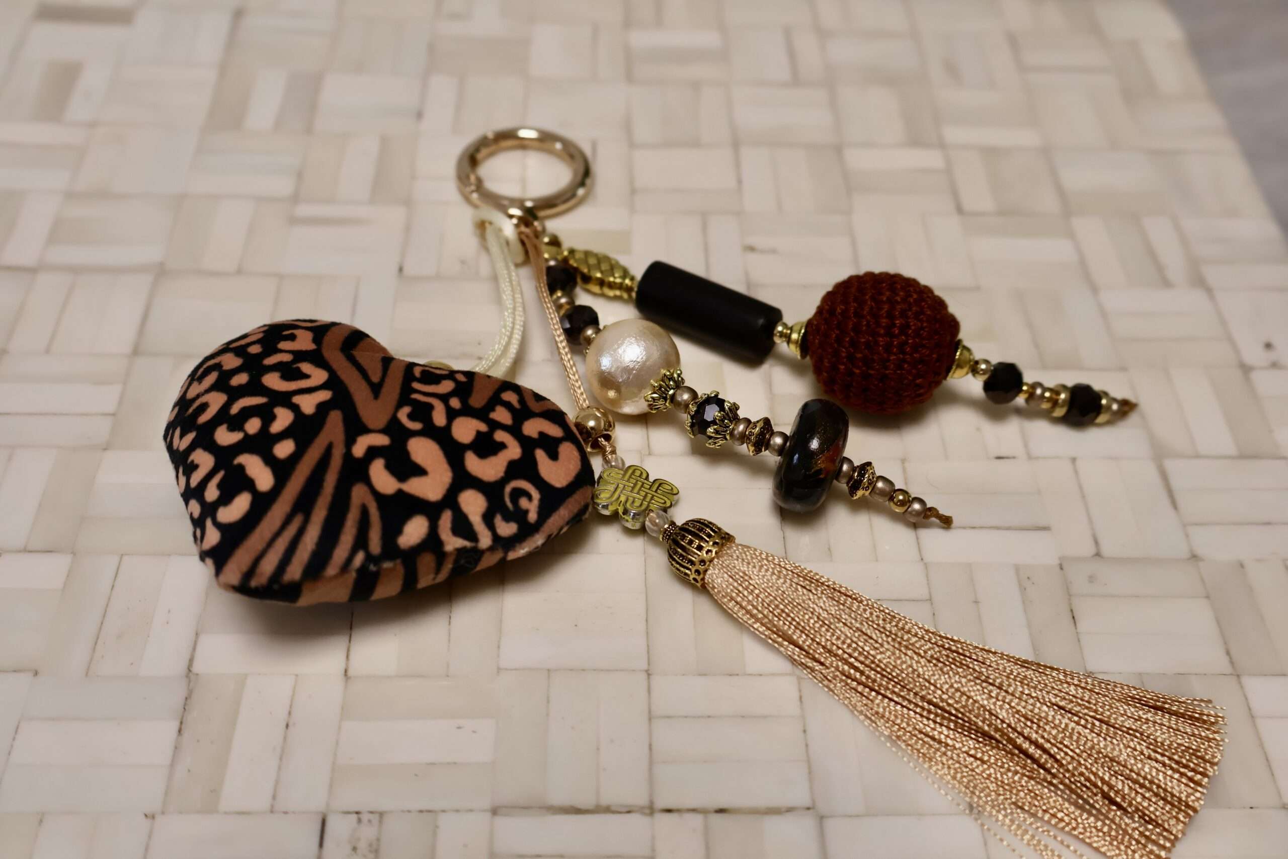 Bijou de sac, un joli coeur en velours avec des perles en coton et une perle créée à l’Atelier, en métal doré, un superbe accessoire original pour sublimer un sac.
