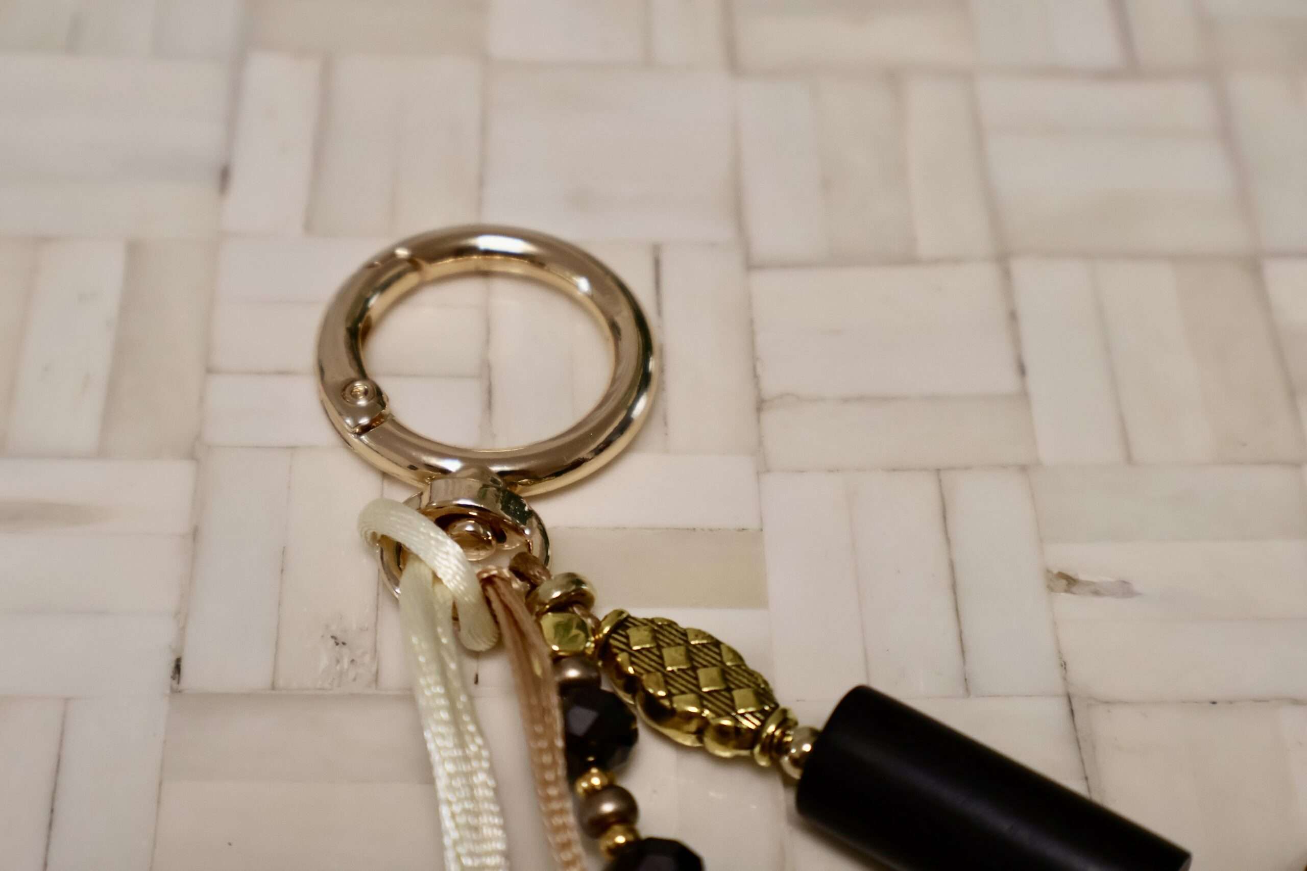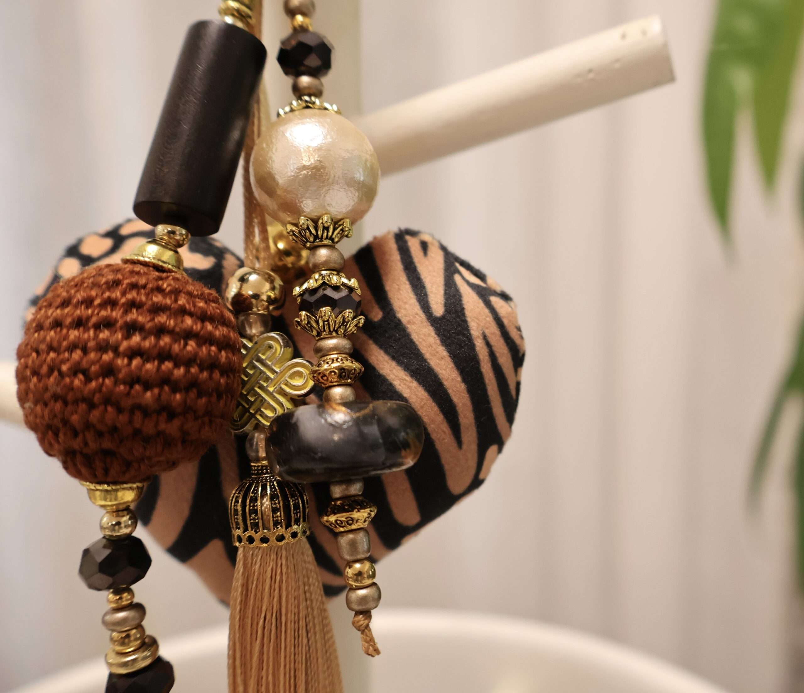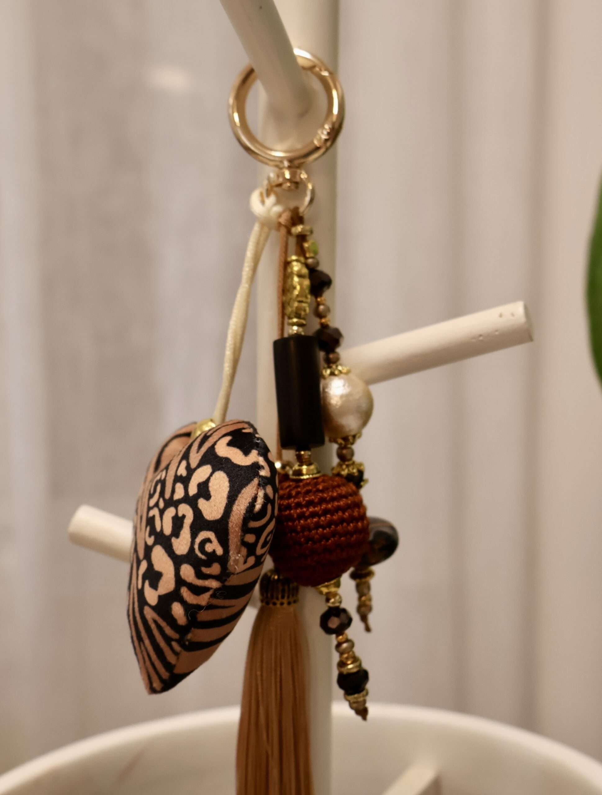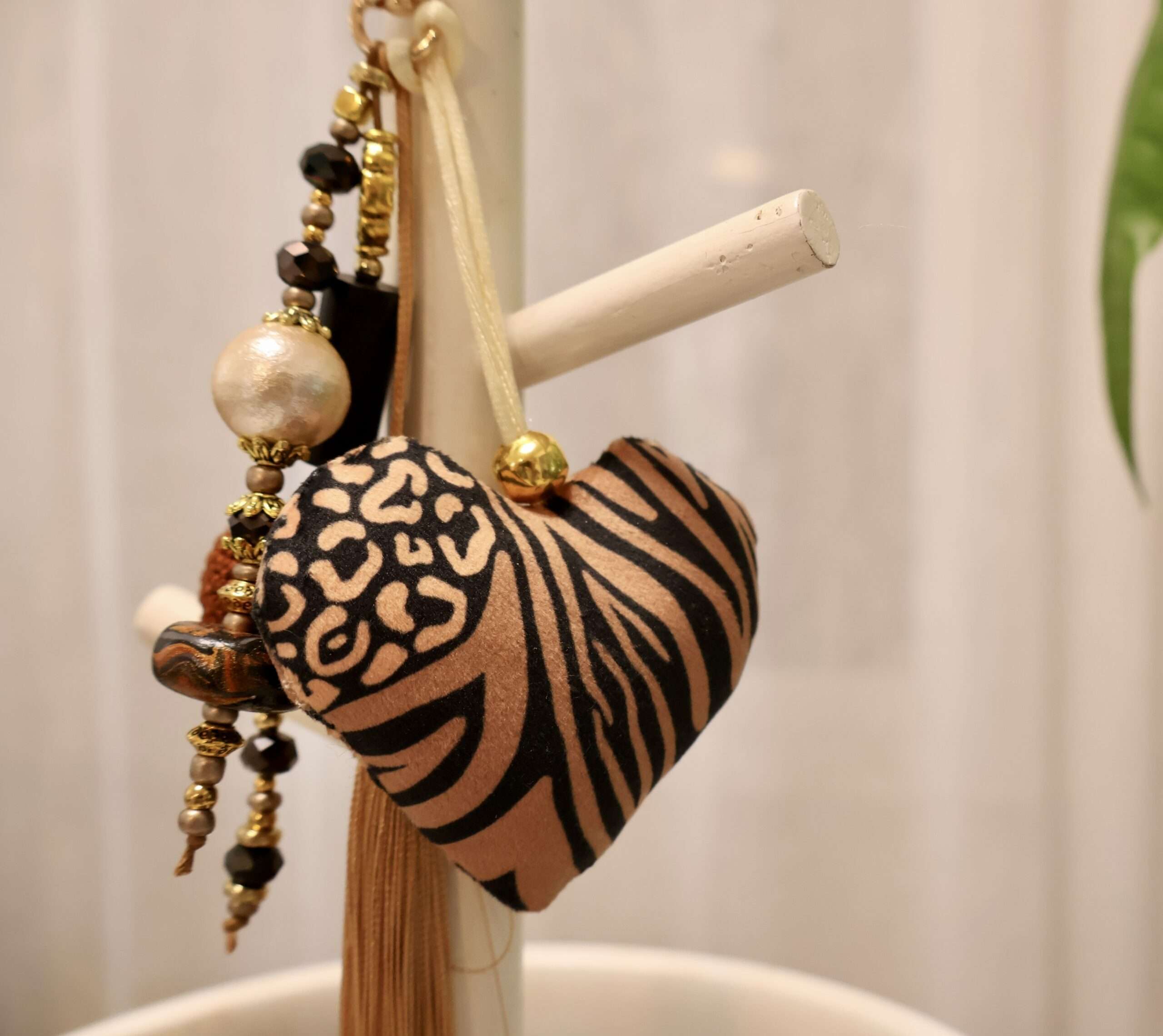 Bijou de sac, un joli coeur en velours avec des perles en coton et une perle créée à l’Atelier, en métal doré, un superbe accessoire original pour sublimer un sac.