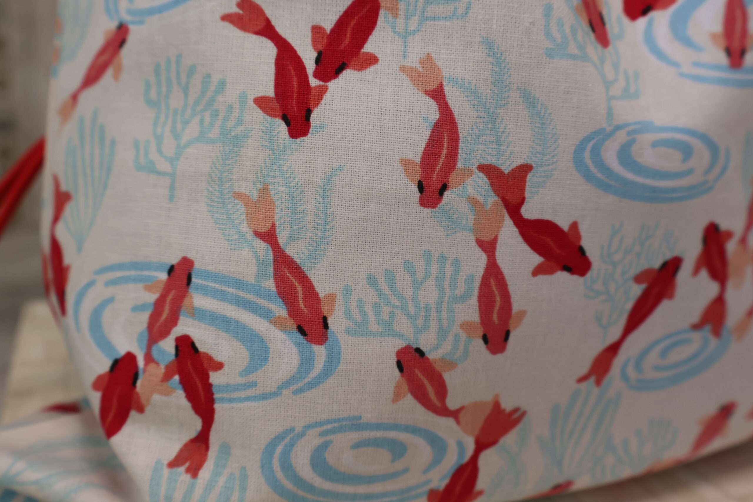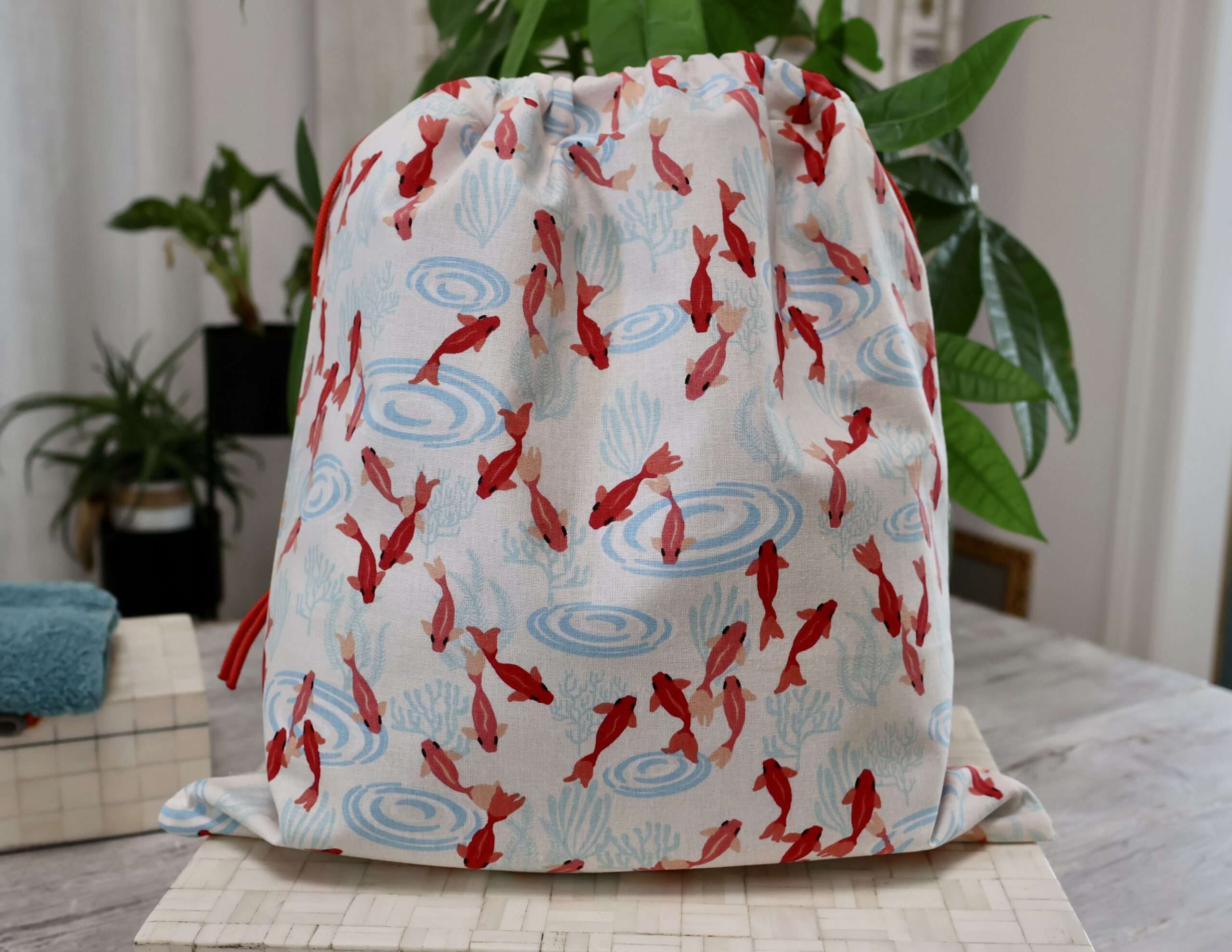 Un accessoire éco-responsable qui remplace les sacs en plastique, pour nos sorties PPP: à la Piscine, à la Plage, en Pique-nique etc … Un grand pochon en coton imprimé à l’extérieur, doublé à l’intérieur d’un coton enduit waterproof. Un cordon en nylon permet de le fermer solidement. Ses belles dimensions H x L 32,5 cms x 32,5 cms, permettent d’y transporter ses affaires de piscine ou de plage et même son pique-nique. La doublure intérieure est lessivable, plus de crainte de fuite de produits ou de banane écrasée au fond du sac – pratique également pour y mettre son maillot de bain et ses claquettes mouillés! Un joli accessoire éco-responsable qui simplifie les sorties. Fabrication artisanale à la Française