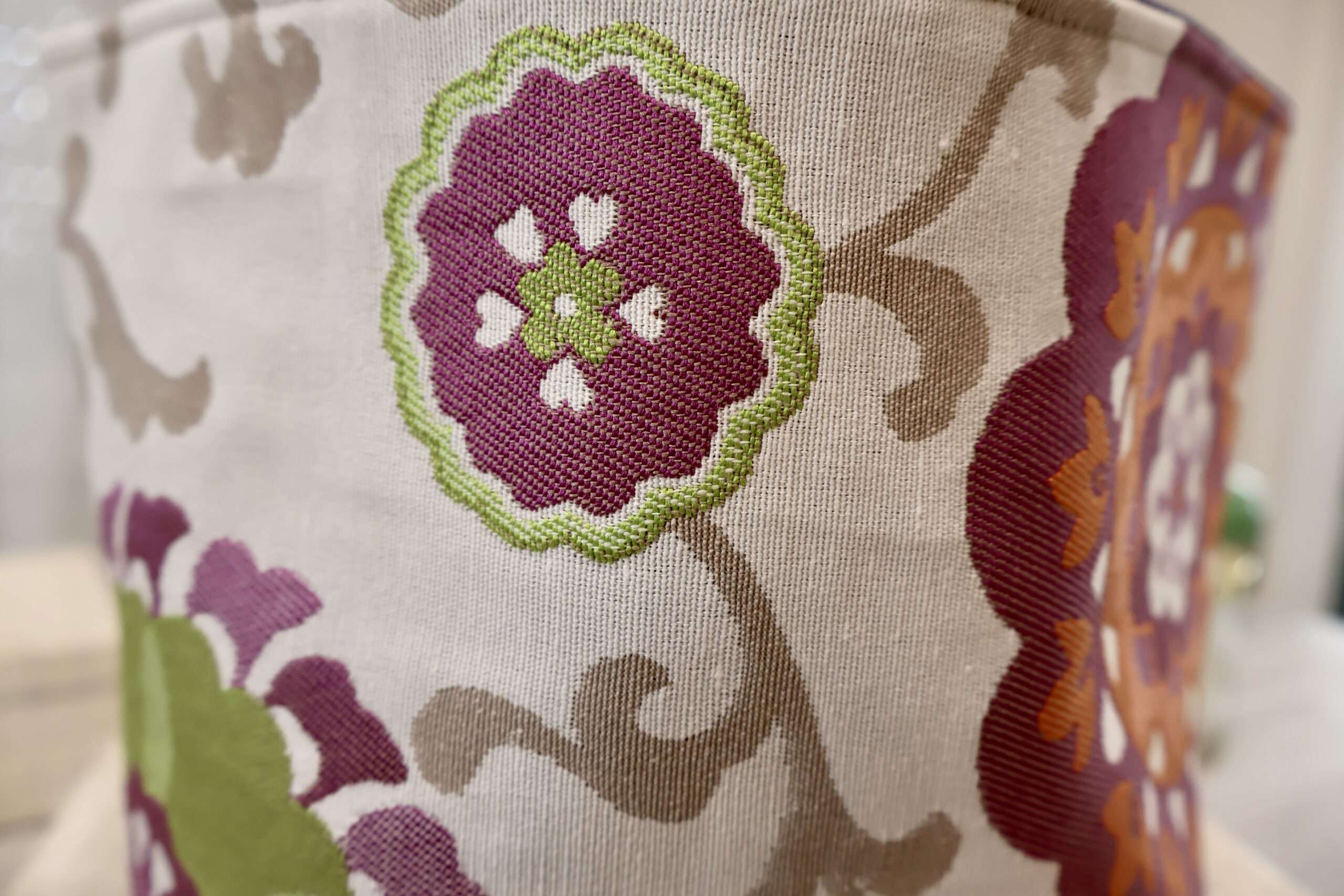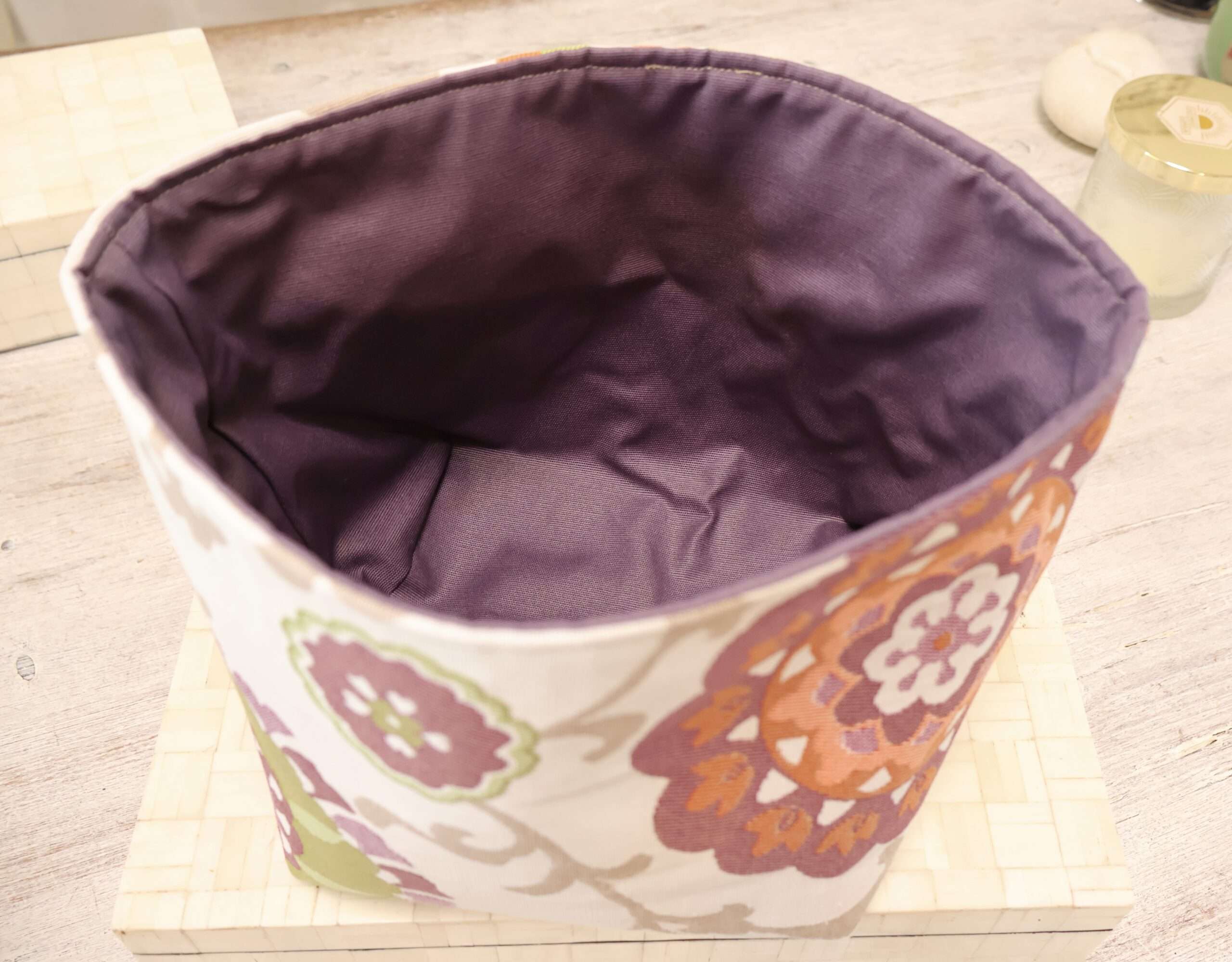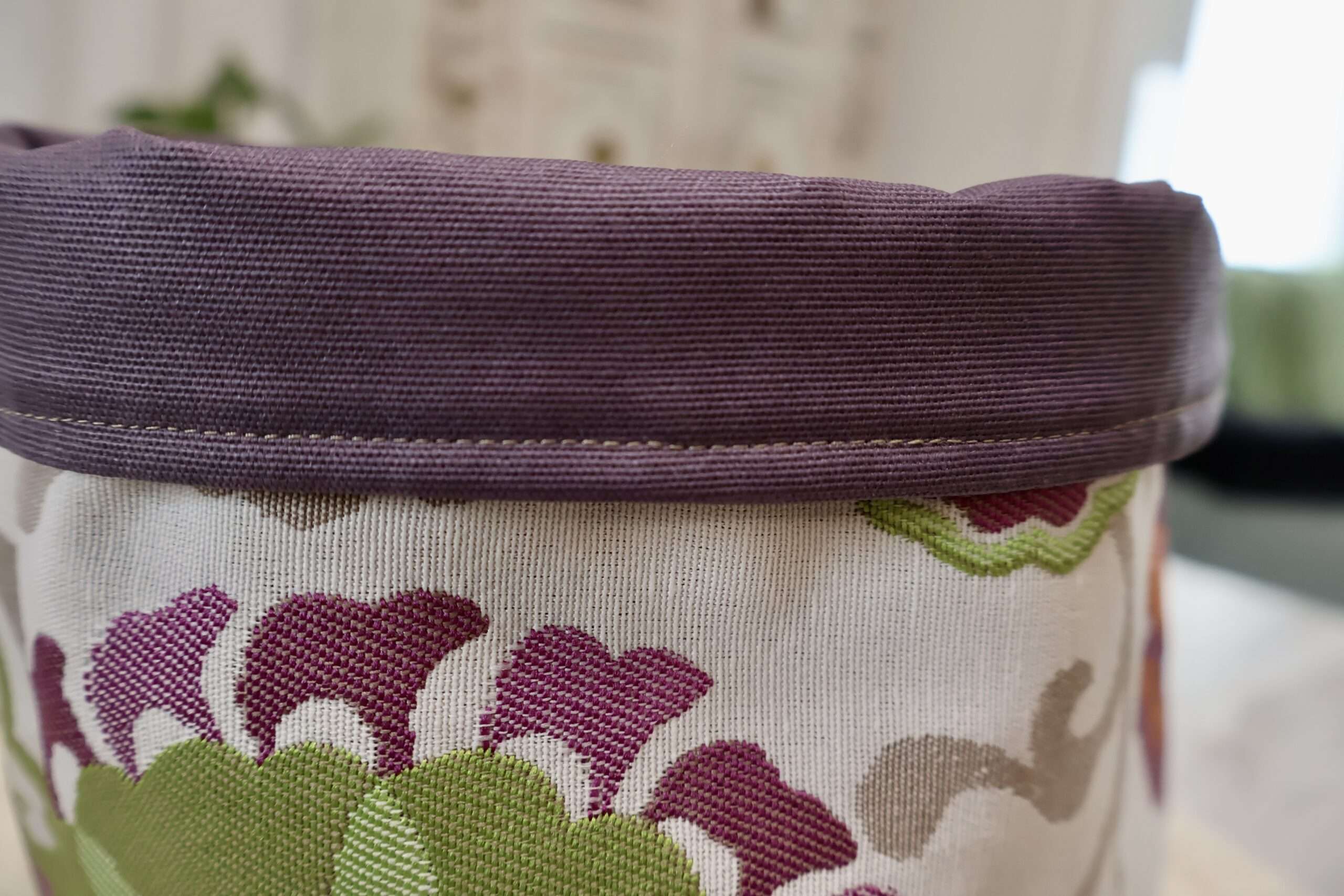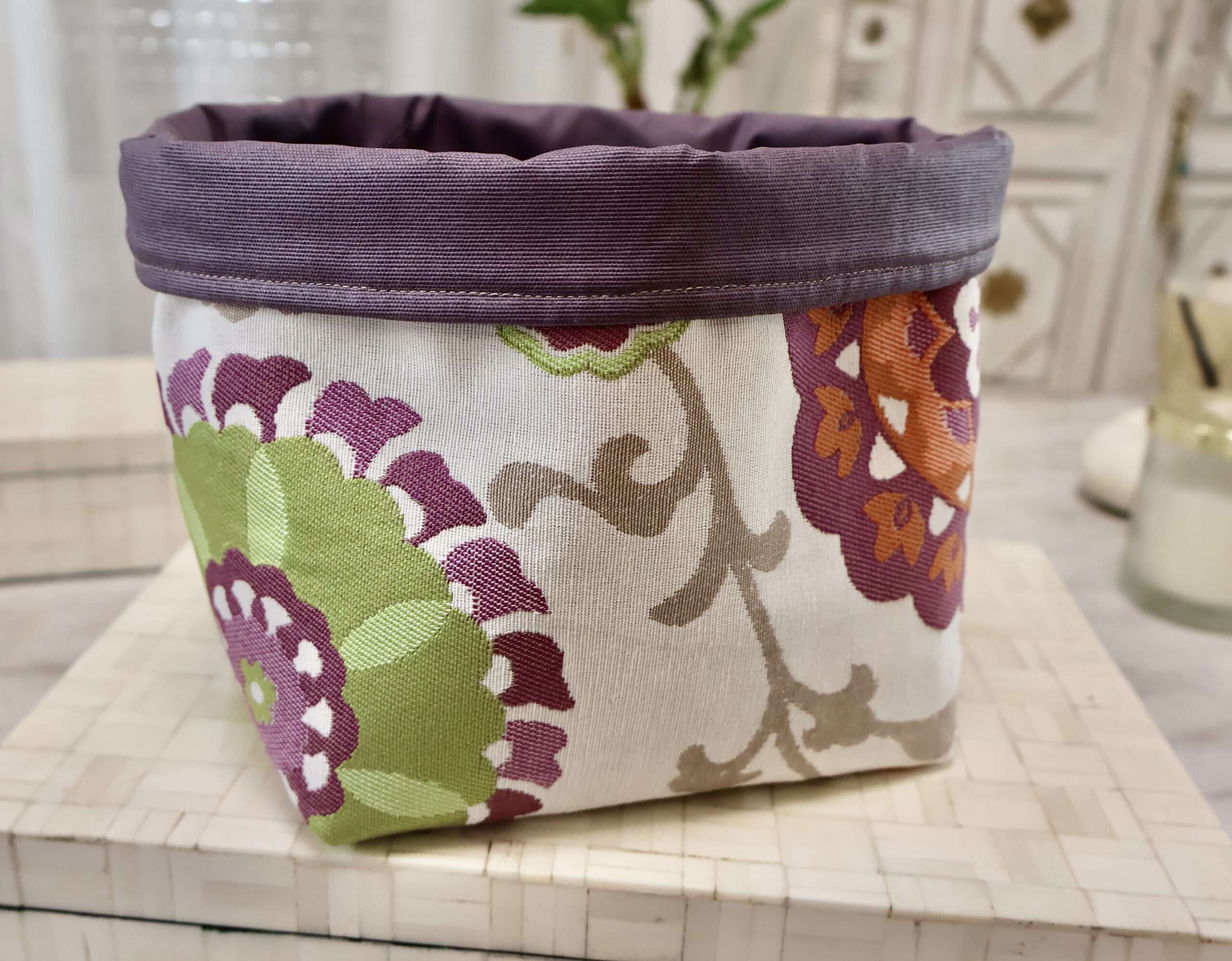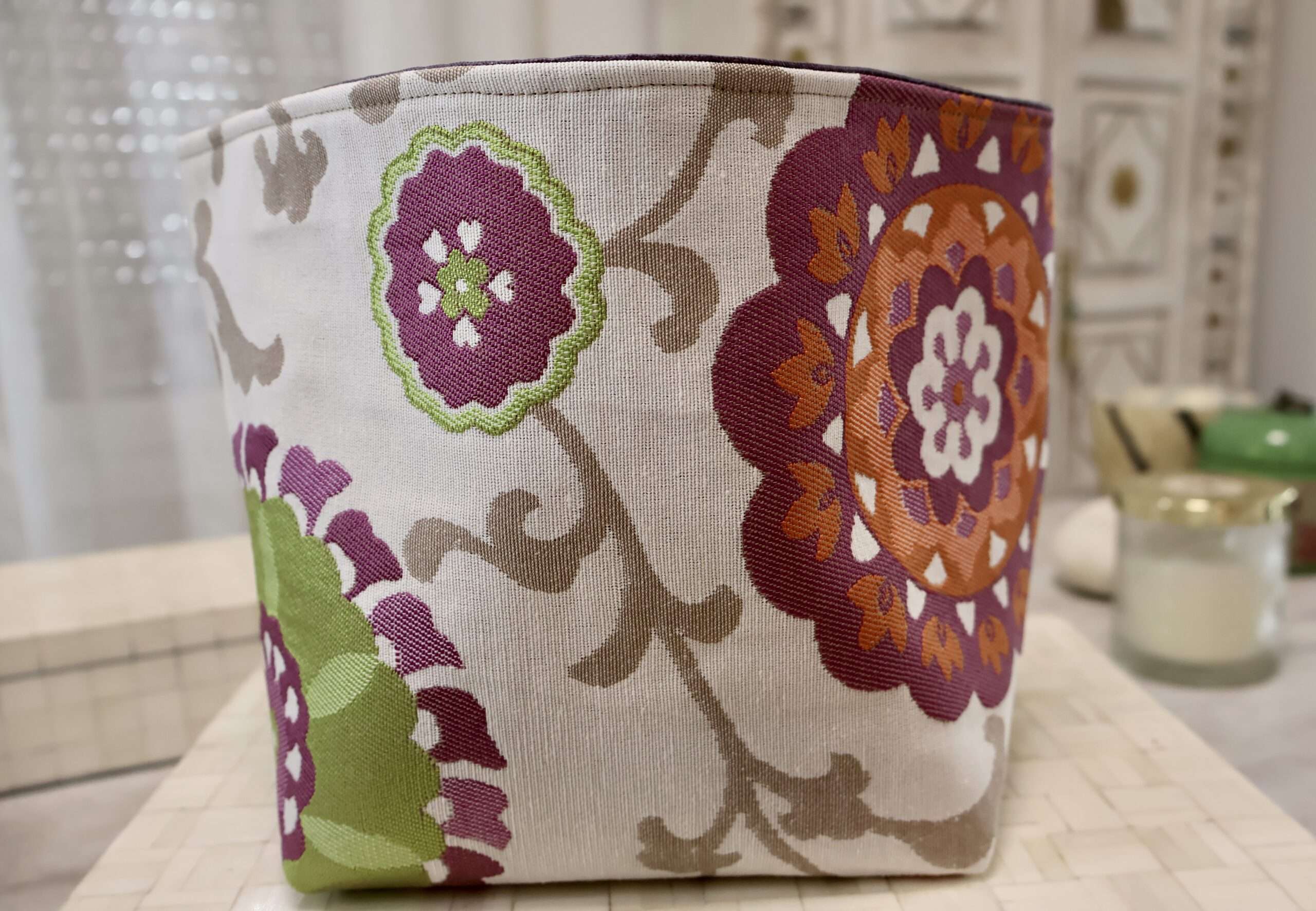 Une grande panière, fourre-tout, pour ranger facilement ses produits dans la salle de bain, la chambre, la cuisine. Ses dimensions généreuses, L 17 cms, l 16 cms, H 18,5 cms, offrent de nombreuses possibilités: Il peut servir de cache-pot pour embellir nos plantes et apporter une touche de couleurs dans notre intérieur. Dans la chambre des plus petits, on y range des jouets, des briques de construction, des doudous etc…. A côté du matelas à langer, on y met les couches, le coton, les produits de lavage. Posée sur une table, on y propose des douceurs, des fruits ou du pain. Dans la cuisine, on y range des oignons, des fruits etc … Les matières choisies permettent un nettoyage simple. A l’extérieur, un tissu jacquard imprimé, en doublure intérieure un coton enduit, imperméable, d’entretien très facile d’un simple coup d’éponge. Pour donner un autre look, on peut créer un rebord qui fait apparaître la doublure intérieure. Panière format XL pratique qui apporte une touche stylée. Fabrication artisanale française – Pièce Unique.