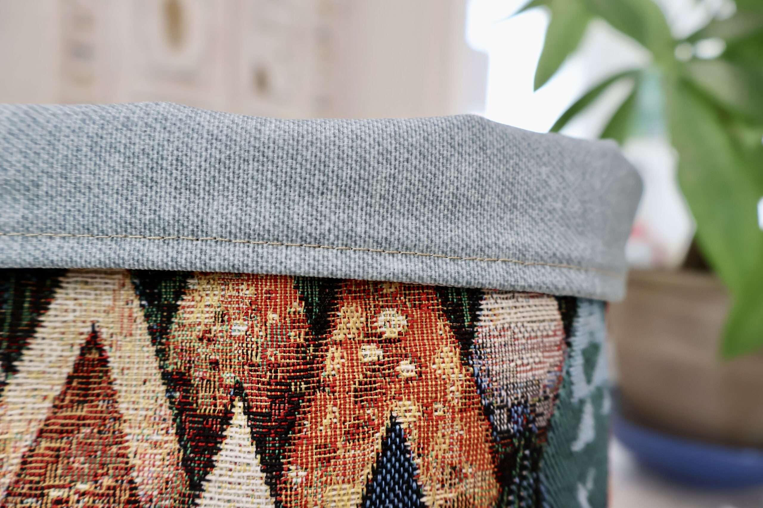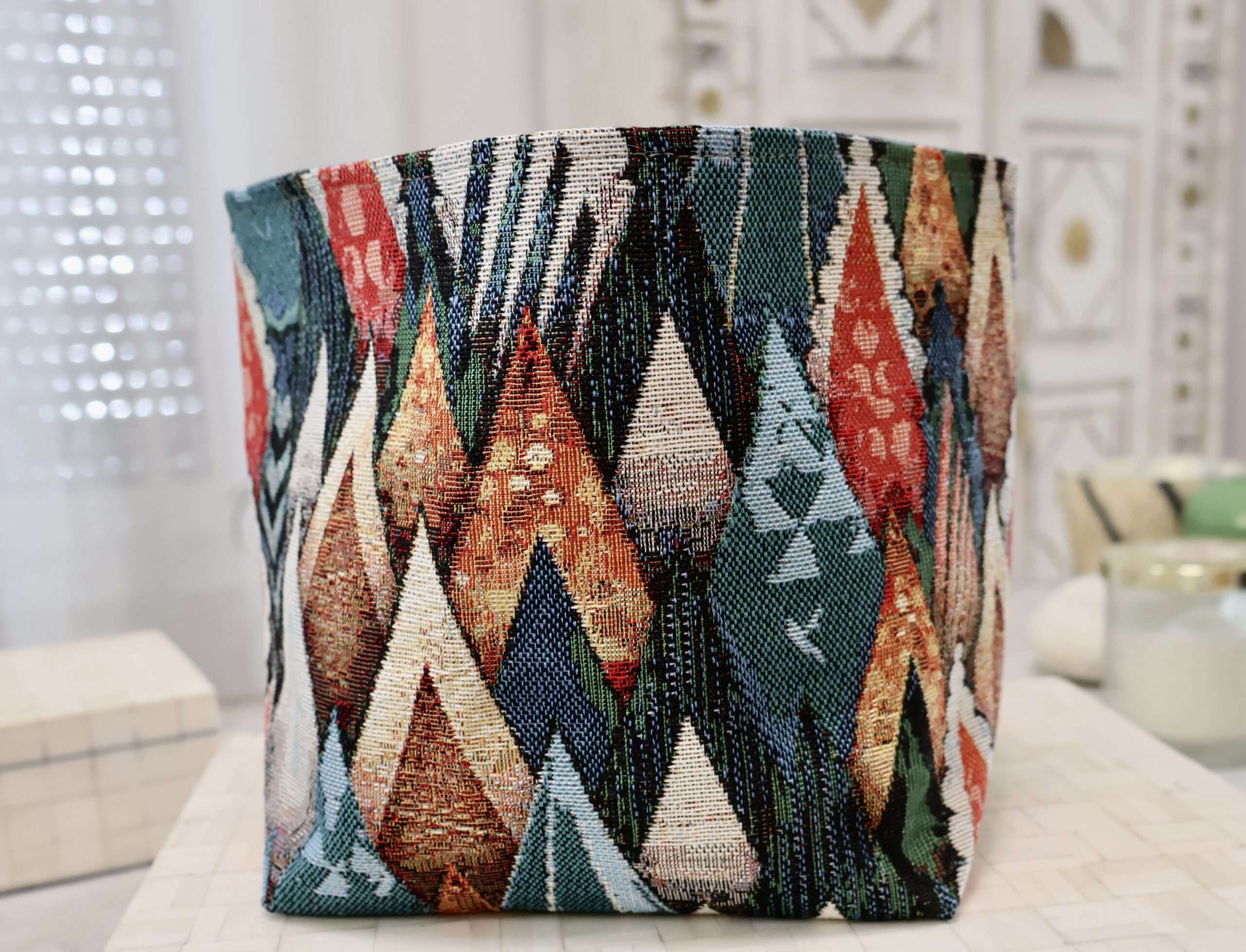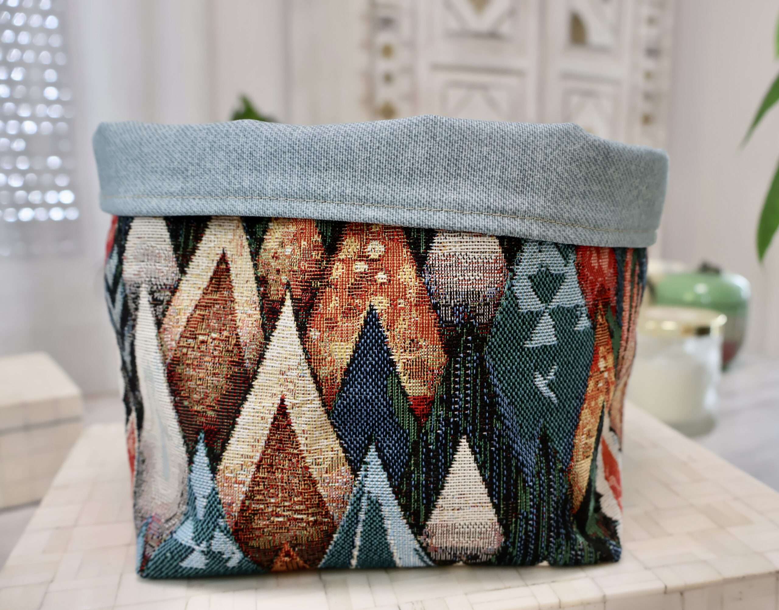 Une grande panière, fourre-tout, pour ranger facilement ses produits dans la salle de bain, la chambre, la cuisine. Ses dimensions généreuses, L 17 cms, l 16 cms, H 18,5 cms, offrent de nombreuses possibilités: Il peut servir de cache-pot pour embellir nos plantes et apporter une touche de couleurs dans notre intérieur. Dans la chambre des plus petits, on y range des jouets, des briques de construction, des doudous etc…. A côté du matelas à langer, on y met les couches, le coton, les produits de lavage. Posée sur une table, on y propose des douceurs, des fruits ou du pain. Dans la cuisine, on y range des oignons, des fruits etc … Les matières choisies permettent un nettoyage simple. A l’extérieur, un superbe tissu jacquard imprimé, en doublure intérieure un coton enduit, imperméable, d’entretien très facile d’un simple coup d’éponge. Pour donner un autre look, on peut créer un rebord qui fait apparaître la doublure intérieure. Panière format XL pratique qui apporte une touche stylée. Fabrication artisanale française – Pièce Unique.