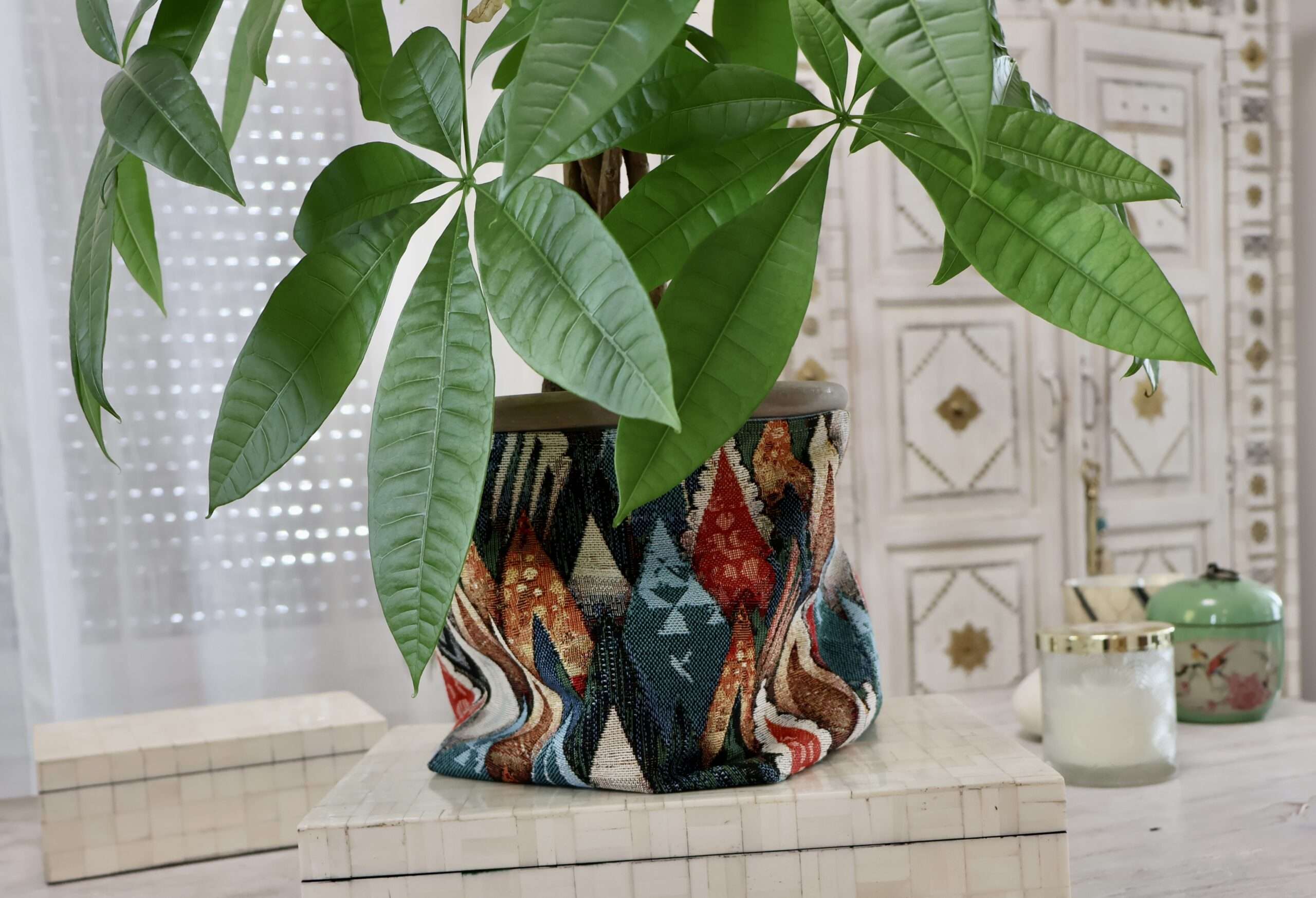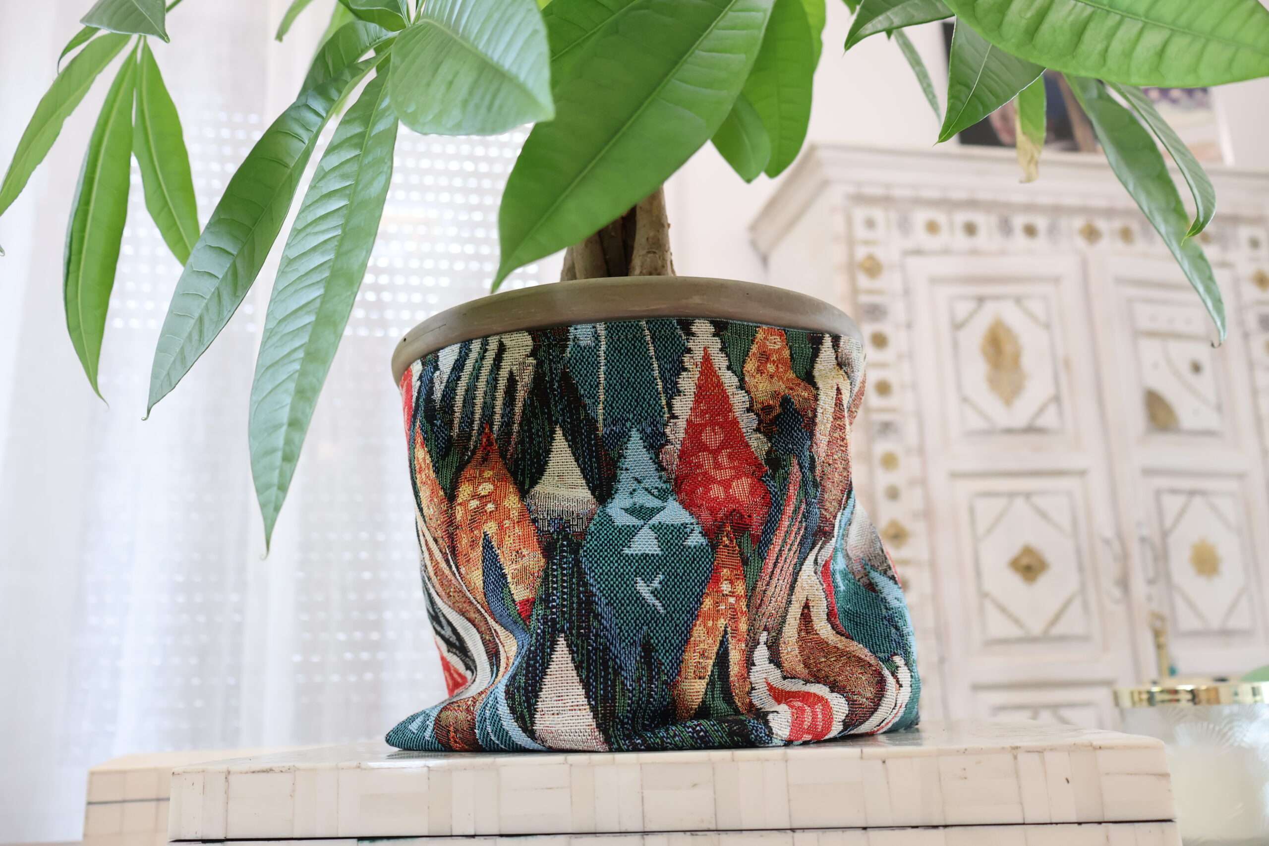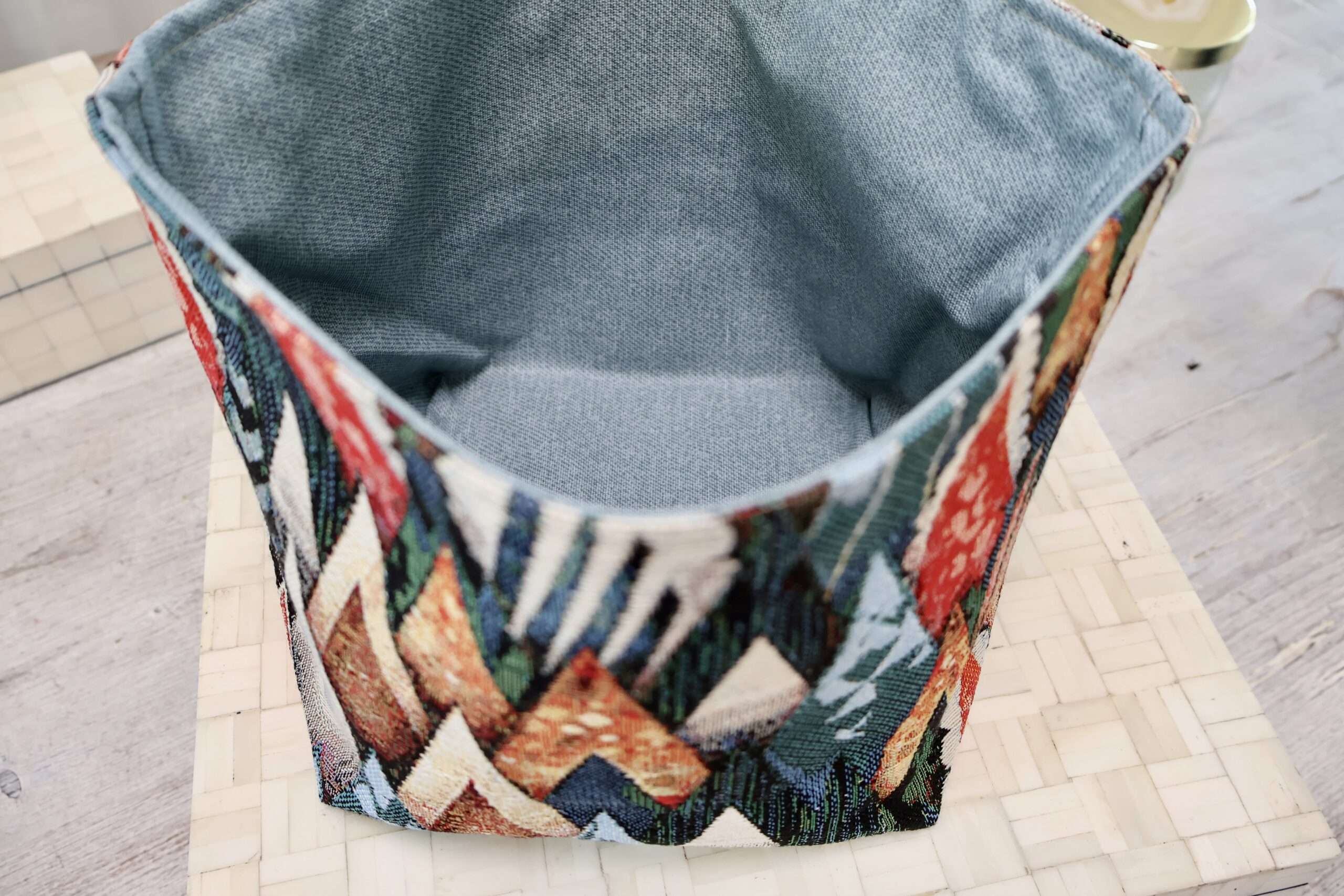Une grande panière, fourre-tout, pour ranger facilement ses produits dans la salle de bain, la chambre, la cuisine. Ses dimensions généreuses, L 17 cms, l 16 cms, H 18,5 cms, offrent de nombreuses possibilités: Il peut servir de cache-pot pour embellir nos plantes et apporter une touche de couleurs dans notre intérieur. Dans la chambre des plus petits, on y range des jouets, des briques de construction, des doudous etc…. A côté du matelas à langer, on y met les couches, le coton, les produits de lavage. Posée sur une table, on y propose des douceurs, des fruits ou du pain. Dans la cuisine, on y range des oignons, des fruits etc … Les matières choisies permettent un nettoyage simple. A l’extérieur, un superbe tissu jacquard imprimé, en doublure intérieure un coton enduit, imperméable, d’entretien très facile d’un simple coup d’éponge. Pour donner un autre look, on peut créer un rebord qui fait apparaître la doublure intérieure. Panière format XL pratique qui apporte une touche stylée. Fabrication artisanale française – Pièce Unique.