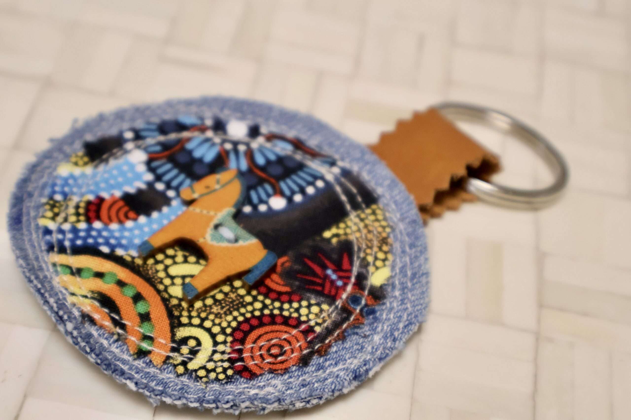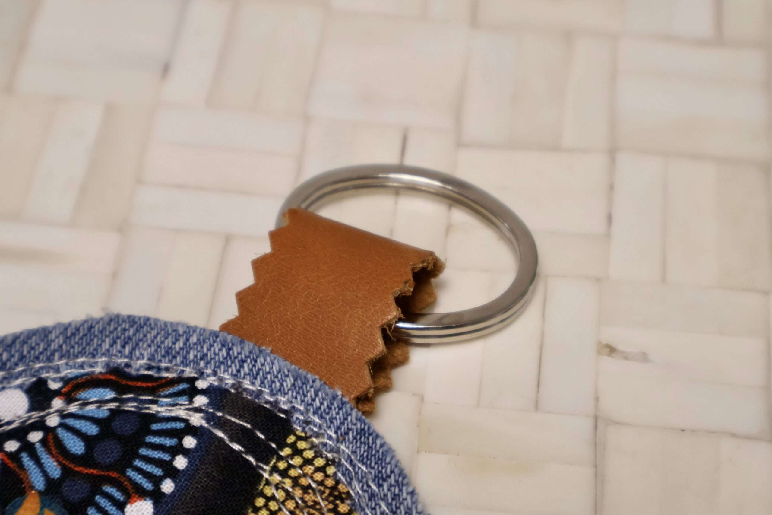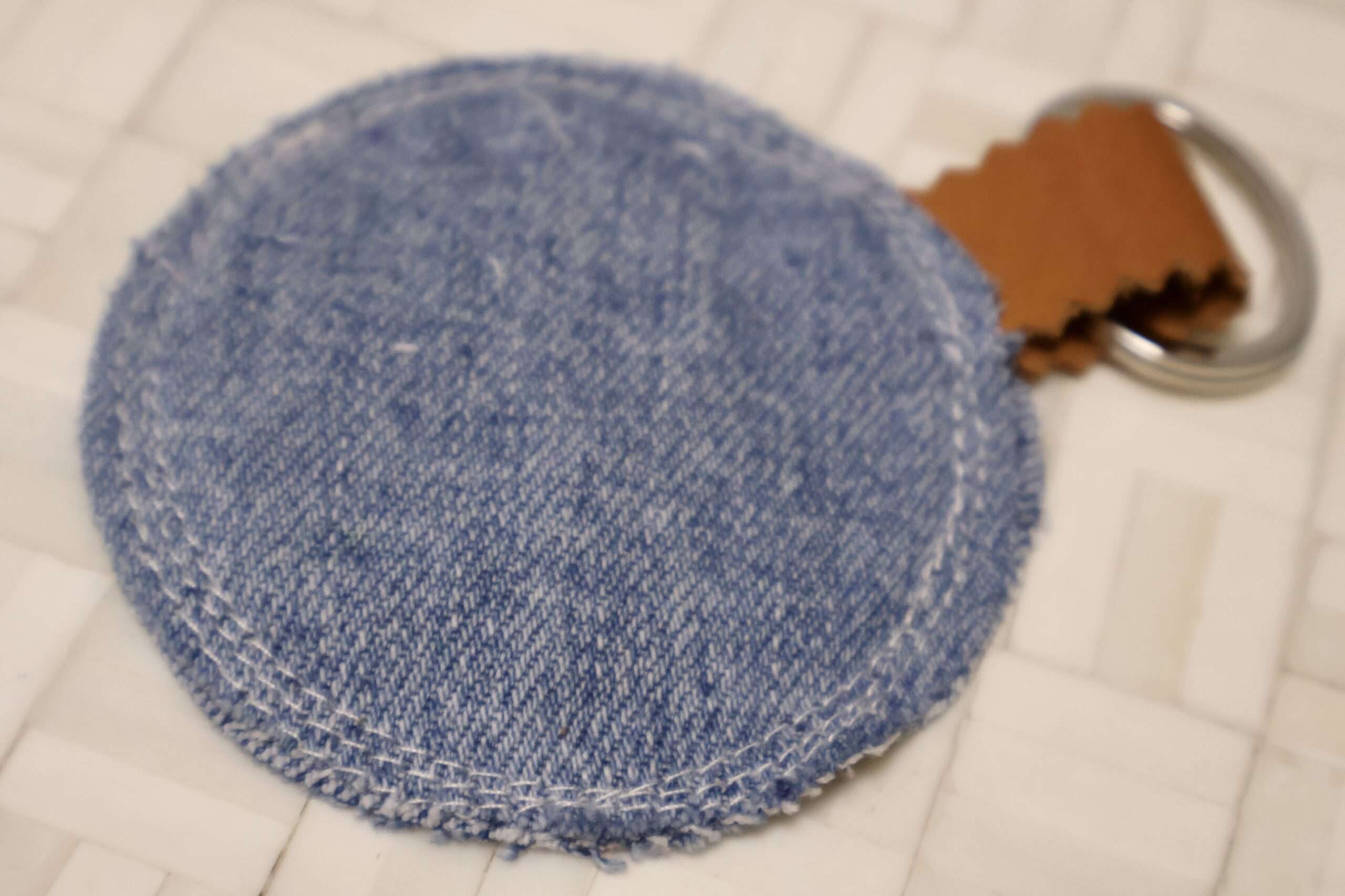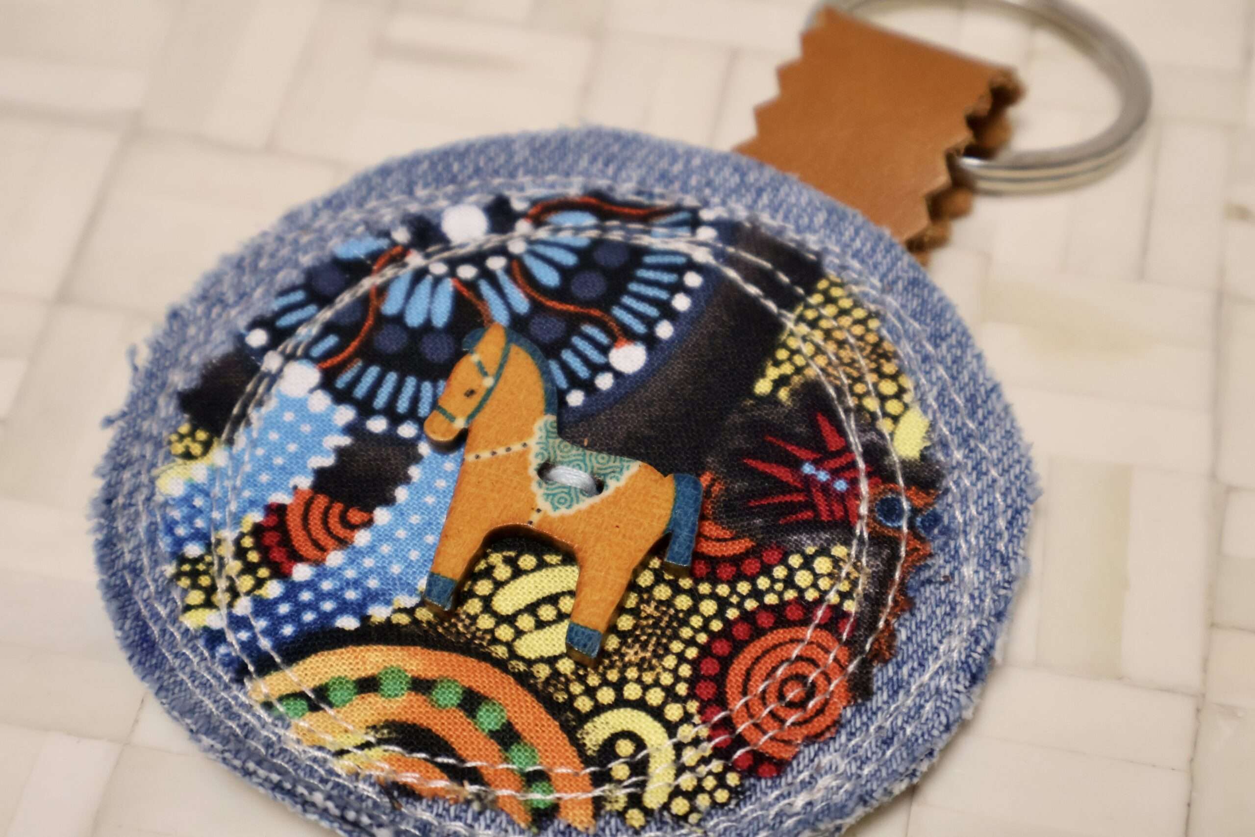 Porte-clé cousu à la main en jean recyclé, décoré d’un bouton en bois, rehaussé d’un lien en cuir pour une touche authentique et durable.