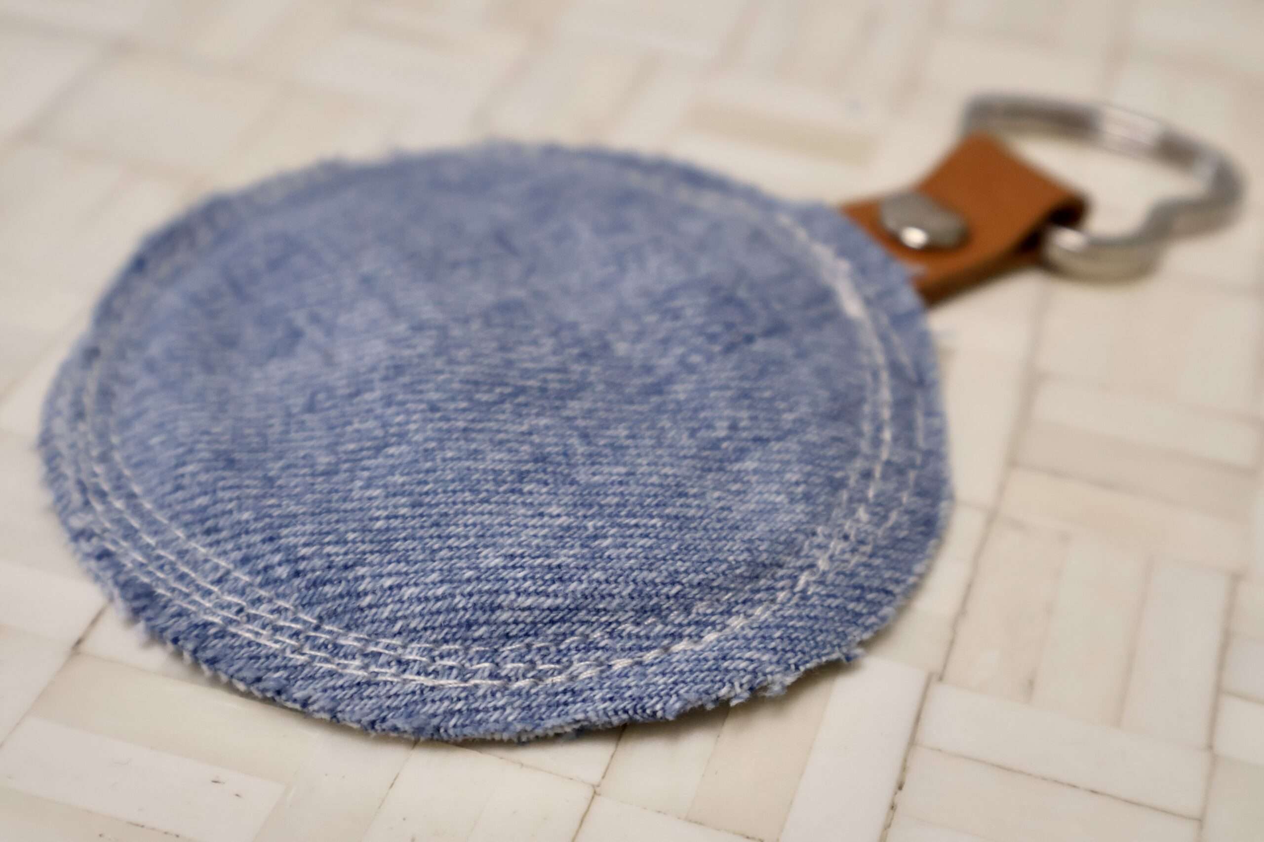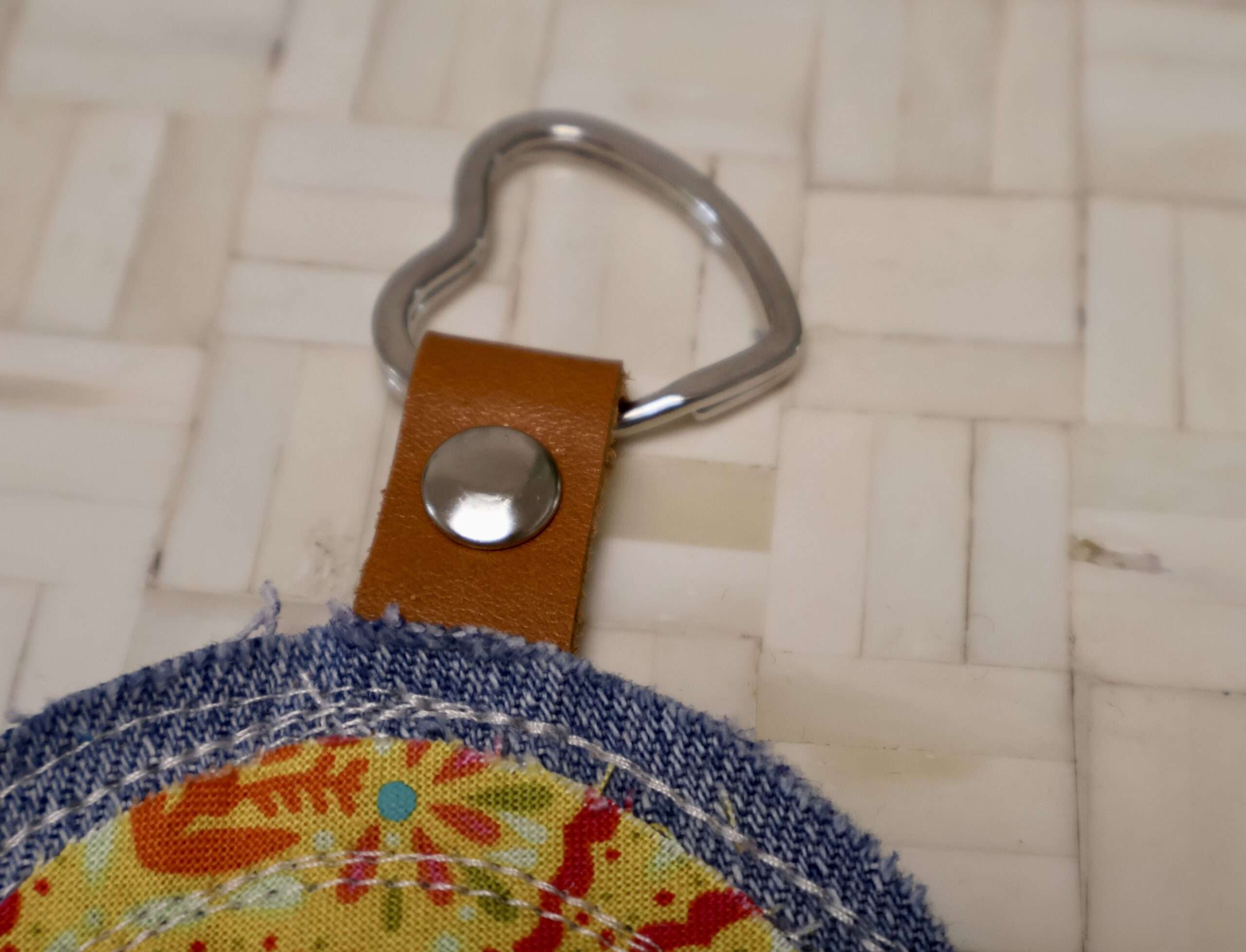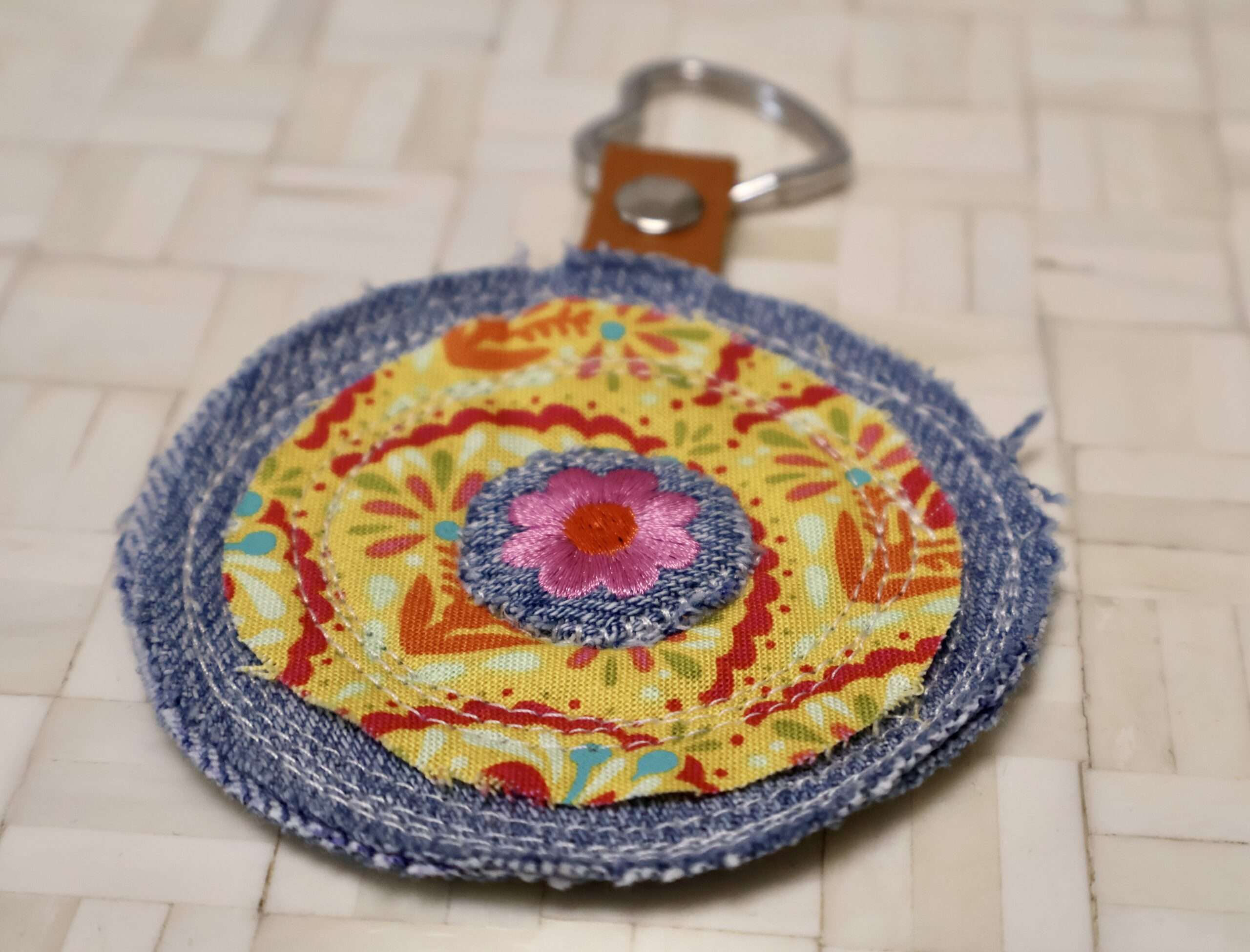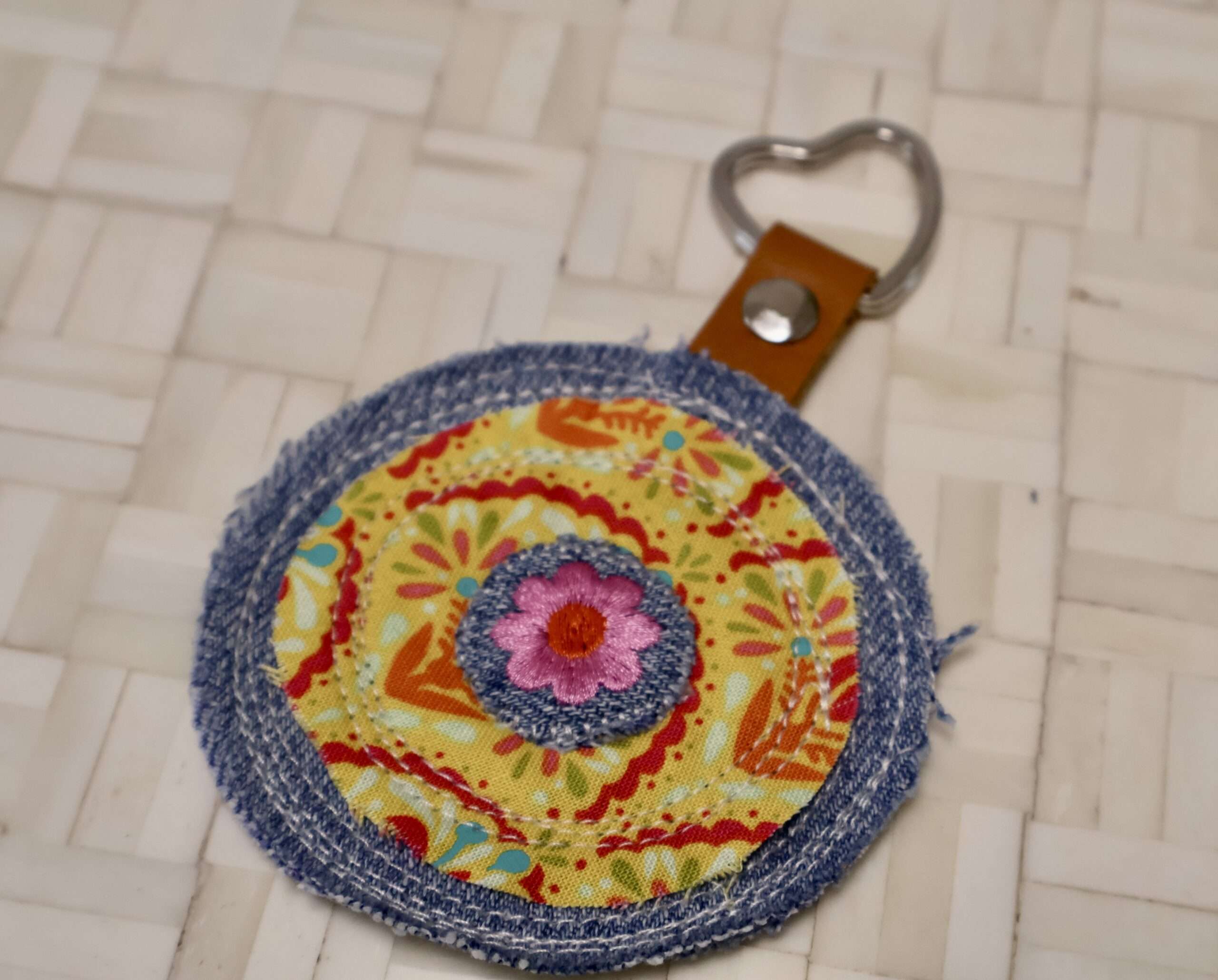 Porte-clé cousu à la main en jean recyclé, décoré d’une broderie, rehaussé d’un lien en cuir pour une touche authentique et durable.