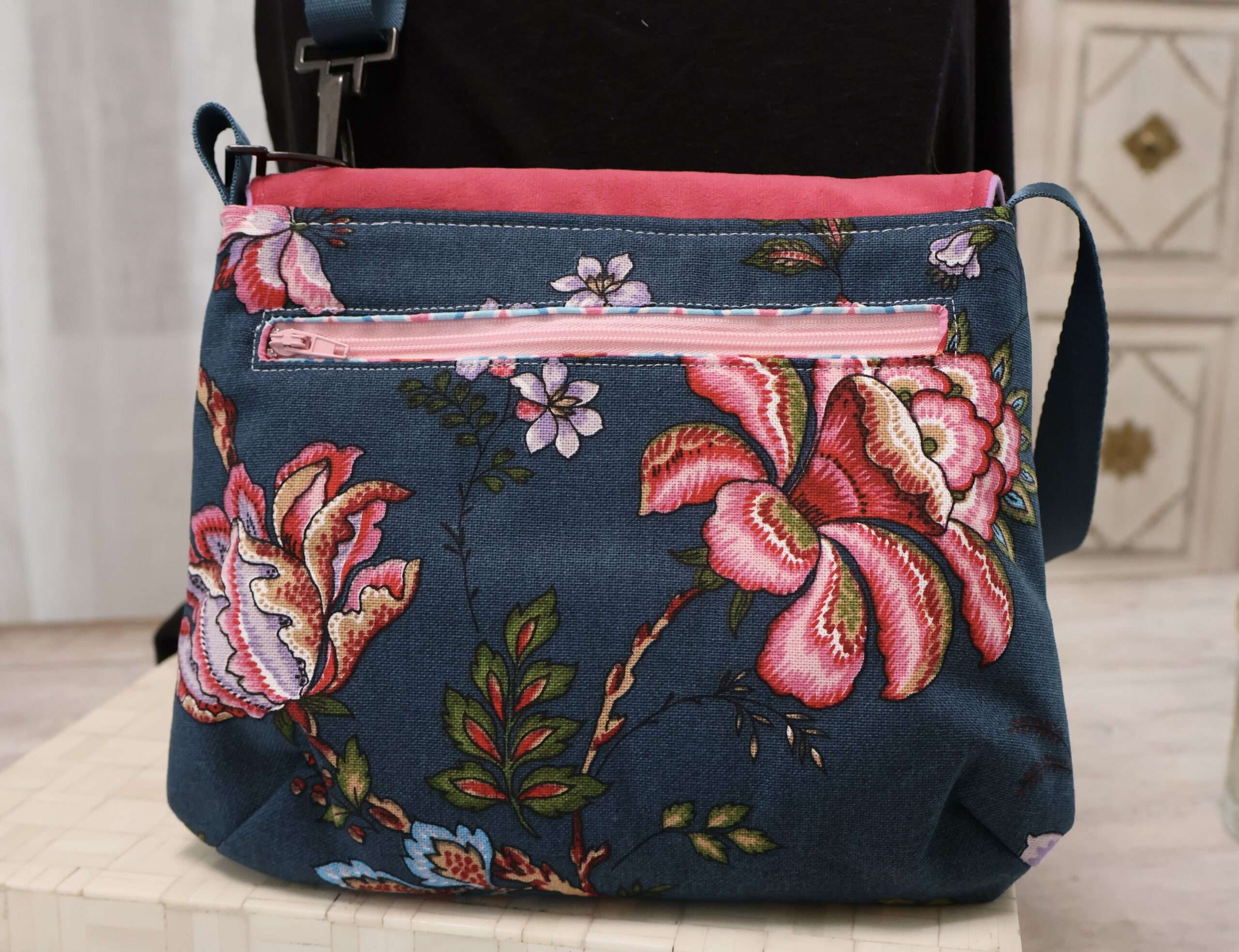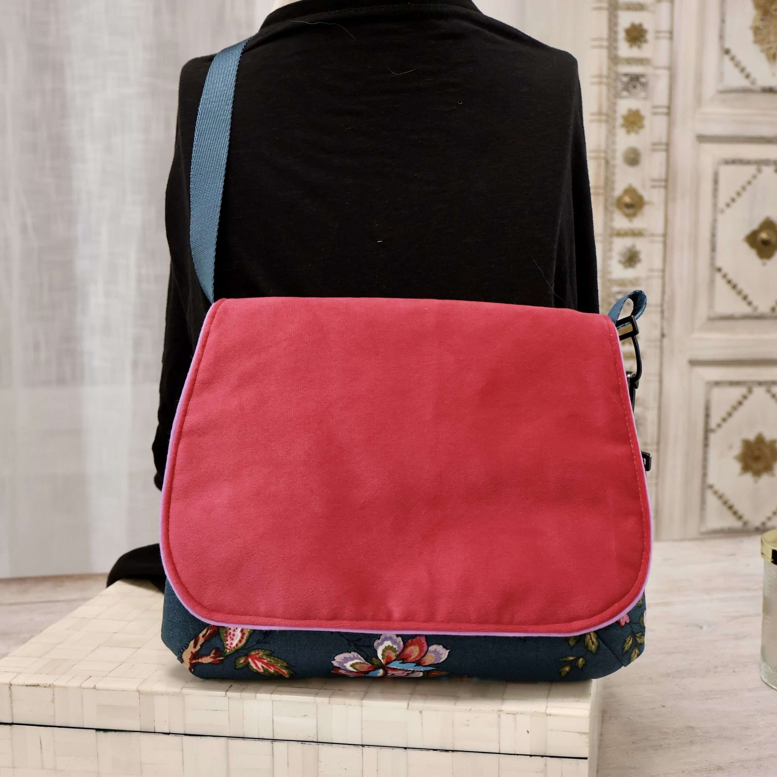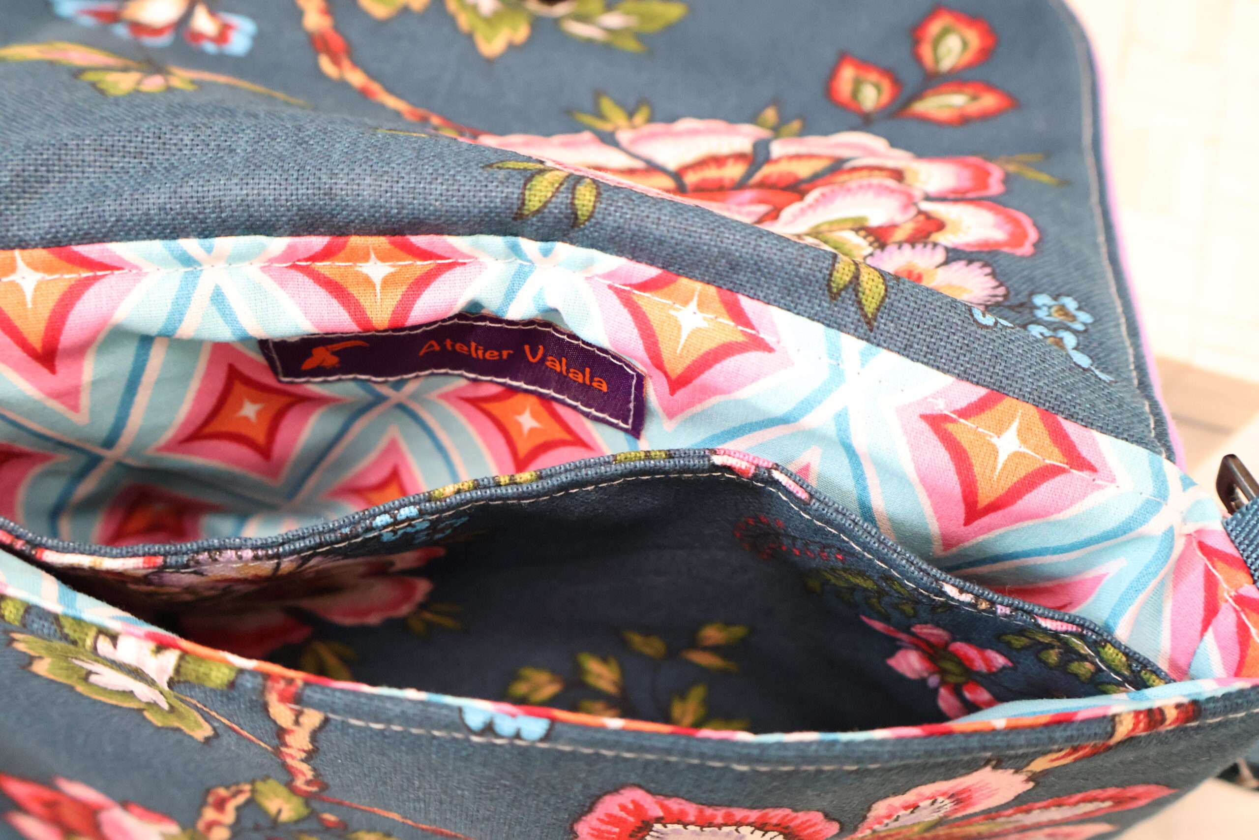 L’Ami fidèle est un sac que l’on emporte facilement partout (c’est avec lui que je voyage). Grâce à ses différents rangements, une grande poche zippée à l’arrière facile d’accès pour y mettre ses effets les plus précieux, et une grande poche plaquée ouverte à l’intérieur, il permet d’emporter et de ranger facilement ses affaires. Une fermeture par bouton aimantée permet de le garder fermé en toute sécurité. Ses dimensions en font un sac pas trop grand mais vraiment pas trop petit, grâce également à sa forme à soufflet qui permet de trouver aisément ce qu’il contient! Les tissus choisis lui donnent toute son originalité avec à l’extérieur un lumineux coton épais aux bouquets fleuris sur fond bleu canard couvert par un grand rabat en velours rose, doublé à l’intérieur d’un coton imprimé. Le sac se porte en bandoulière grâce à une longue anse solide. Tellement pratique pour avoir les mains libres! Fabrication artisanale française, Pièce Unique. Le « petit sac » qui fait un gros effet!