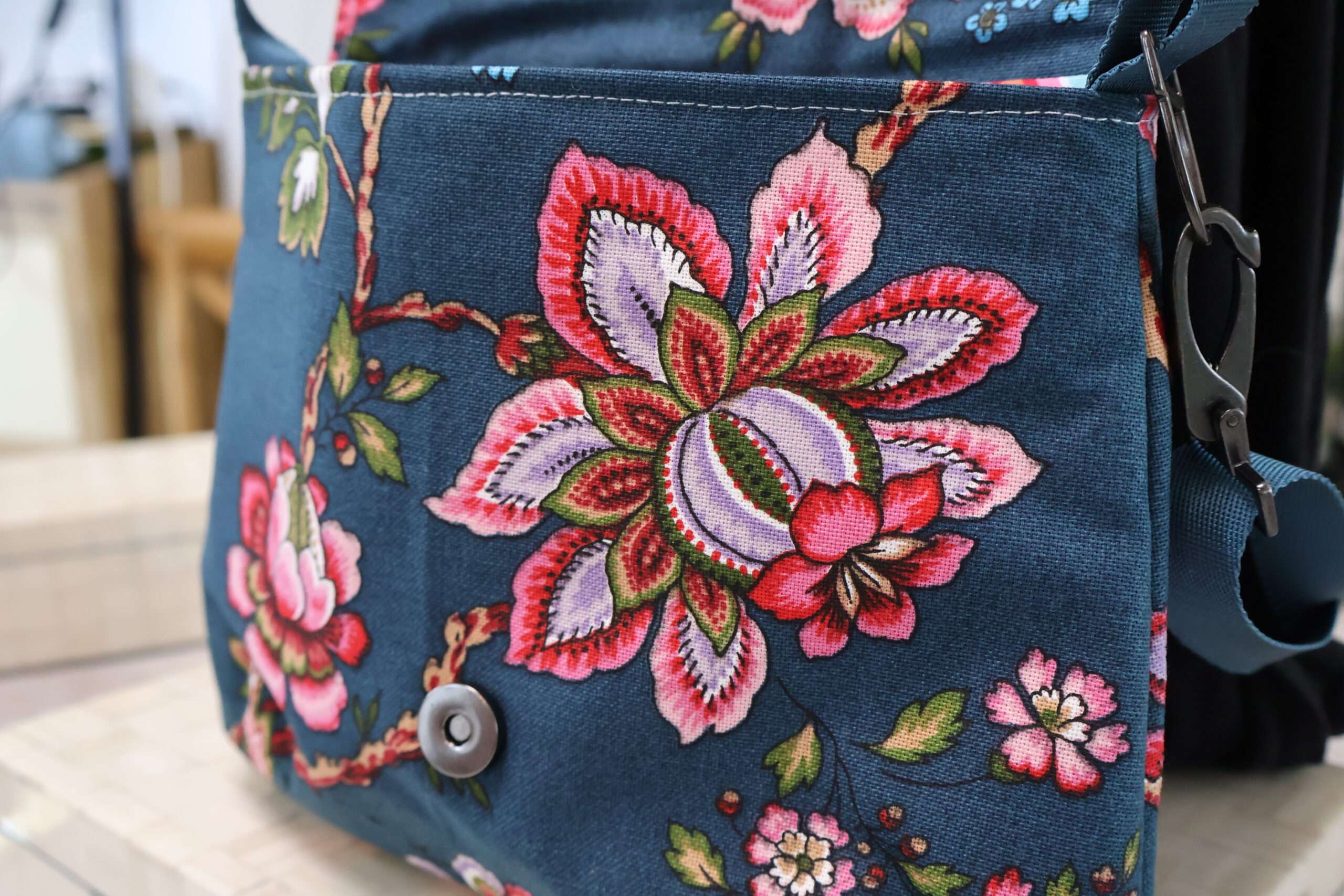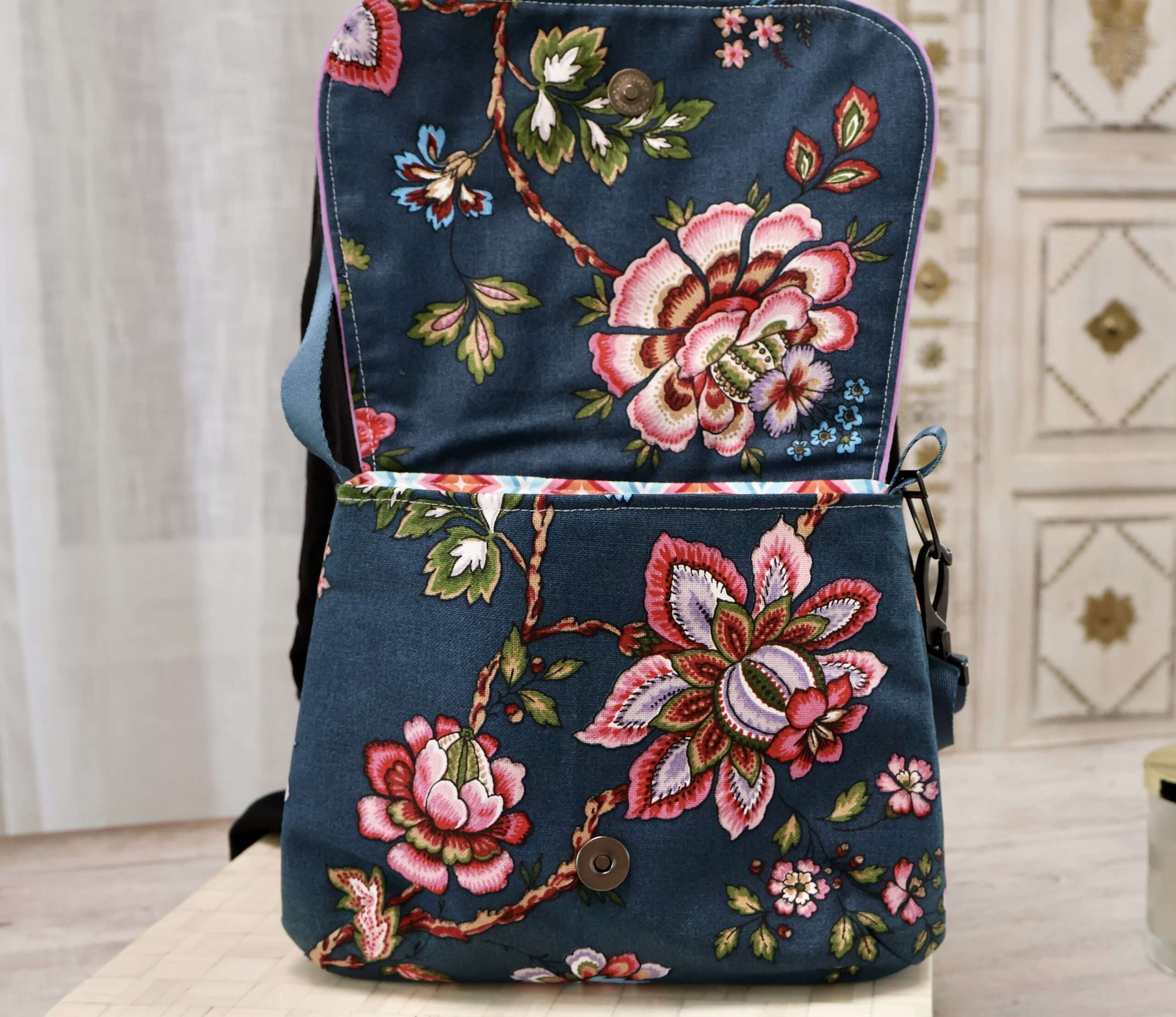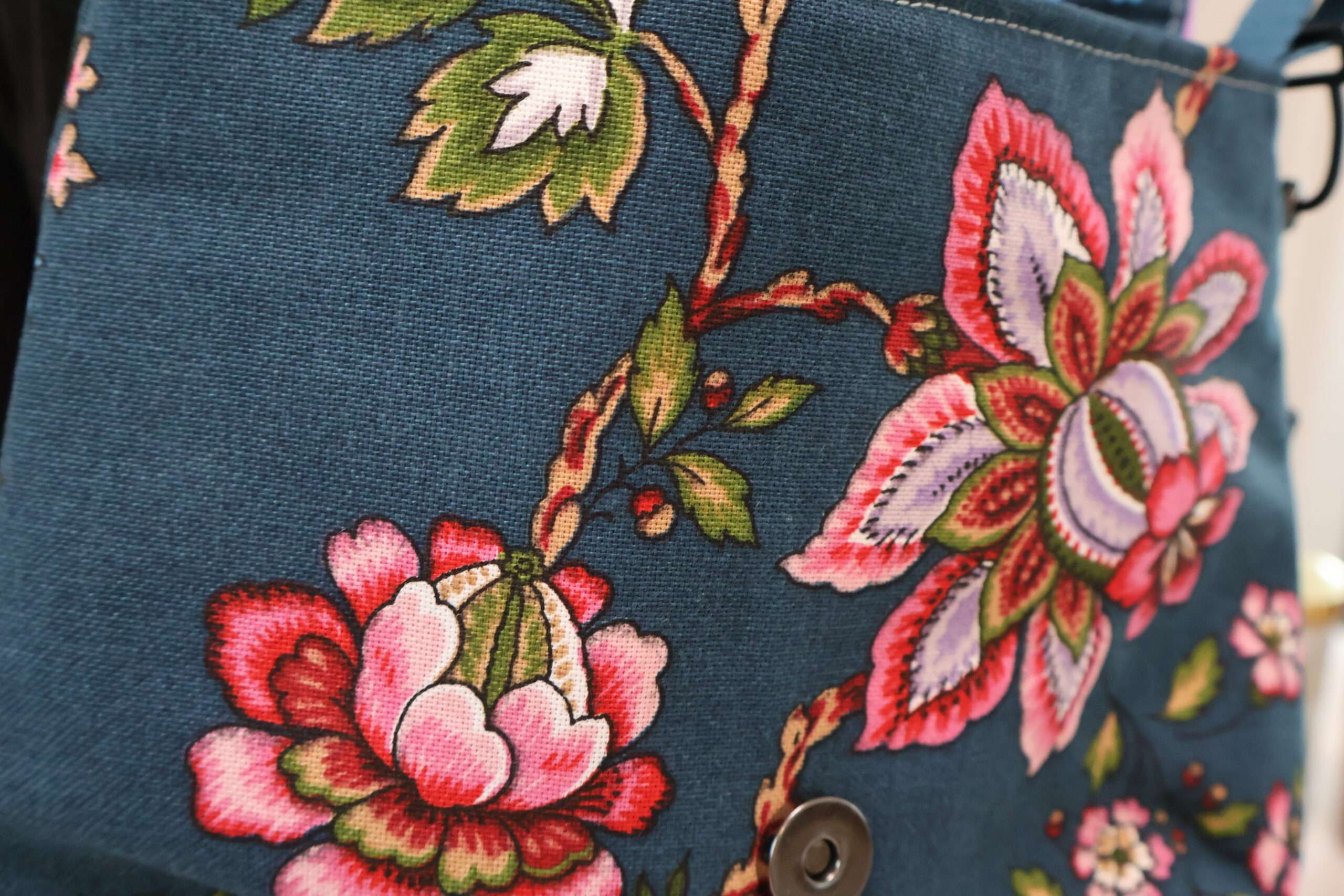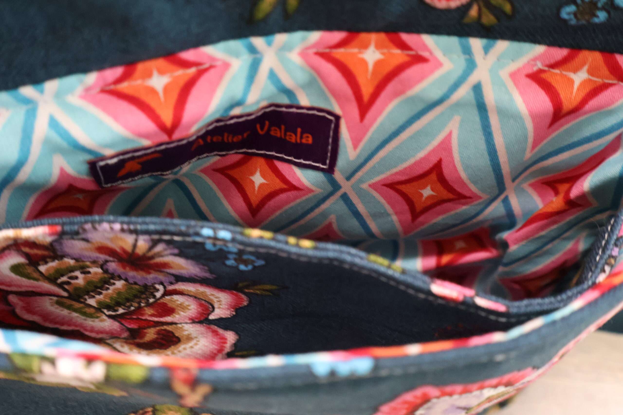 L’Ami fidèle est un sac que l’on emporte facilement partout (c’est avec lui que je voyage). Grâce à ses différents rangements, une grande poche zippée à l’arrière facile d’accès pour y mettre ses effets les plus précieux, et une grande poche plaquée ouverte à l’intérieur, il permet d’emporter et de ranger facilement ses affaires. Une fermeture par bouton aimantée permet de le garder fermé en toute sécurité. Ses dimensions en font un sac pas trop grand mais vraiment pas trop petit, grâce également à sa forme à soufflet qui permet de trouver aisément ce qu’il contient! Les tissus choisis lui donnent toute son originalité avec à l’extérieur un lumineux coton épais aux bouquets fleuris sur fond bleu canard couvert par un grand rabat en velours rose, doublé à l’intérieur d’un coton imprimé. Le sac se porte en bandoulière grâce à une longue anse solide. Tellement pratique pour avoir les mains libres! Fabrication artisanale française, Pièce Unique. Le « petit sac » qui fait un gros effet!