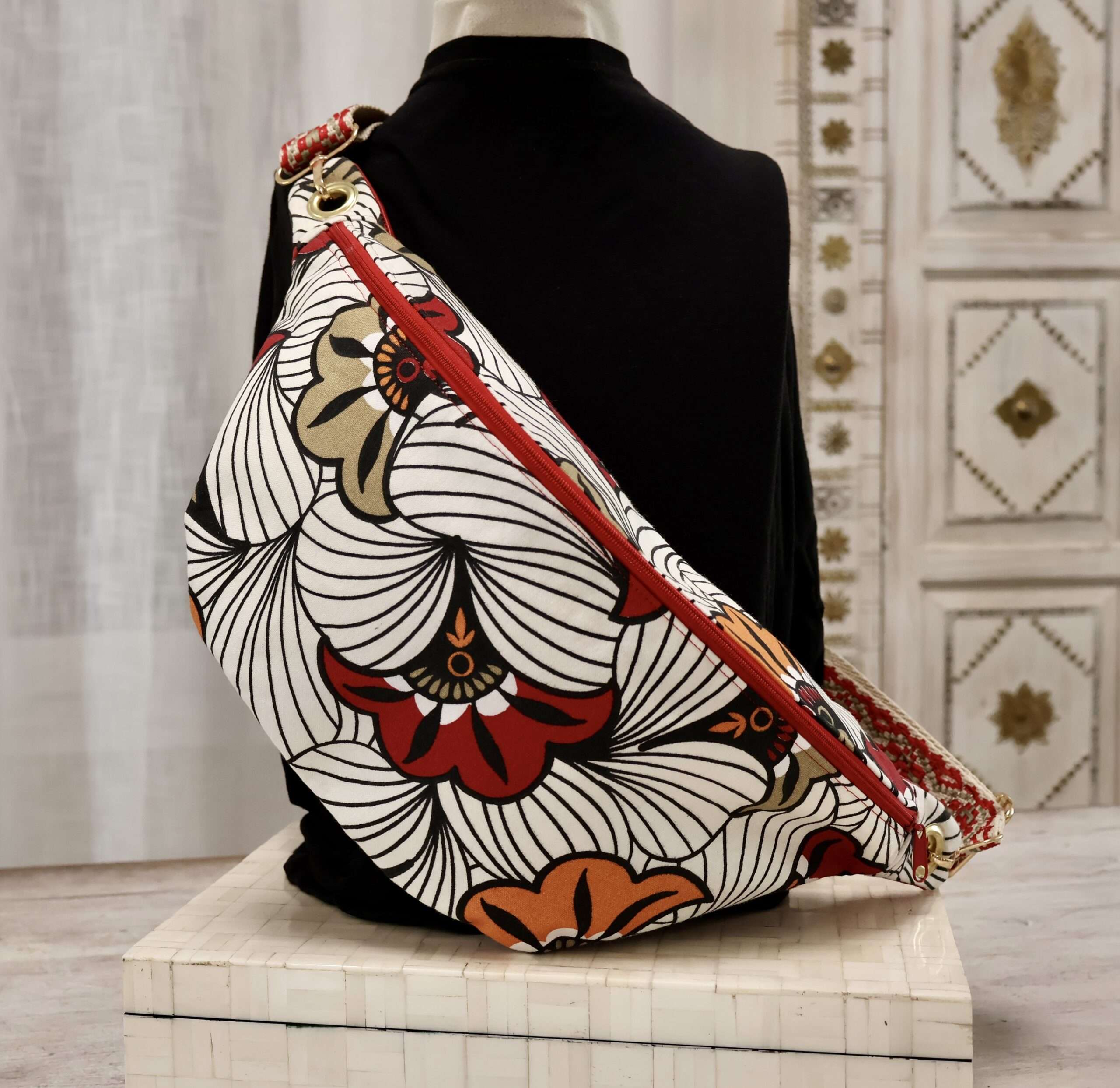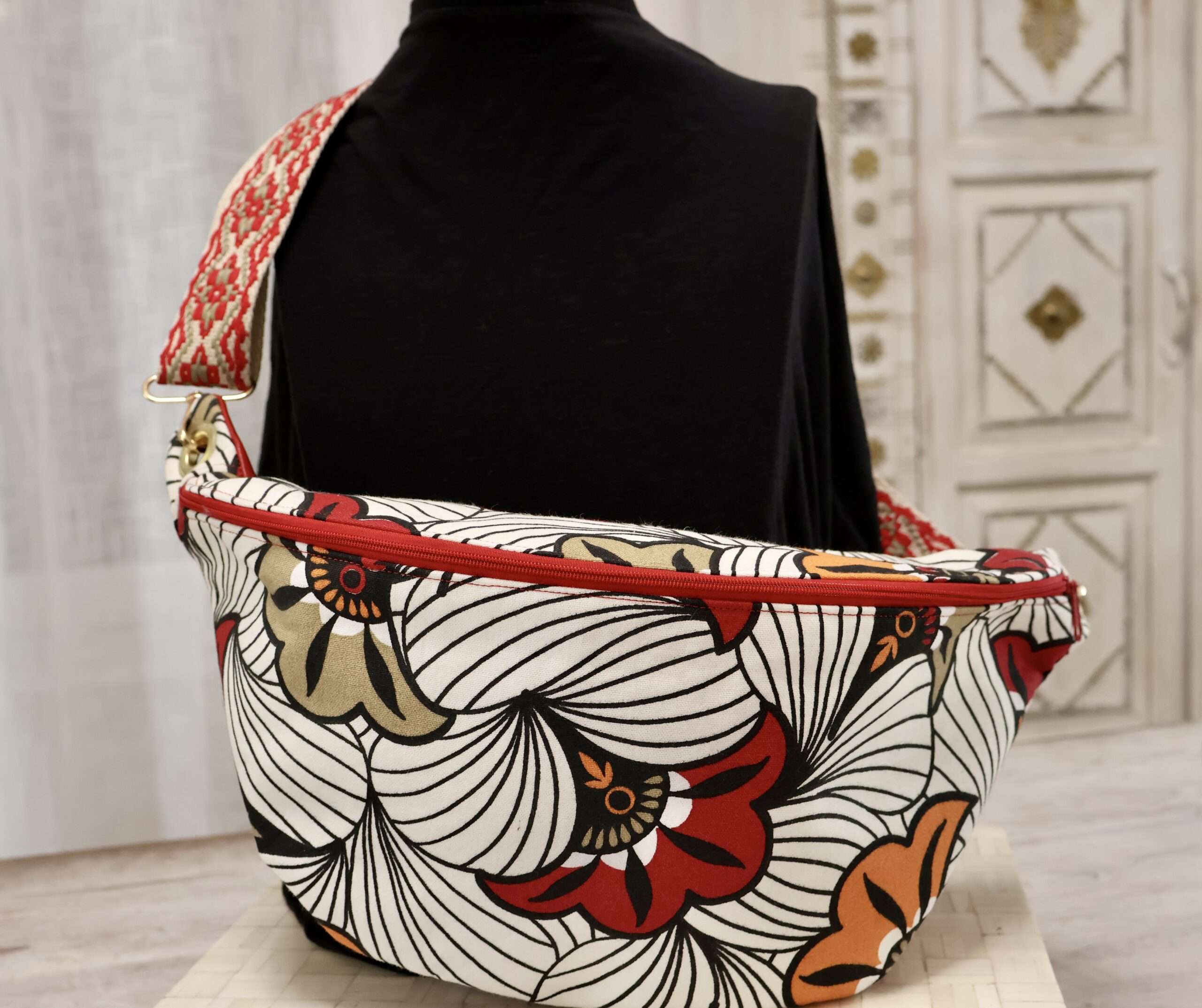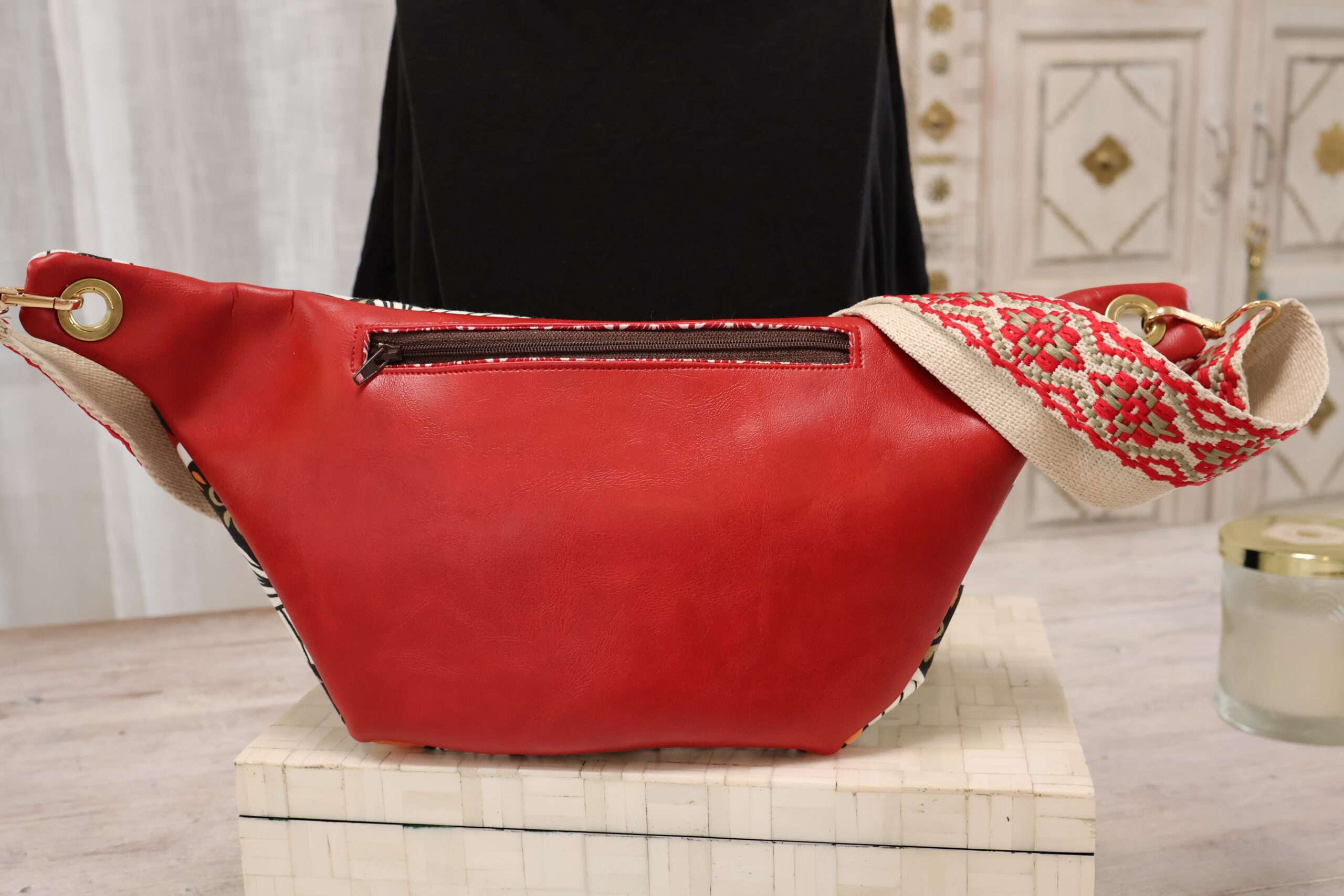 Sac Banana, format XXL grâce à ses dimensions généreuses, porté en bandoulière. Pratique avec sa grande poche zippée à l’arrière pour y ranger vos essentiels les plus précieux comme votre carte bancaire, passeport ou carte d’identité, smartphone. Dans le grand compartiment intérieur, vous y glisserez aisèment tous vos autres accessoires. Grâce à sa belle anse réglable, vous pouvez porter votre grande sacoche aussi bien sur un manteau épais que sur un tee-shirt léger. Une grande fermeture éclair ferme le sac Banane en toute sécurité. De superbes matières donnent tout son style et son originalité à ce sac Banana. Devant, un riche coton aux imprimés Afrique est associé à un lumineux simili cuir rouge à l’arrière. La doublure intérieure est en coton imprimé. Fabrication artisanale française, Pièce Unique. Un sac Banana qui a de la classe !