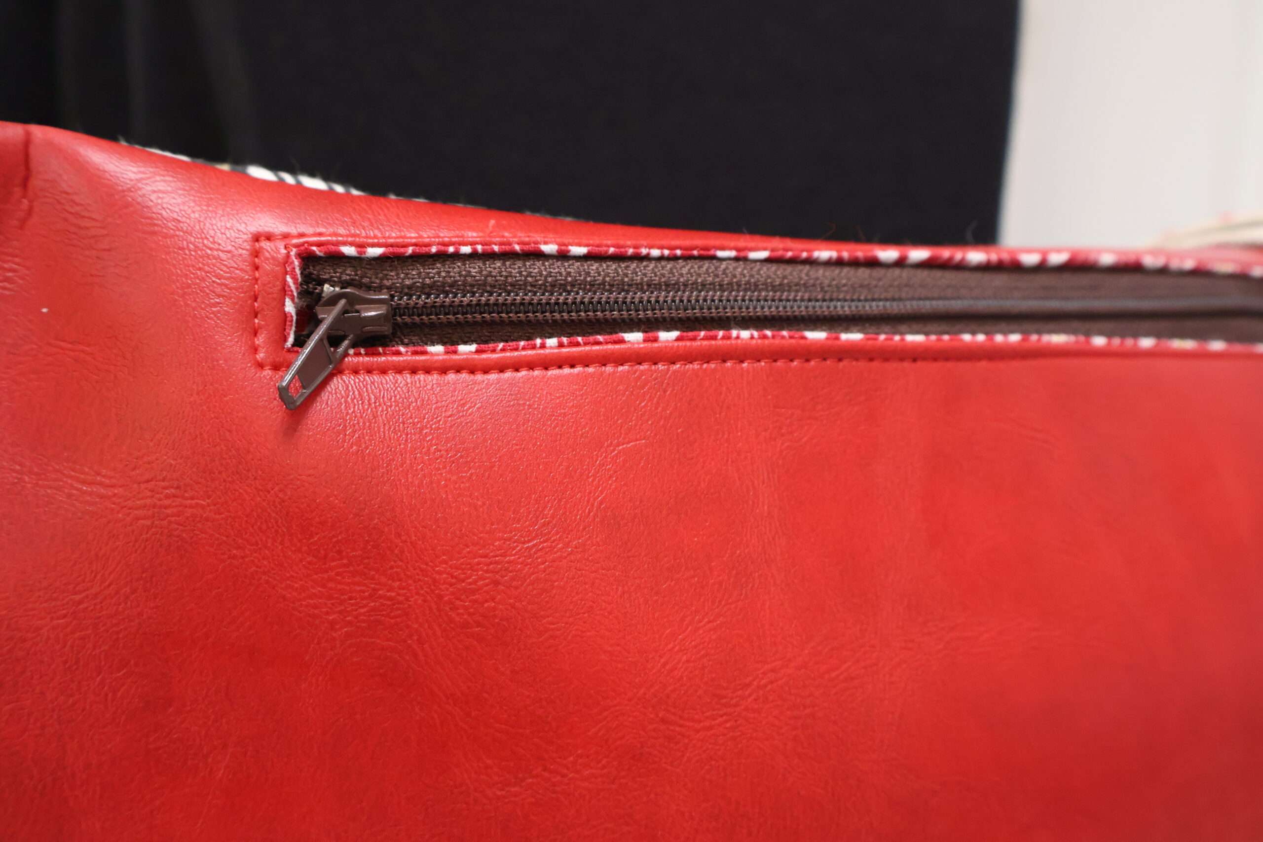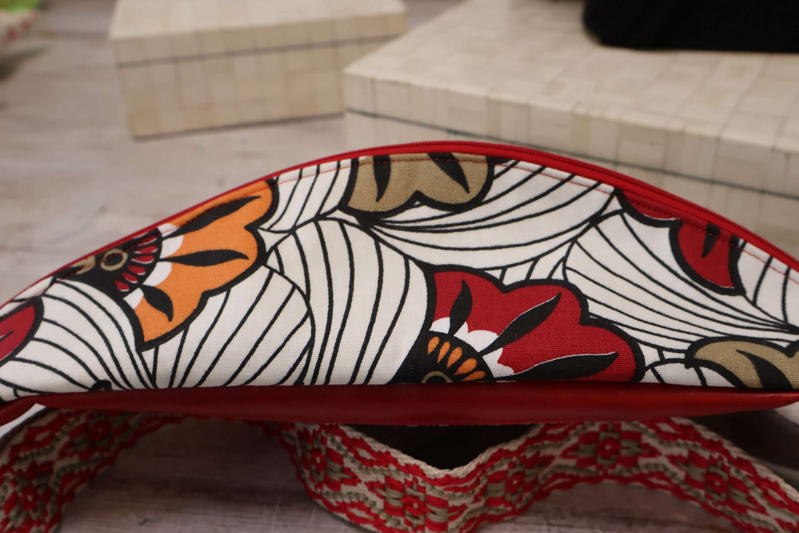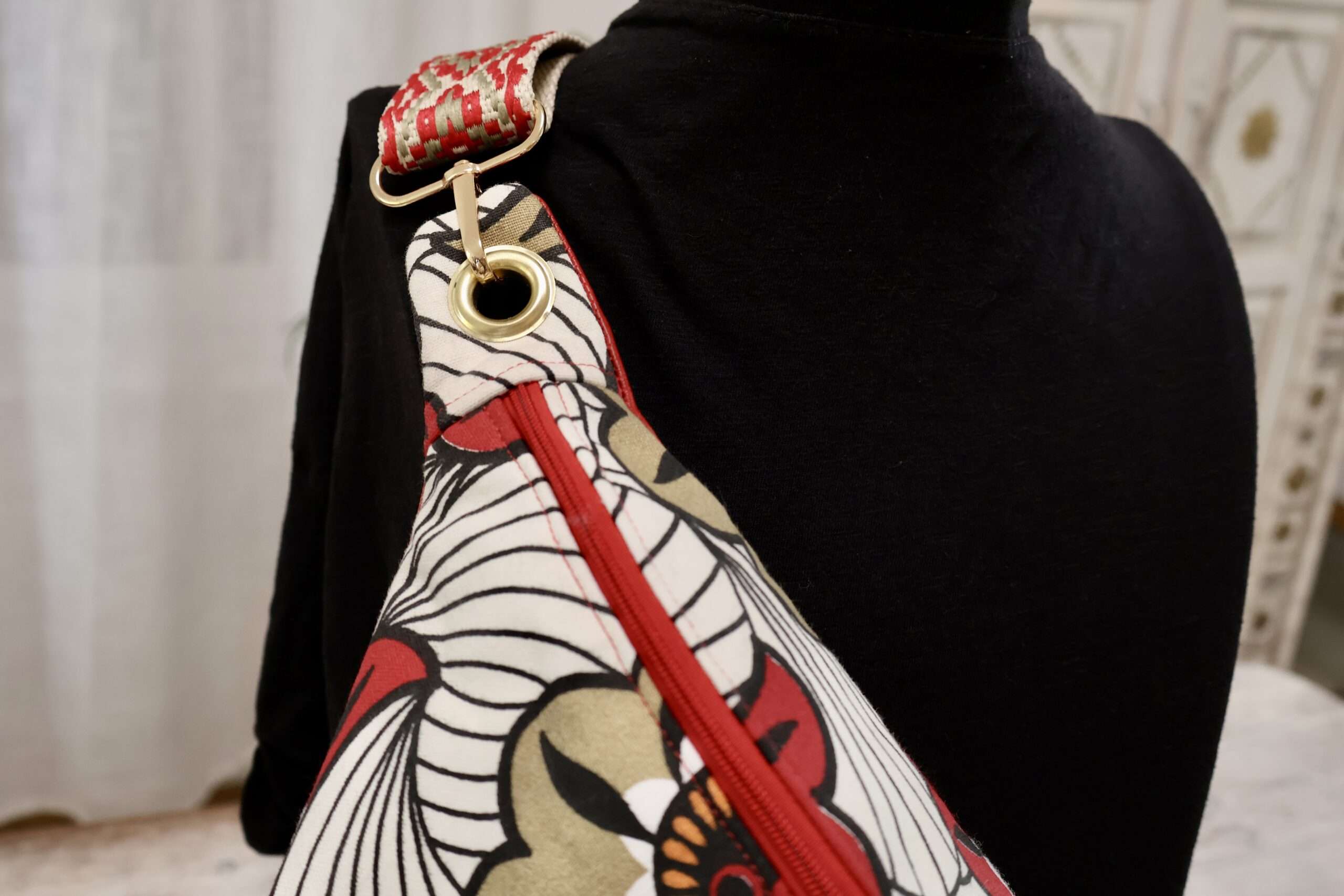 Sac Banana, format XXL grâce à ses dimensions généreuses, porté en bandoulière. Pratique avec sa grande poche zippée à l’arrière pour y ranger vos essentiels les plus précieux comme votre carte bancaire, passeport ou carte d’identité, smartphone. Dans le grand compartiment intérieur, vous y glisserez aisèment tous vos autres accessoires. Grâce à sa belle anse réglable, vous pouvez porter votre grande sacoche aussi bien sur un manteau épais que sur un tee-shirt léger. Une grande fermeture éclair ferme le sac Banane en toute sécurité. De superbes matières donnent tout son style et son originalité à ce sac Banana. Devant, un riche coton aux imprimés Afrique est associé à un lumineux simili cuir rouge à l’arrière. La doublure intérieure est en coton imprimé. Fabrication artisanale française, Pièce Unique. Un sac Banana qui a de la classe !