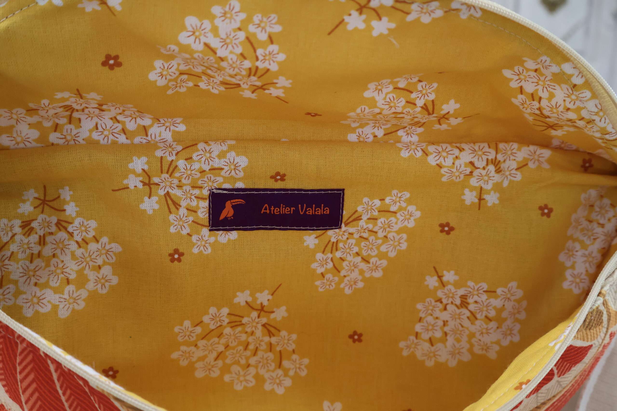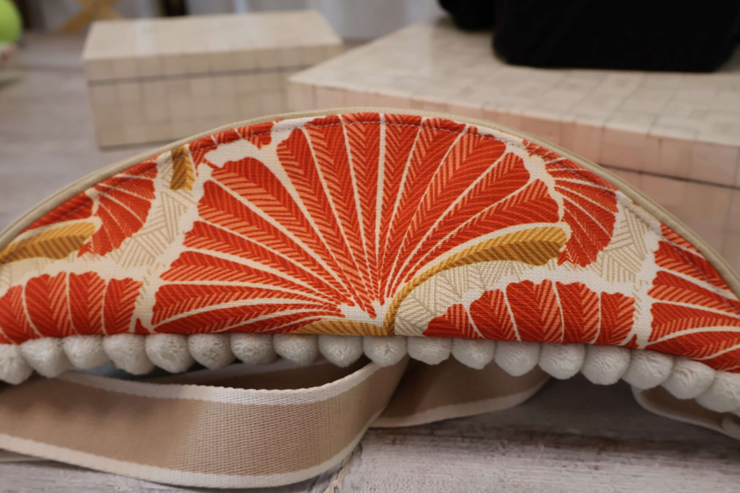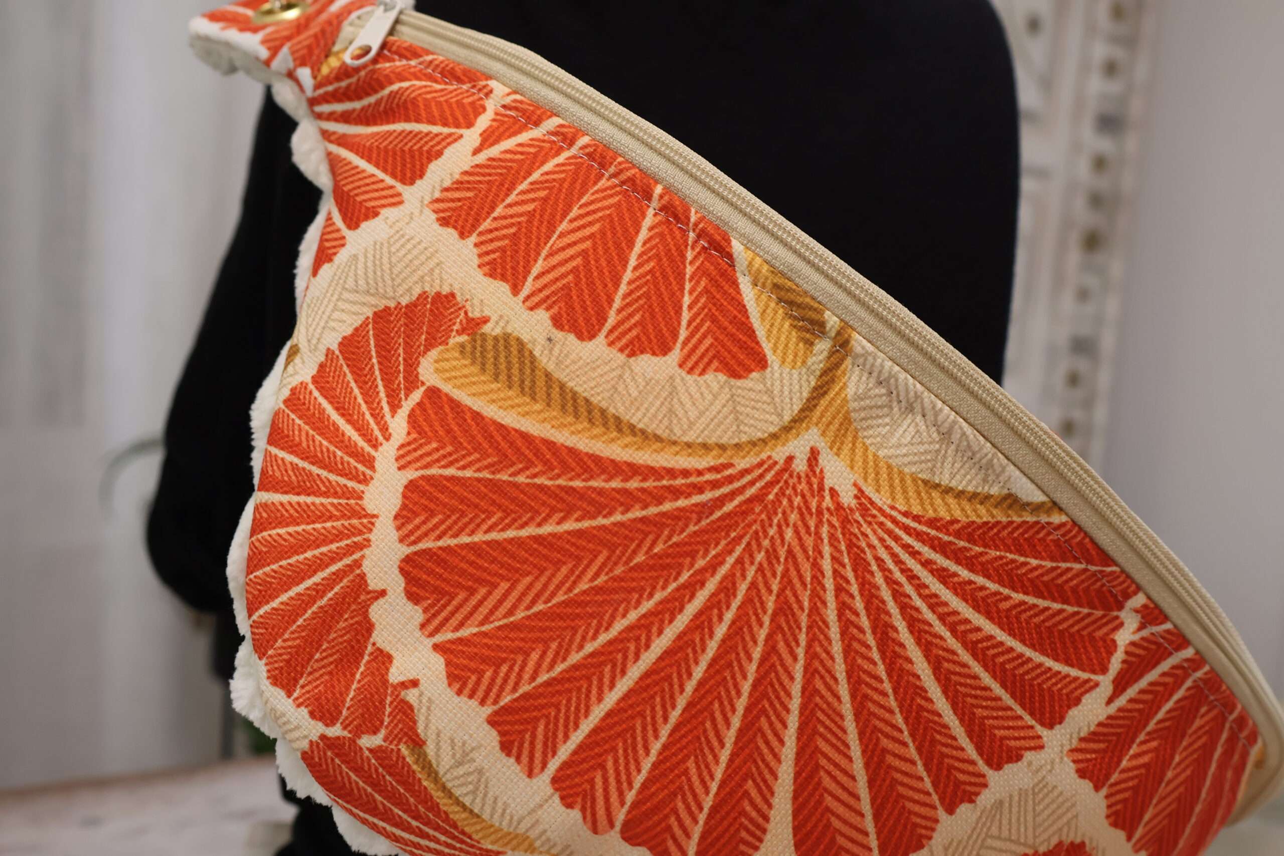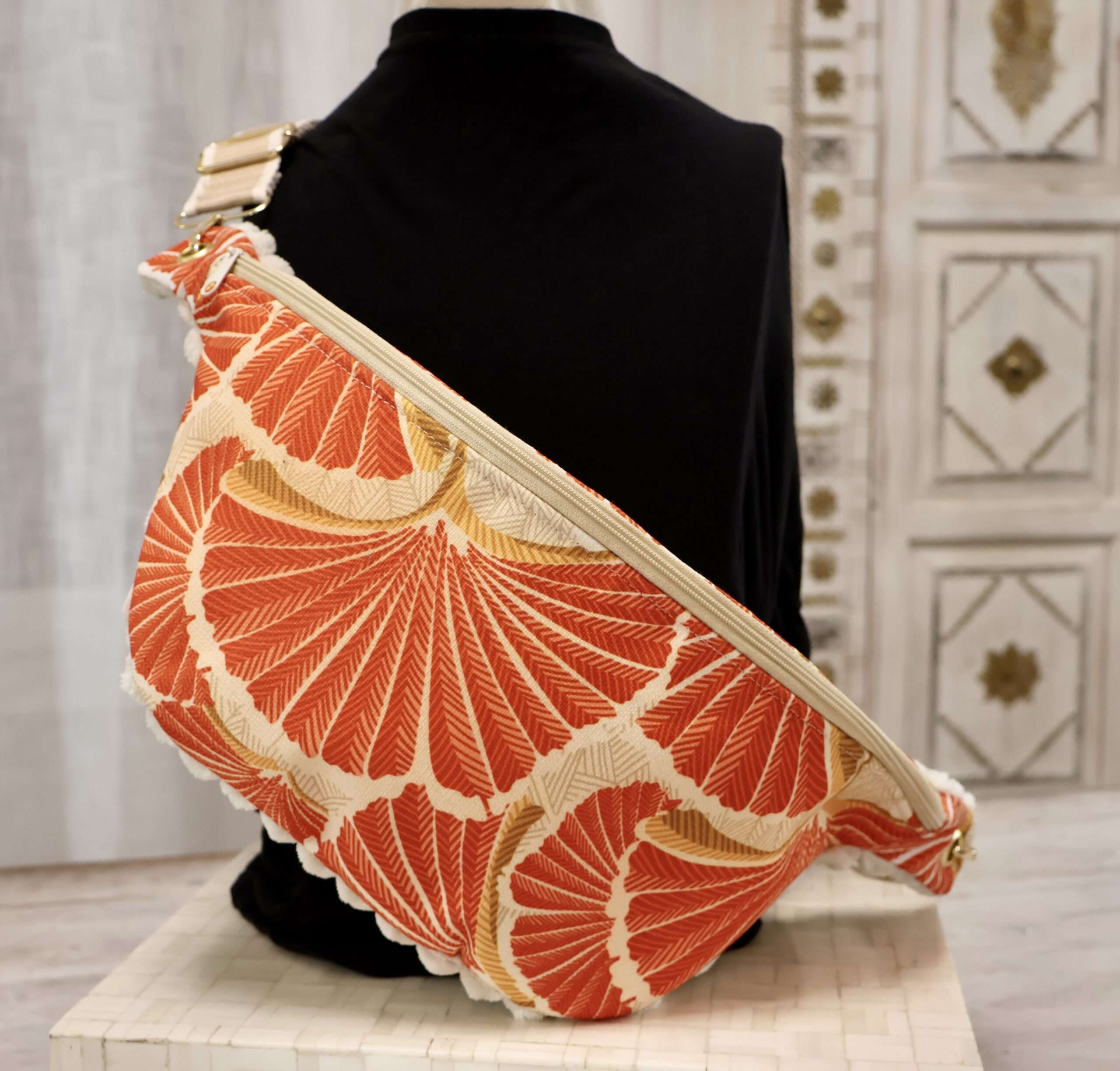 Un grand sac Banane, porté essentiellement en bandoulière, avec 2 grandes poches, chic et original grâce à l’association d’un lumineux coton aux imprimés Orange et d’un tissu velours côtelé épais.