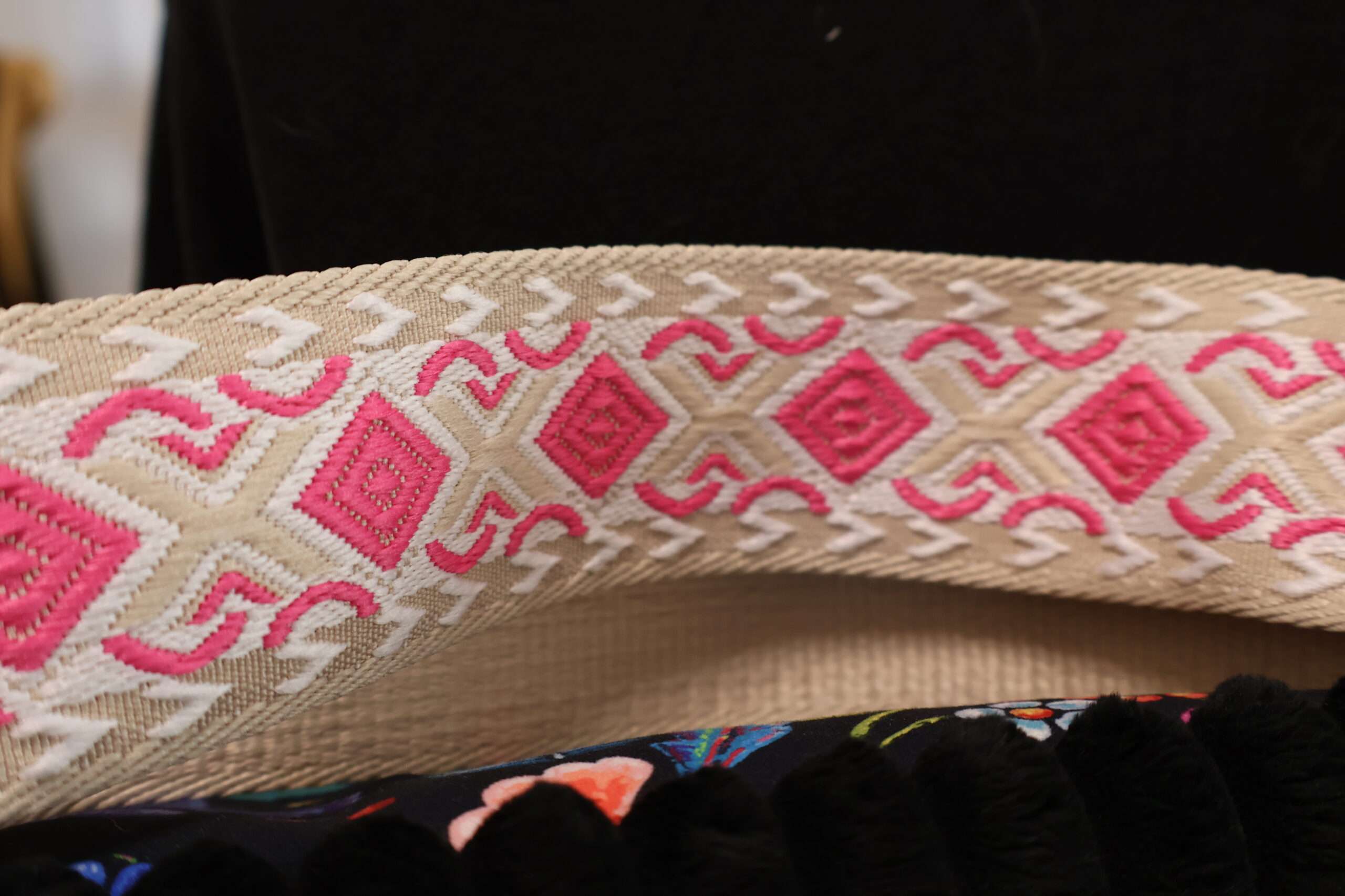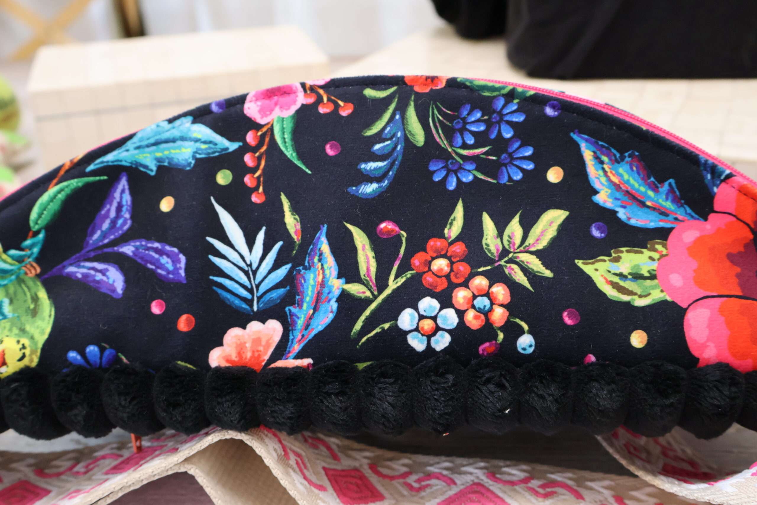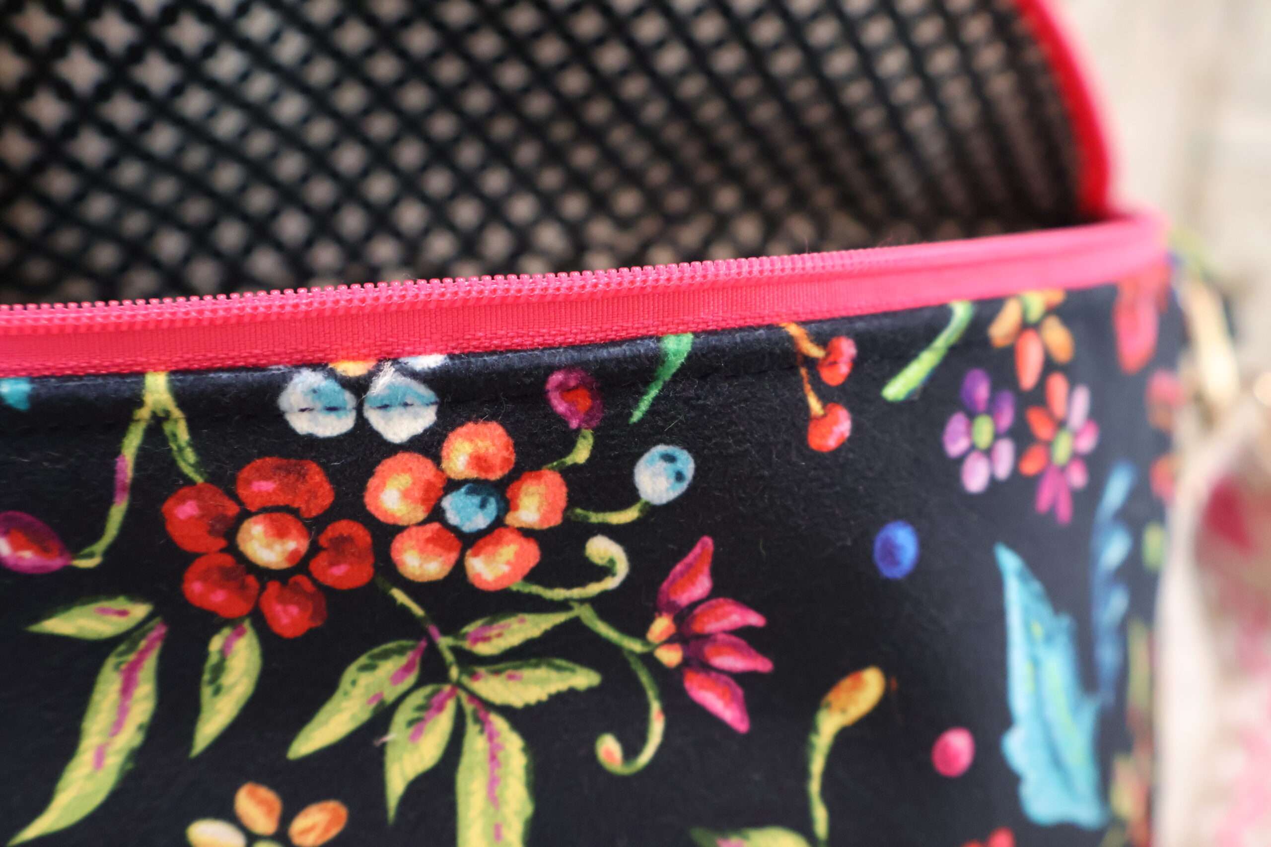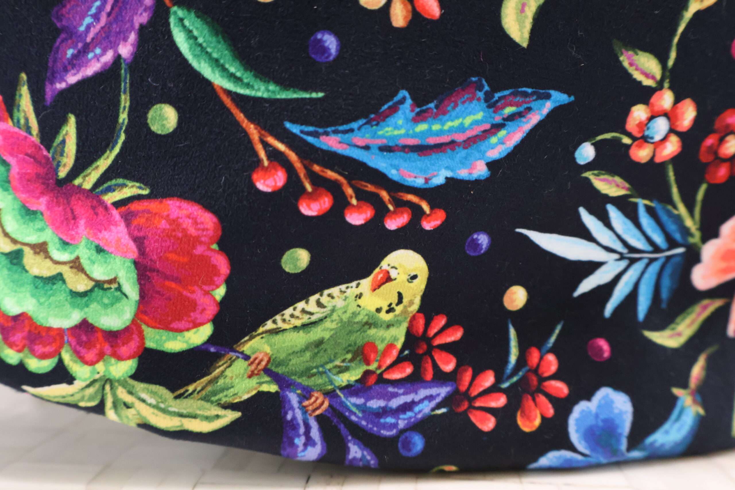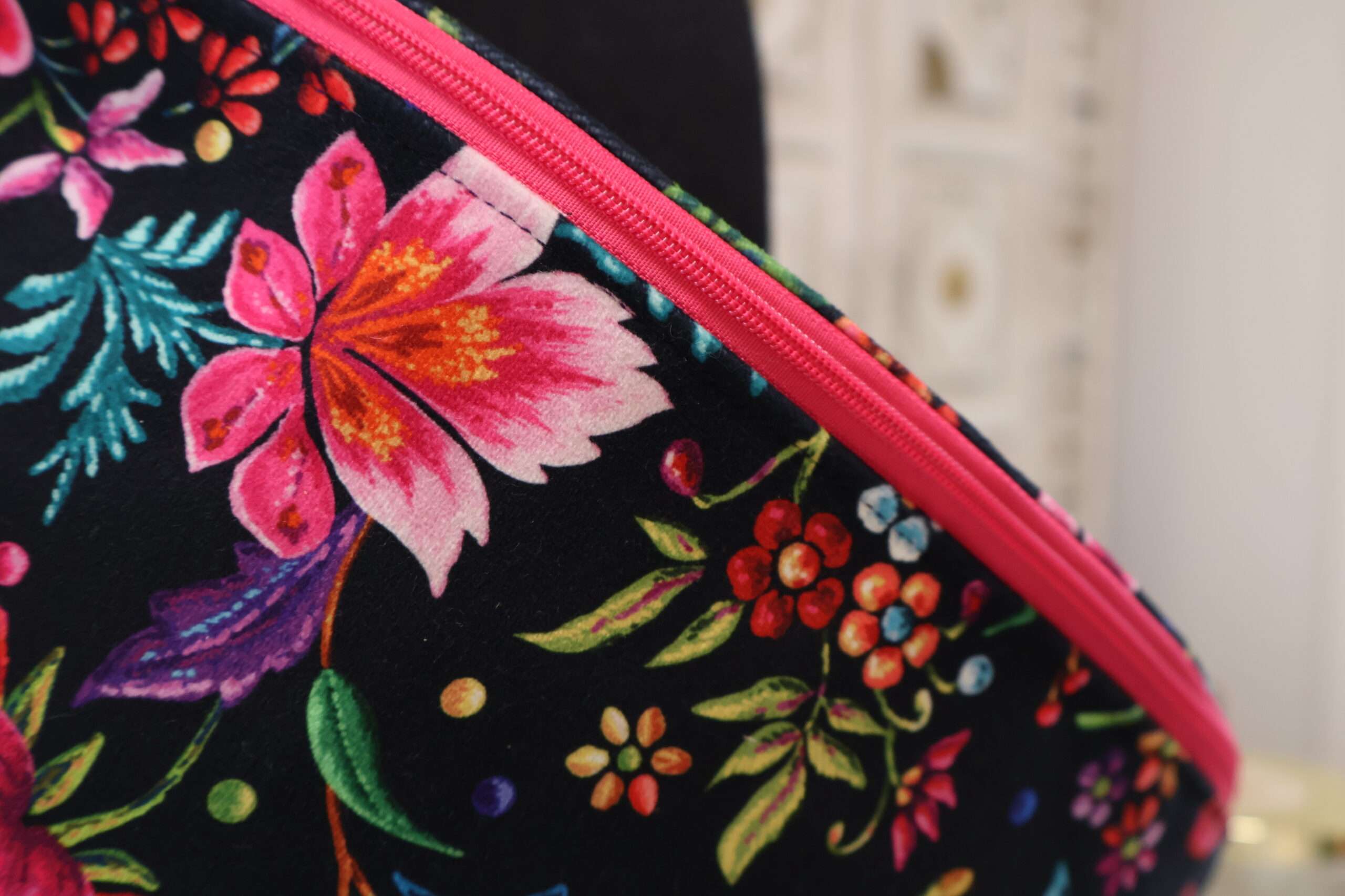 Un grand sac Banane, porté essentiellement en bandoulière, avec 2 grandes poches, chic et original grâce à l’association d’un riche velours français aux motifs colorés avec un velours noir côtelé.