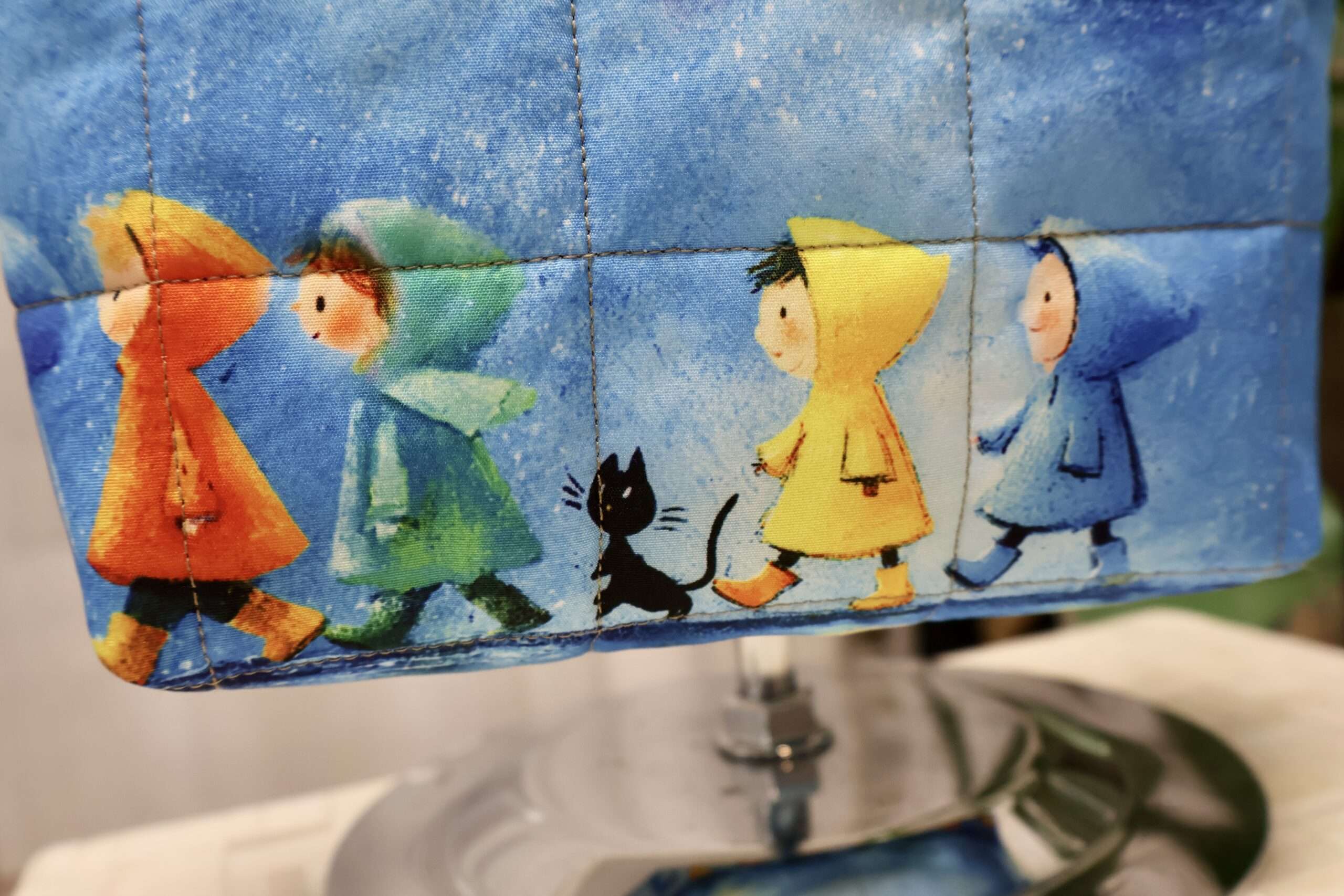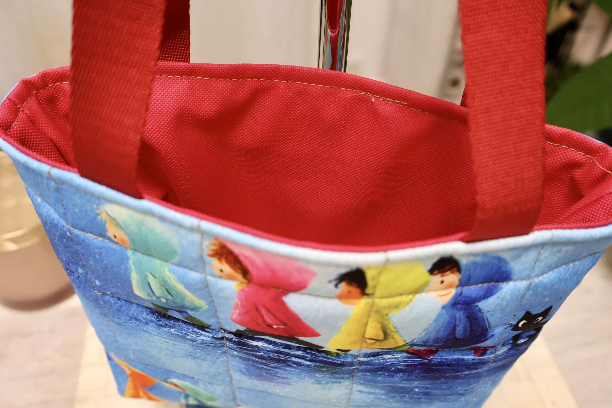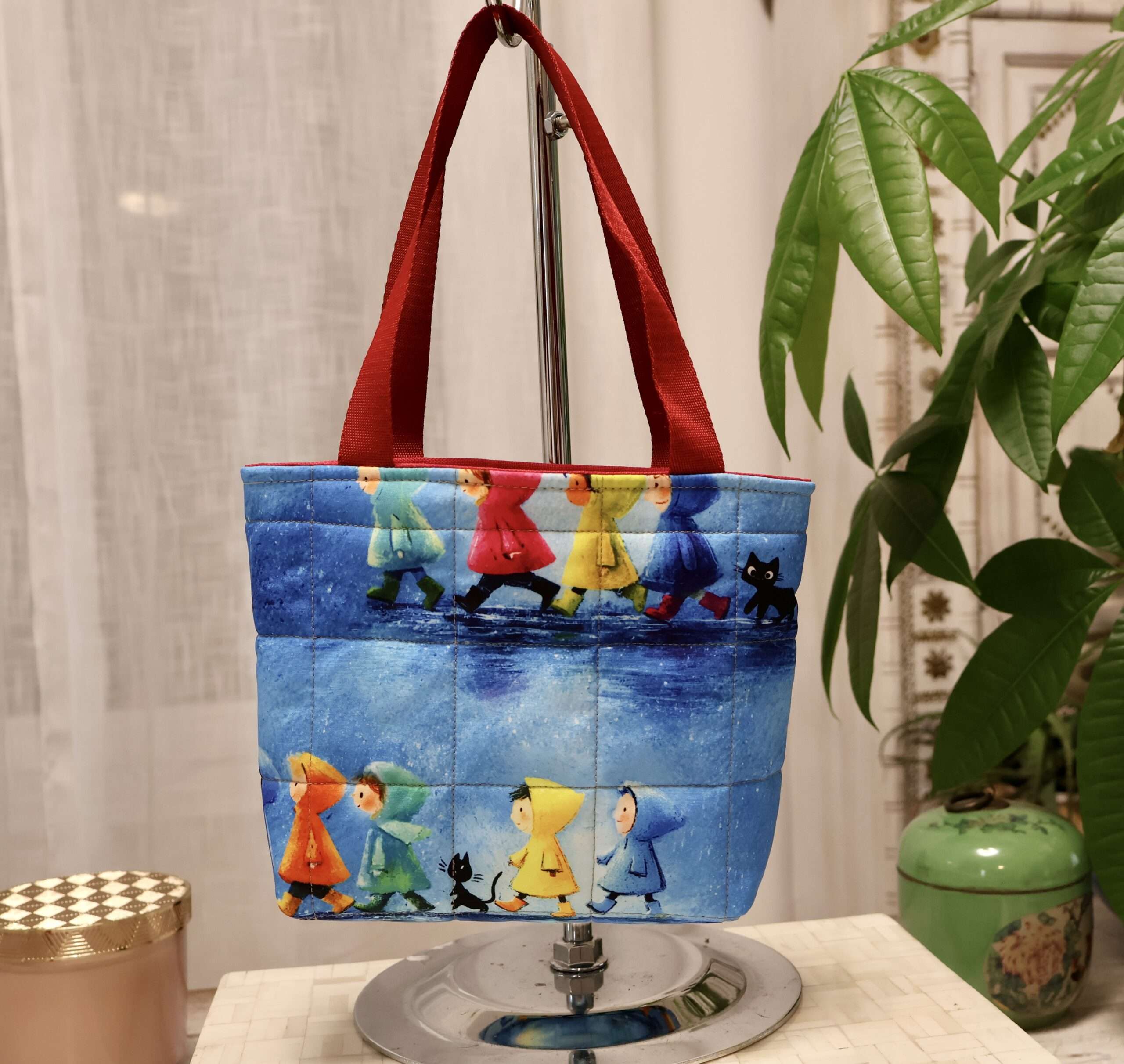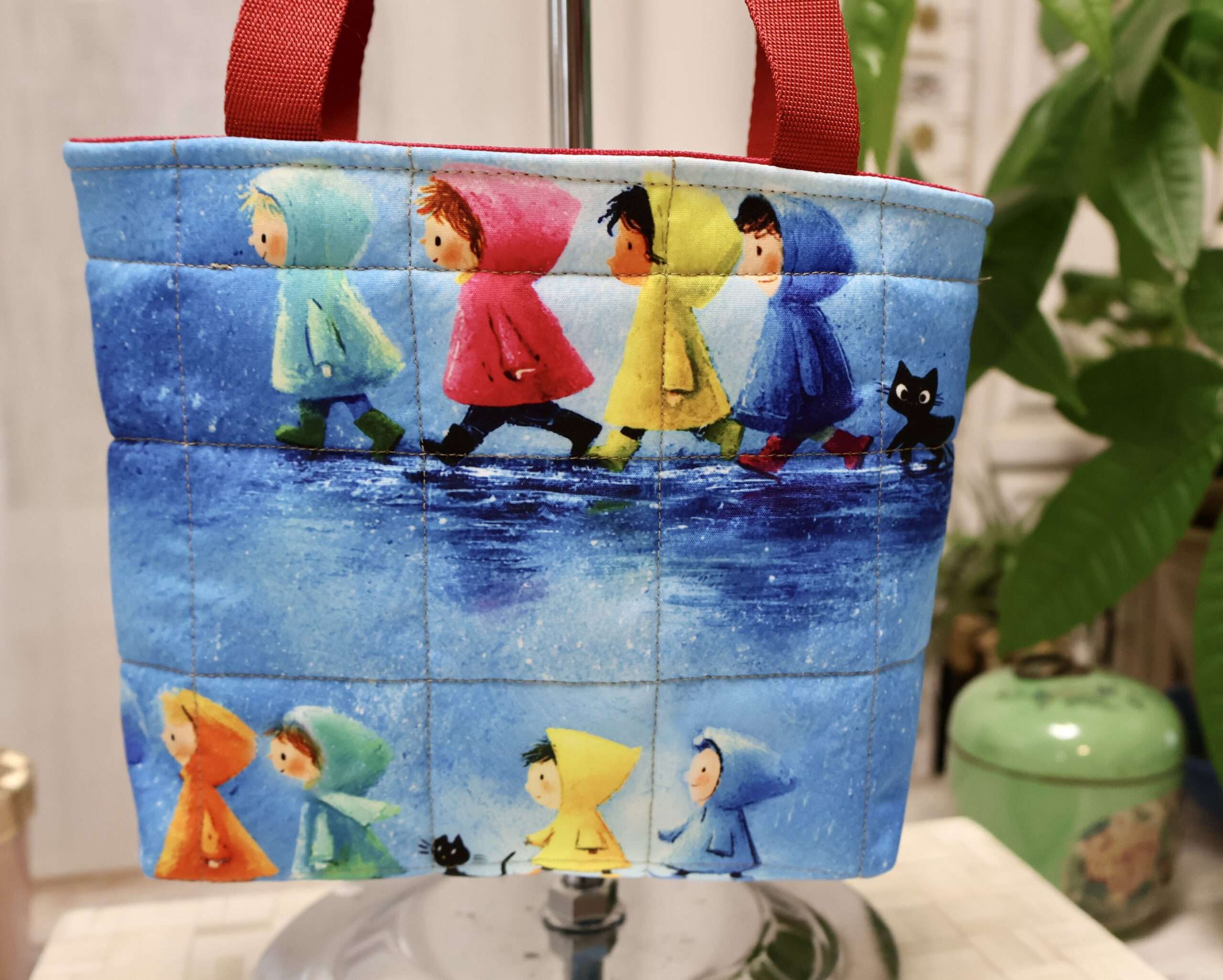 Ce petit modèle de sac cabas est un bijou pour les enfants qui veulent faire comme les grands. Son compartiment unique est suffisamment grand pour emporter un doudou, une petite pochette et d’autres trésors. Ses dimensions: Largeur 20cms, Hauteur 17cms, Profondeur 6cms. A l’extérieur, un adorable imprimé en coton figurant d’adorables enfants et chats sous la pluie fait craquer! Ce joli tissu a été travaillé pour donner un effet matelassé. La doublure intérieure est un polyester déperlant, aucune crainte de le tâcher, il se nettoie facilement. Les anses sont en polyester solide. Ce sac est léger. Il pourra être porté à l’épaule ou à la main par les enfants. Un « petit sac » pour faire plaisir aux plus petits! Fabrication artisanale française, Pièce Unique.