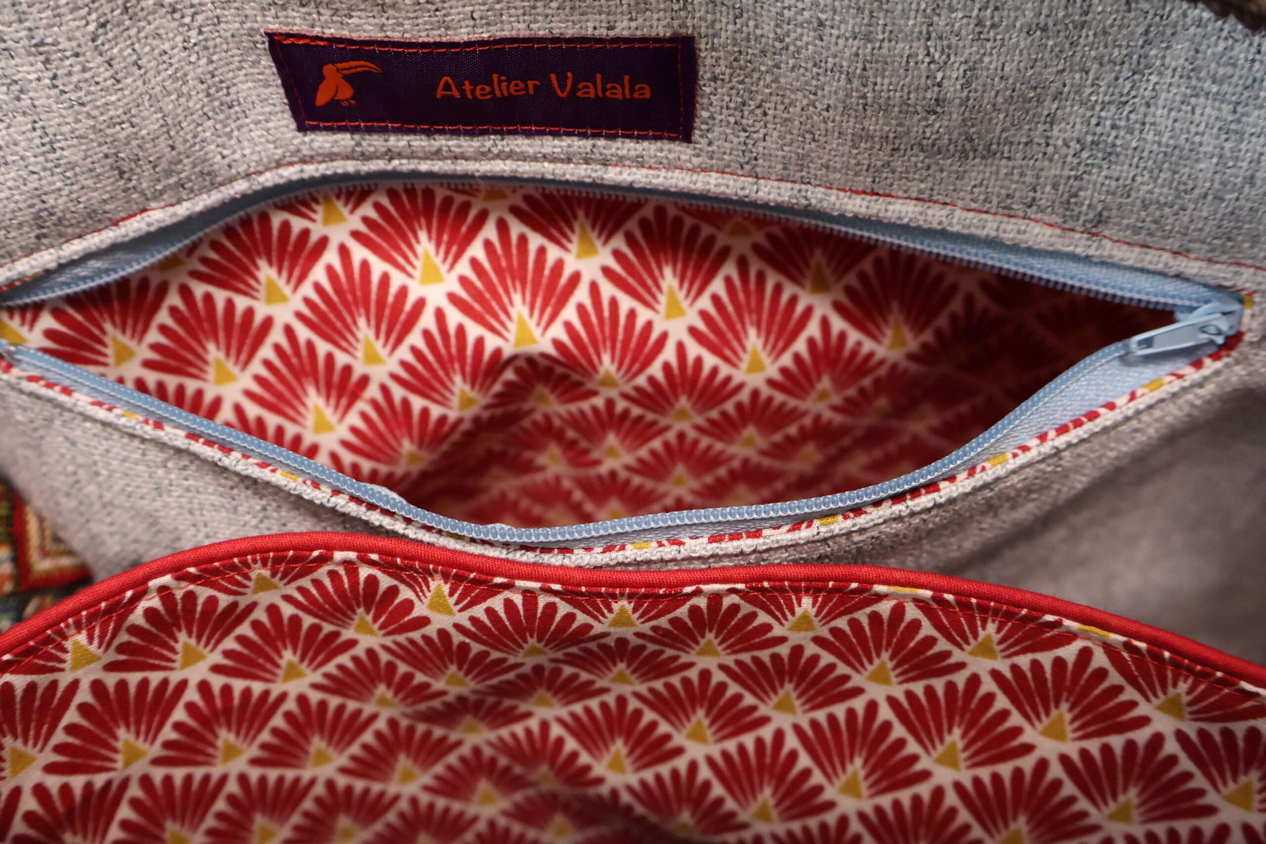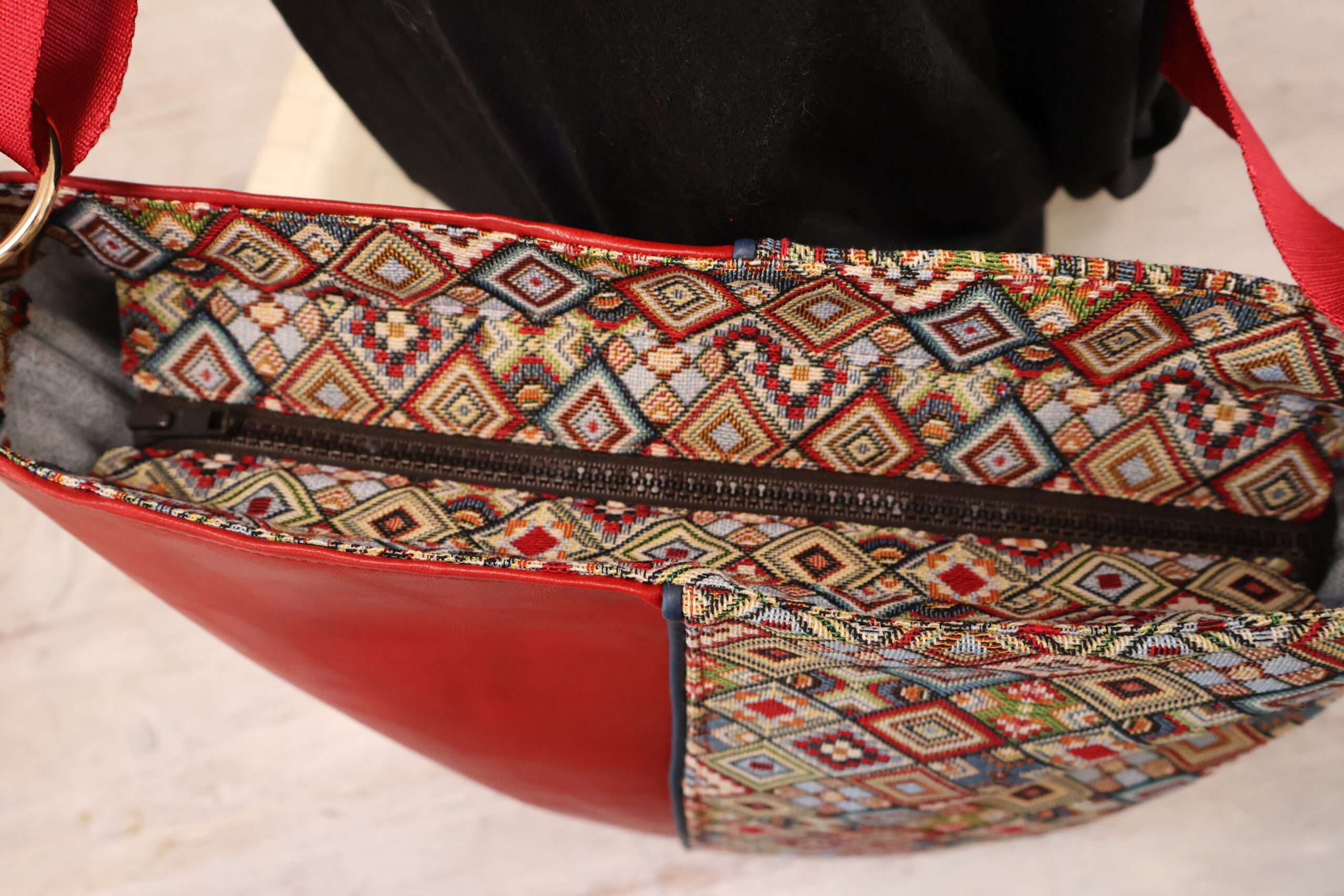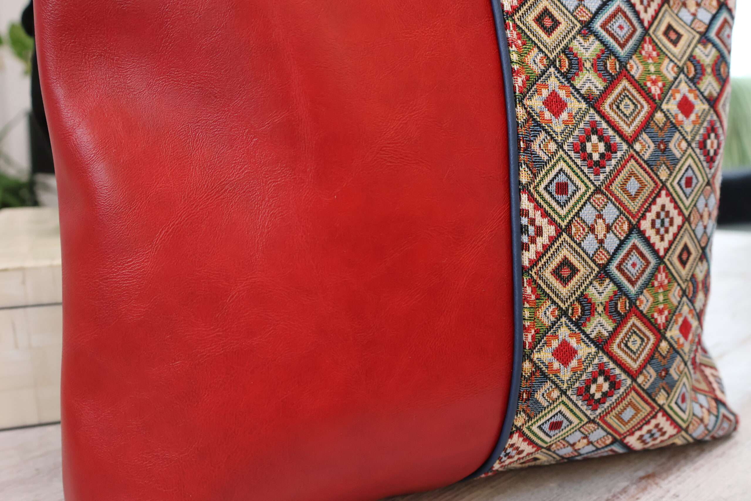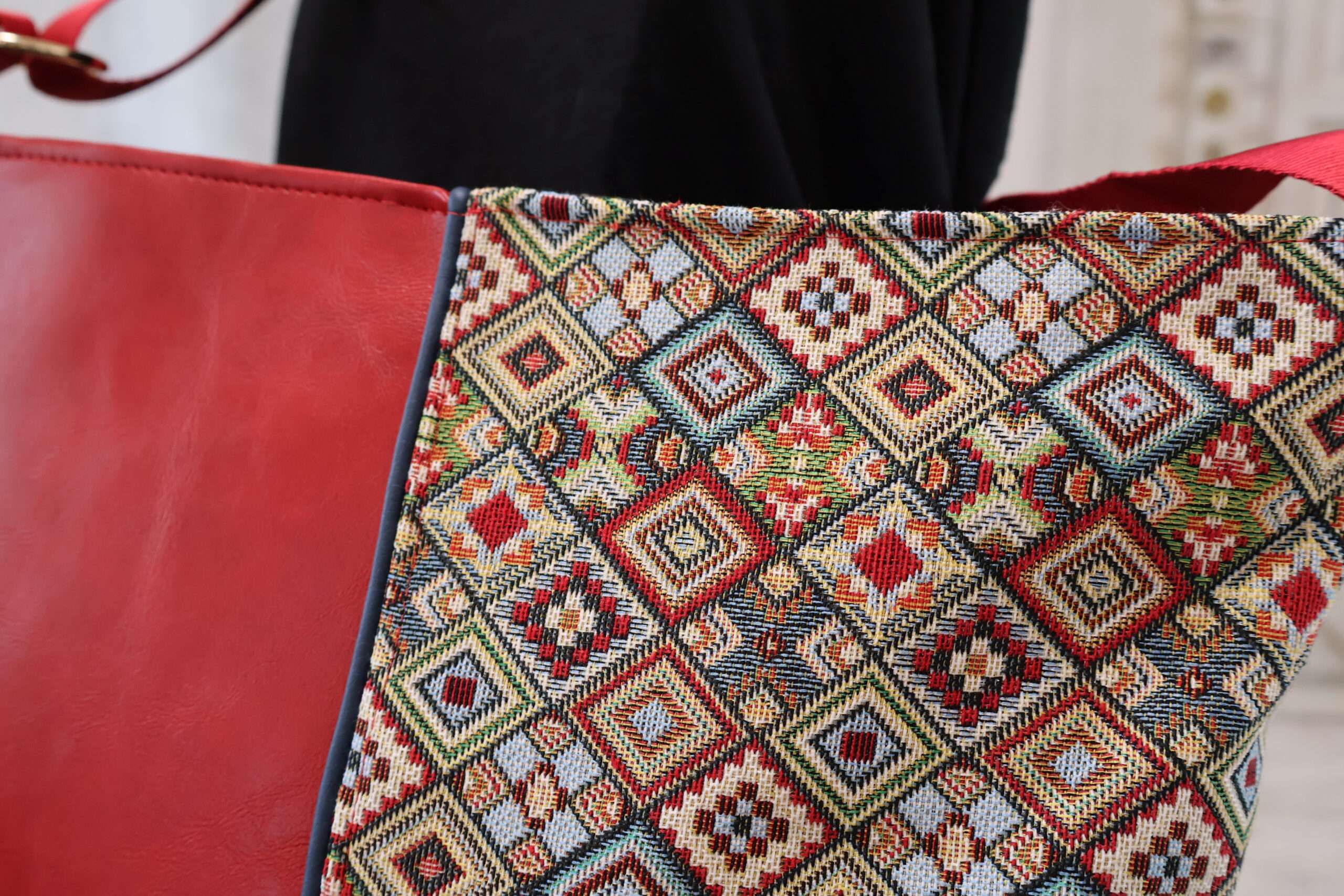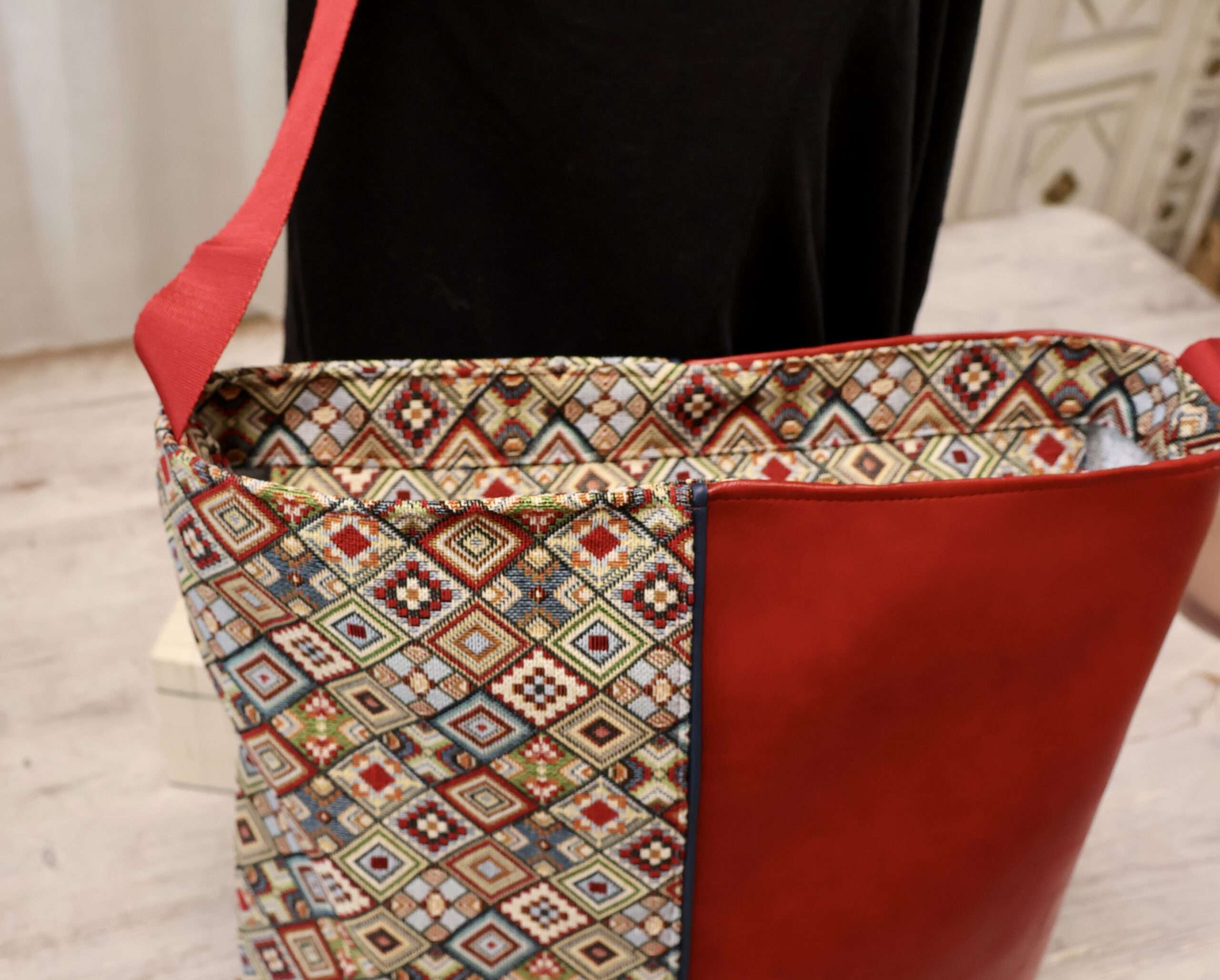 Un grand sac très chic, porté à l’épaule ou en bandoulière, original et luxueux grâce à son jacquard imprimé et son lumineux simili cuir rouge, avec de beaux volumes de rangement intérieur.
