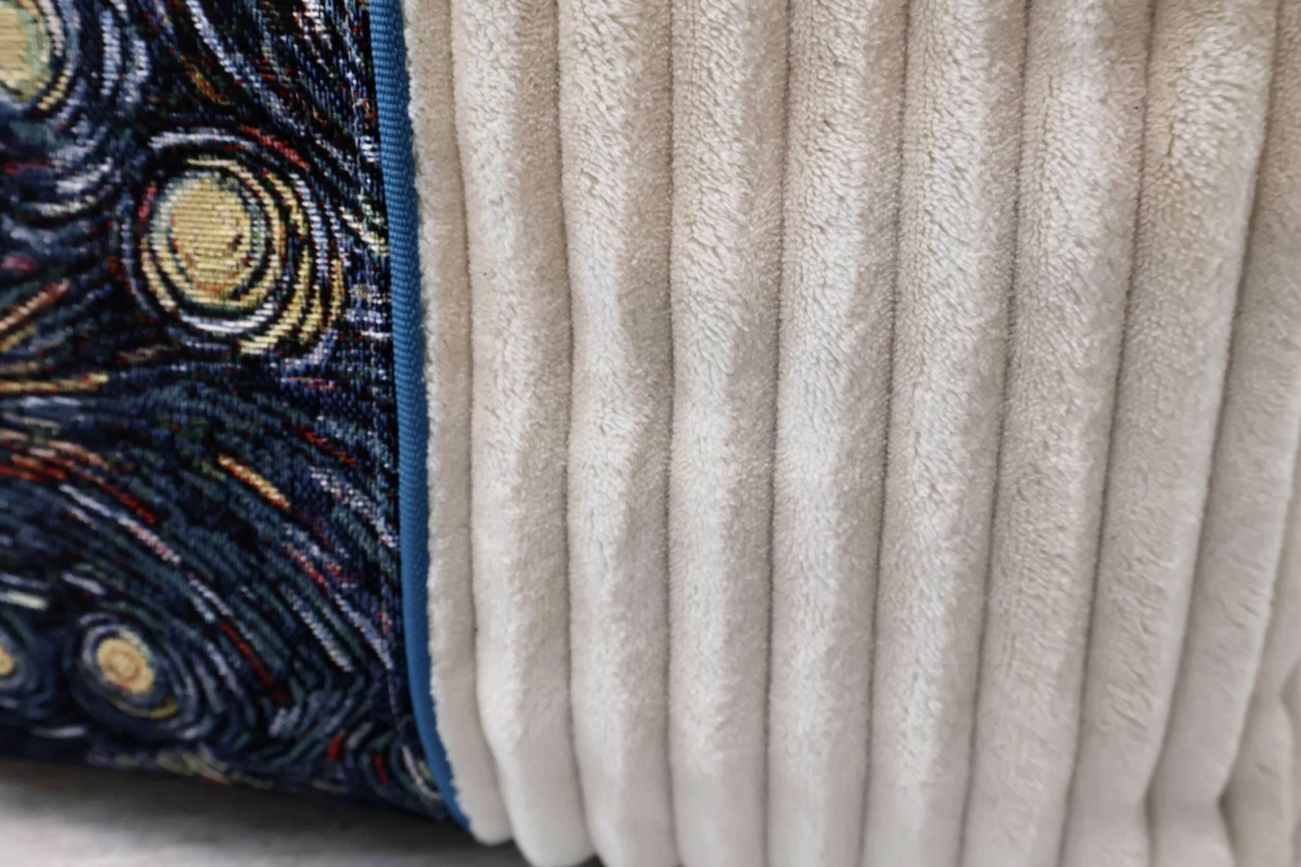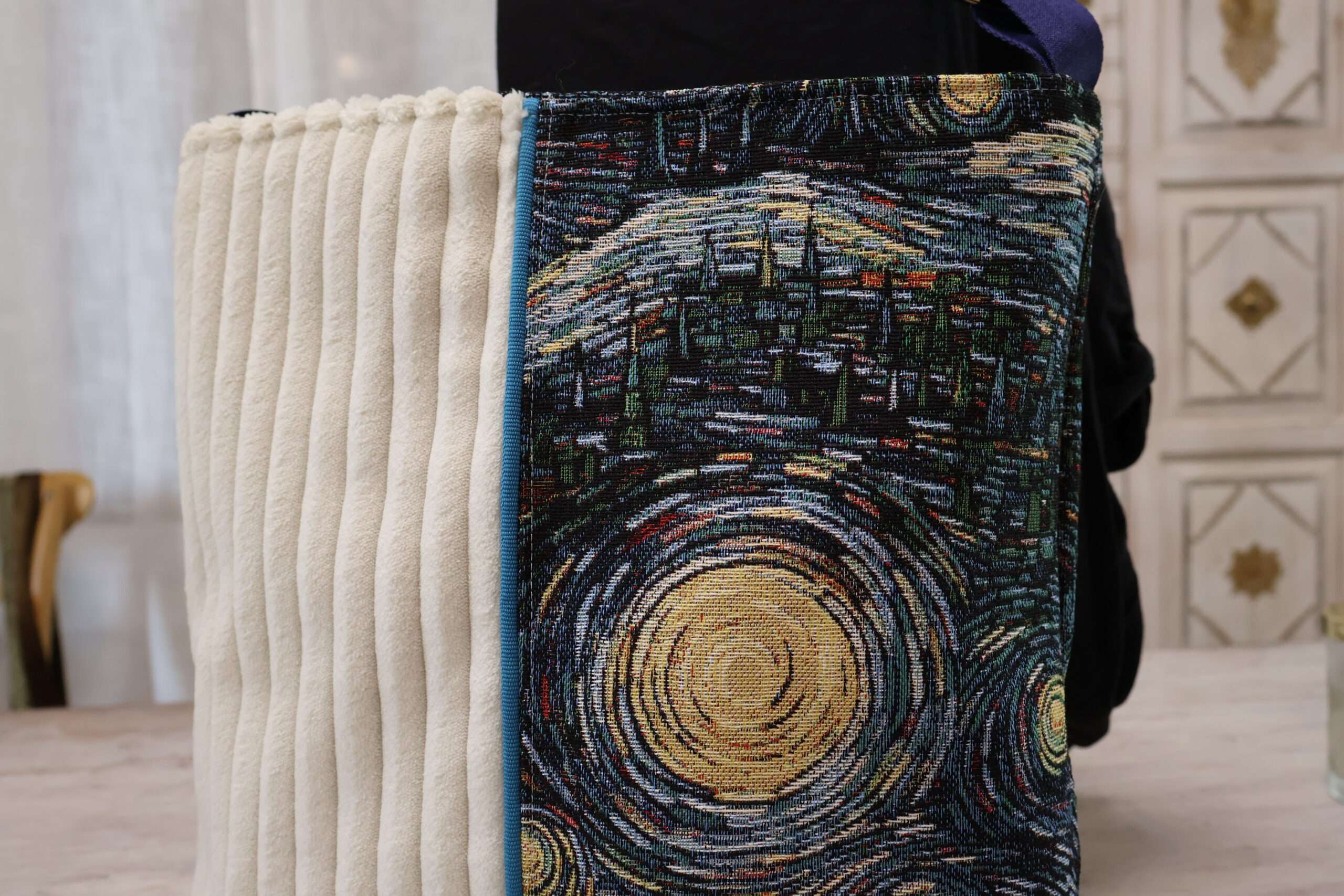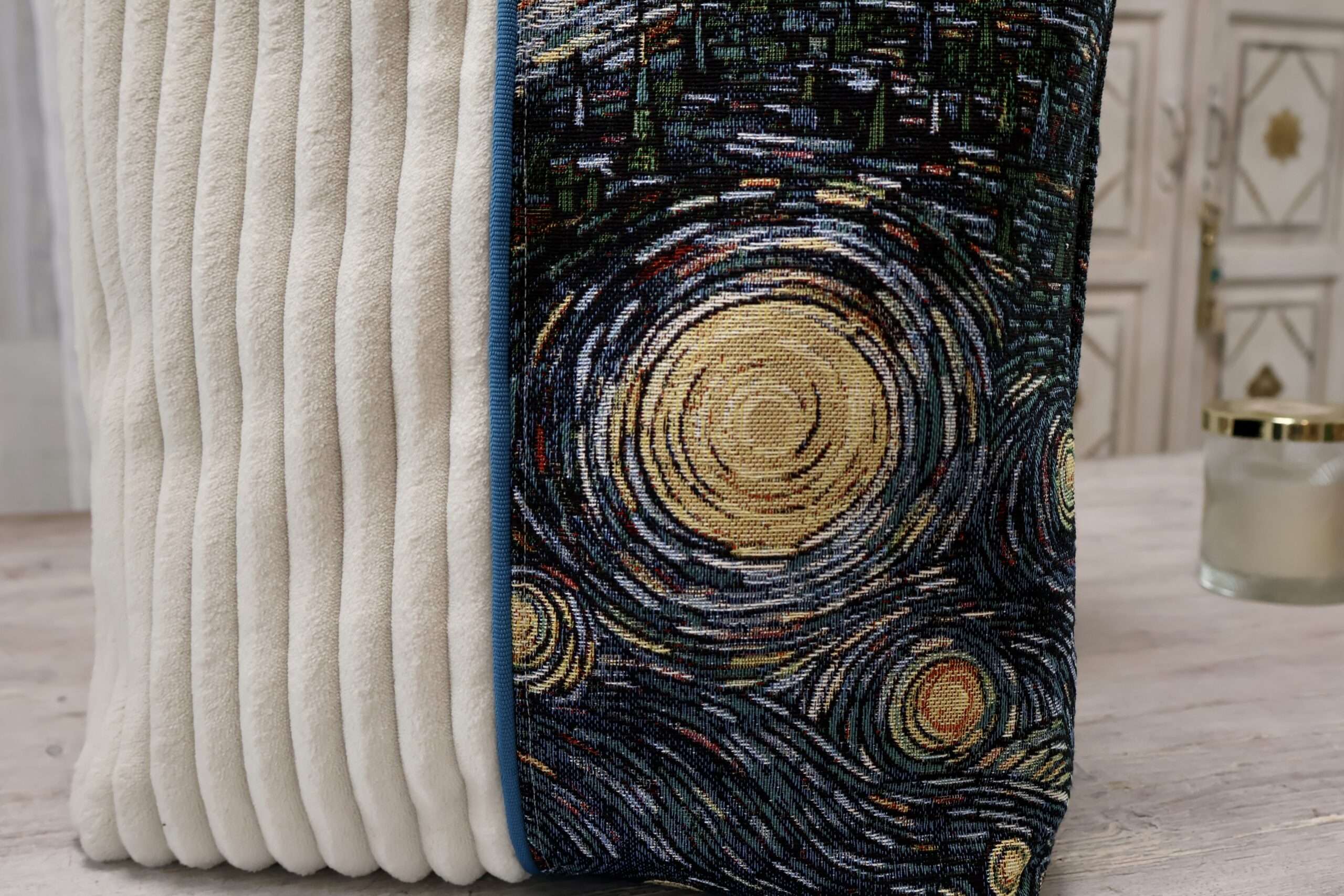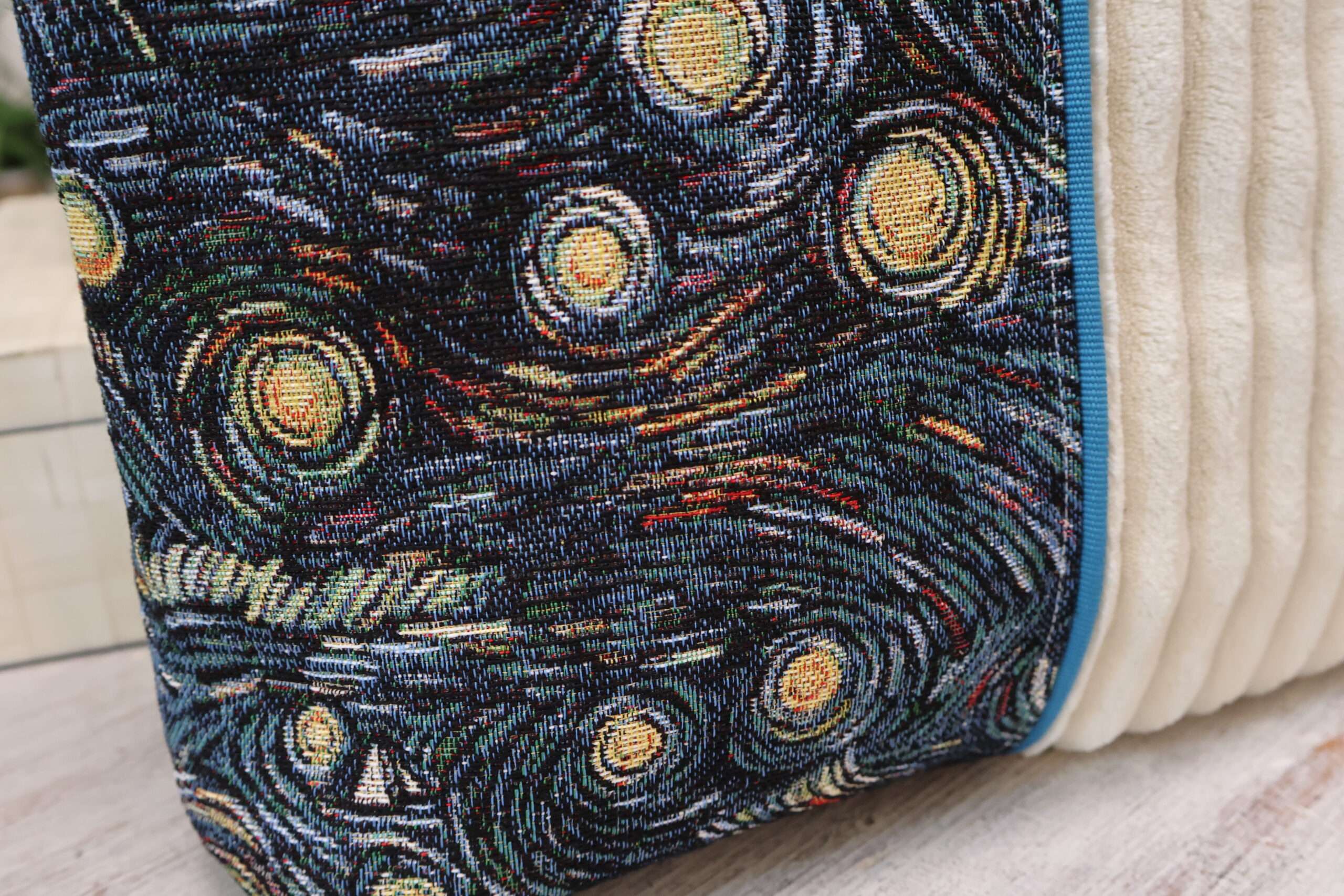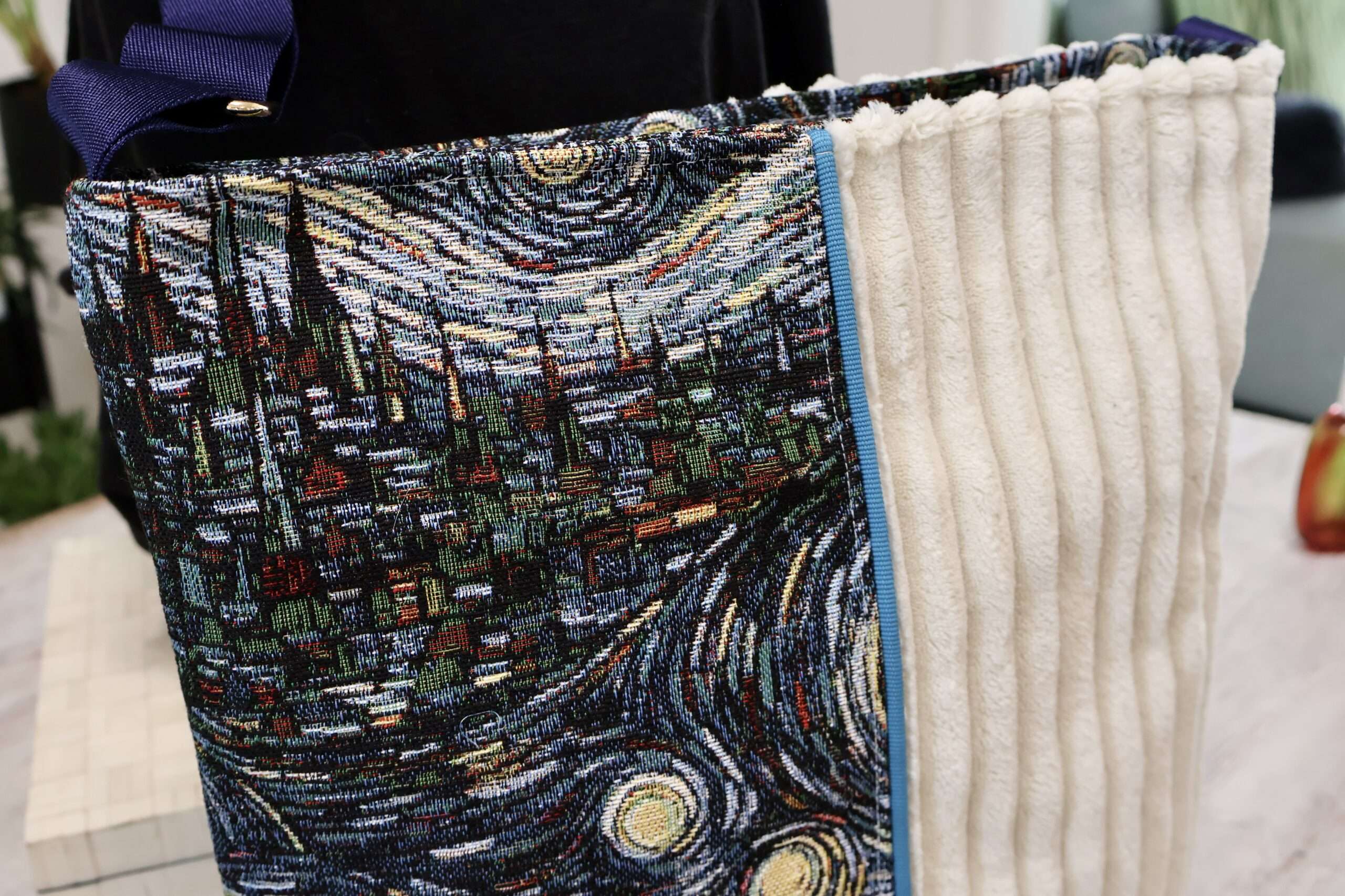 Pratique et chic, ce grand modèle de sac Hoplala, de forme légèrement allongée, permet de transporter toutes vos affaires, même les plus volumineuses. A l’intérieur une grande poche ouverte, une longue poche zippée et un très grand compartiment donnent de nombreuses options de rangement, pour un ordinateur, des documents A4, ainsi que vos accessoires les plus précieux bien calés dans les poches. Grâce à sa sangle réglable, il se porte facilement à l’épaule ou en bandoulière. Une grande fermeture éclair ferme le sac en toute sécurité. De superbes matières donnent tout son style et son originalité à ce sac: à l’extérieur un sublime tissu jacquard épais imprimé d’une nuit étoilée façon Van Gogh, associé à un très doux velours côtelé beige clair, à l’intérieur un jean bleu marine facilement lessivable à la main. Ce sac est le compagnon idéal pour vos journées de balade, de courses ou de travail. Fabrication artisanale française, Pièce Unique.